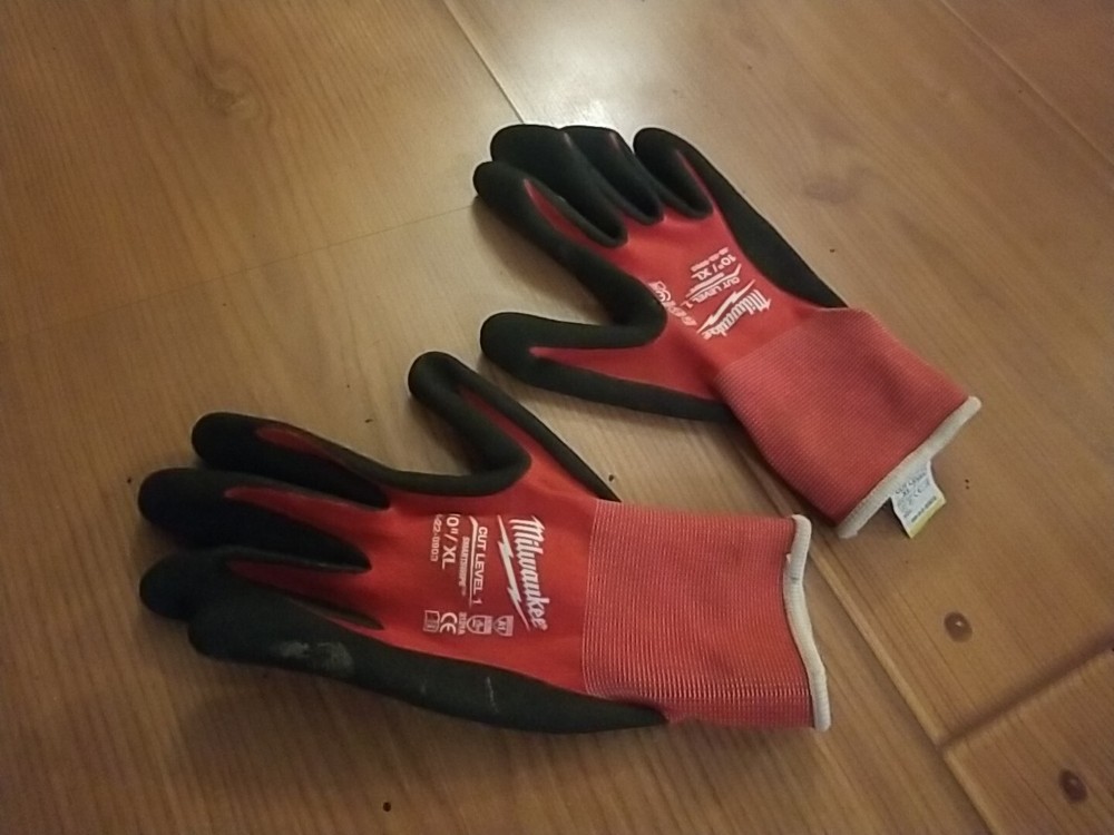 This pair of Milwaukee work gloves in size XL features a nylon-dipped design with Nitrile rubber material for durability and grip. The gloves are in red color and are suitable for personal protective equipment in industrial and maintenance settings. Small stain from warehouse shipping but new rubber smell