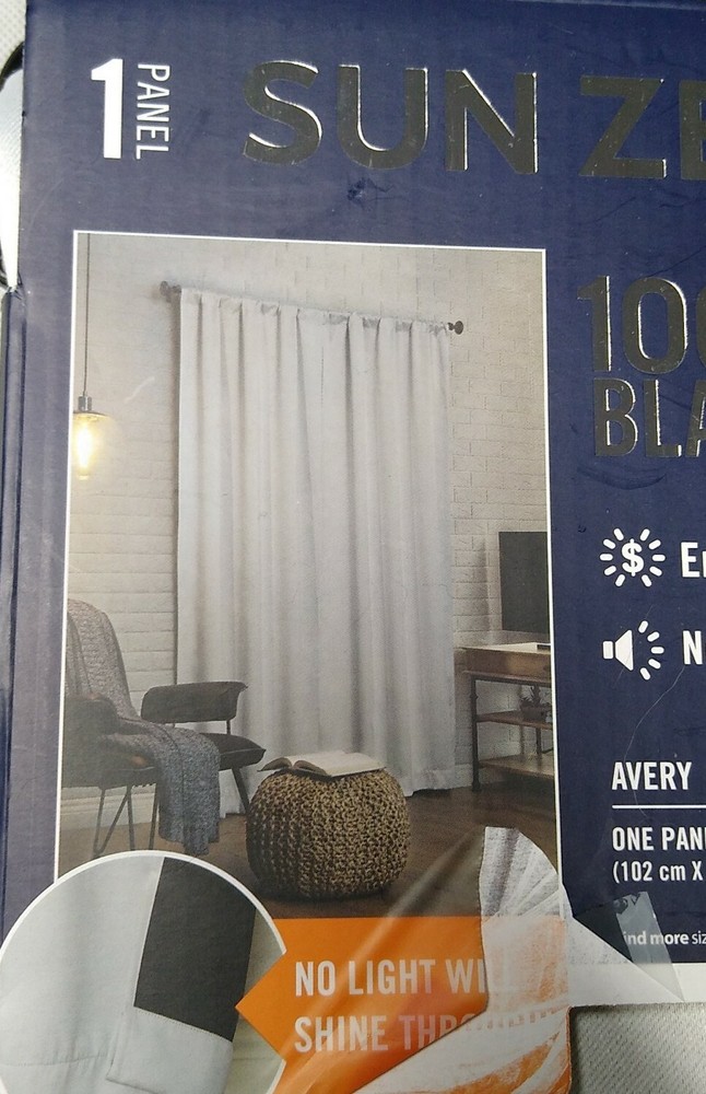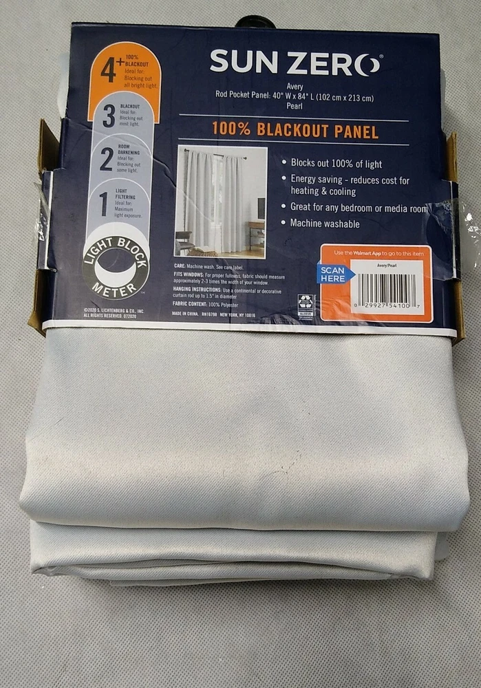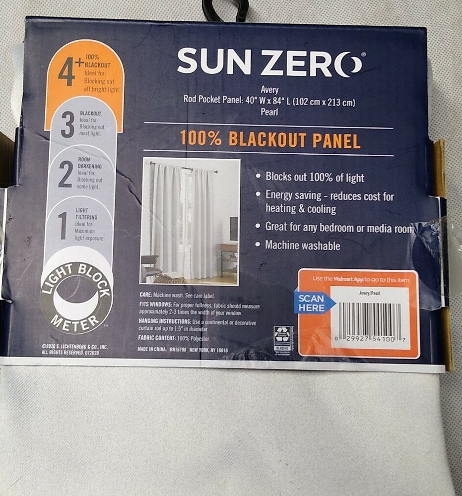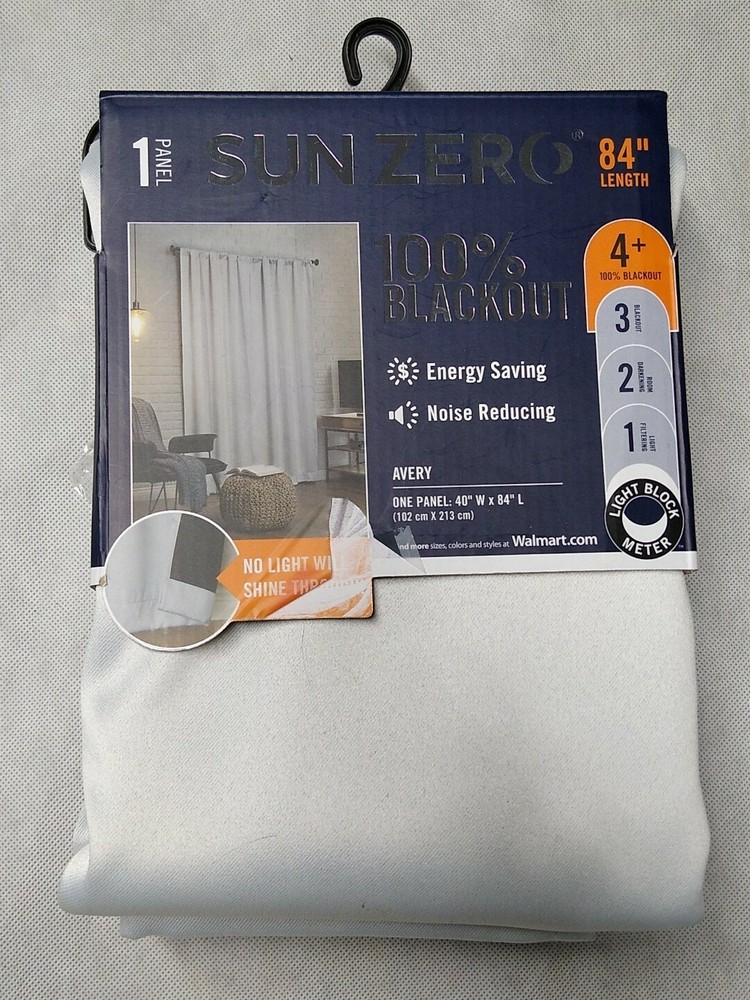 1 Panel Sun Zero 100% Curtain š Shipping. The curtain is new open box is one panel. The panel measures 40" wide x 84" Long. Is light gray silver in color. The curtain is designed for energy saving, noise reduction in 100% black out of the Sun. See photos details and better description. Free shipping with USPS mail. Ee