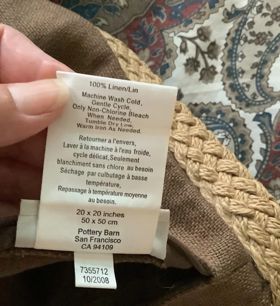 1 Pottery Barn 2008 chocolate beige 100% Linen Jute braid pillow sham 20"x20" SIZE: square 20" x 20" CONDITION: great used -- great used no holes rips tears-- some minor spots & minor wear for its age see photo DON'T FORGET TO CHECK MY OTHER LISTINGS E-MAIL ME IF YOU HAVE ANY QUESTIONS? PAYMENT MUST BE RECEIVED WITHIN 3 DAYS AFTER AUCTIONS HAVD ENDED I WILL BE SHIPPING MONDAY THRU FRIDAY THANKS FOR STOPPING BY - POSITIVE VIBES! :)