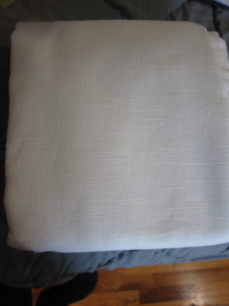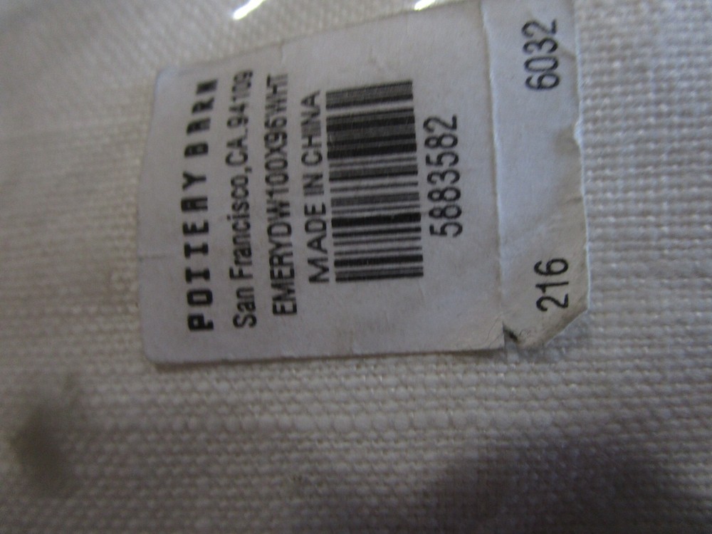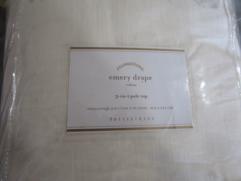 Up For Auction is- 1 Pottery Barn EMERY LINEN DRAPE panel 100 96 white doublewide New w tag The soft texture of our Emery Linen Drape brings a casual warmth to the room. Yarn-dyed, this drape is made with two differently colored threads, creating soft, subtle texture. Made of a 73% linen and 27% cotton blend; with flax fibers imported from France. Detailed with blind-stitched hems.. Our curtain’s 3-in-1 construction offers three hanging options: rod pocket, back tabs, ring top Dry-clean. Sold as individual panels. Imported. Smoke and pet free home.