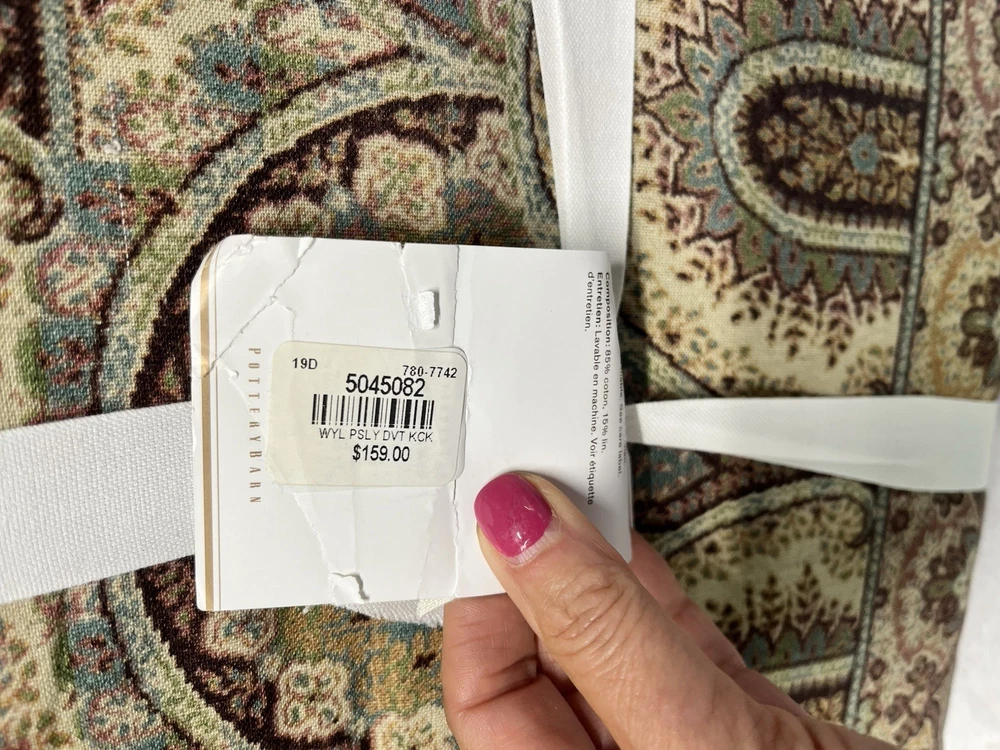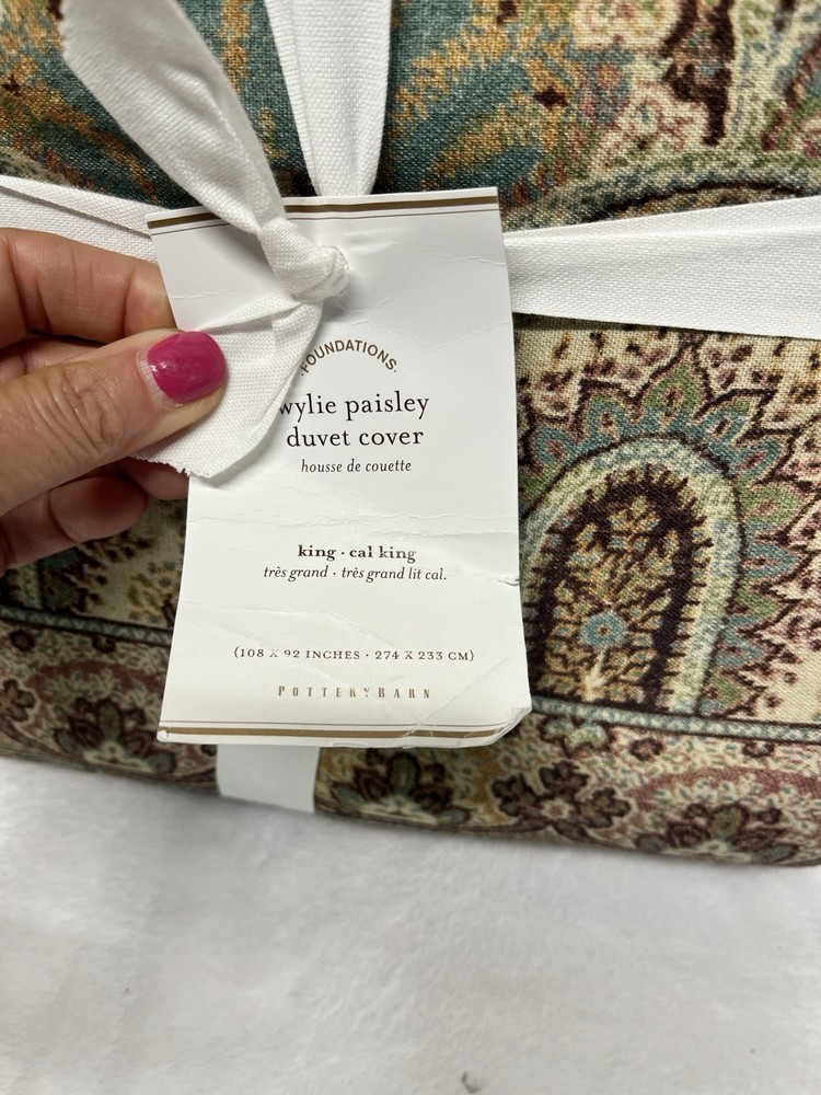 Brand New Retails for $159.00 + tax so getting a great deal here You are getting 1 King/California King Size Duvet Cover Only! Size is 108" x 92" Cotton/Linen Blend This print came together after combining beautiful Jamawars, evoking a luxurious yet casual feel. Pottery Barn's Wylie Paisley Print · Made of an 85% cotton and 15% linen flax fabric blend. · Duvet reverses to a solid natural color. · Duvet features a hidden button closure with inner ties that keep insert in place. · Machine wash. · Imported.
