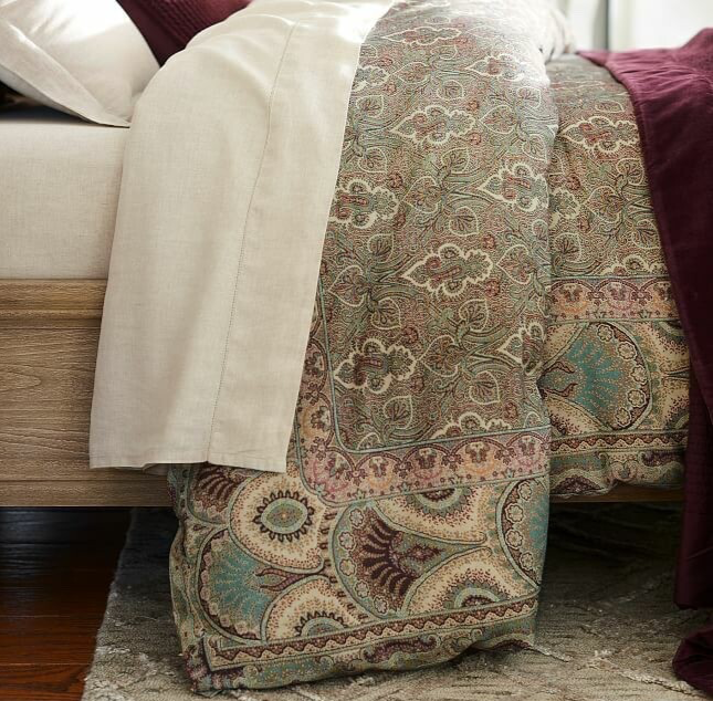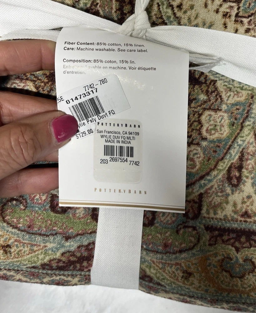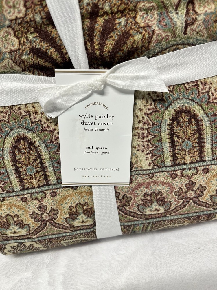 Brand New with Tags Retails for $129.00 + tax so getting a great deal here You are getting 1 Full/Queen Size Duvet Cover Only! Size is 88" x 92" Cotton/Linen Blend This print came together after combining beautiful Jamawars, evoking a luxurious yet casual feel. Pottery Barn's Wylie Paisley Print · Made of an 85% cotton and 15% linen flax fabric blend. · Duvet reverses to a solid natural color. · Duvet features a hidden button closure with inner ties that keep insert in place. · Machine wash. · Imported.