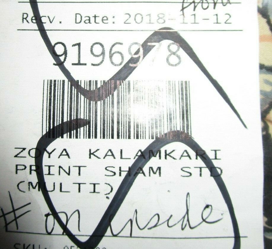 Up for auction - 1 Pottery Barn Zoya Kalamkari Print standard sham quilted photo shoot sample We purchased many items that were only used for Pottery Barn photo shoot samples, they may be missing tags has numbers written on the inside of sham , has some sticky residue on front from sticker Smoke and pet free