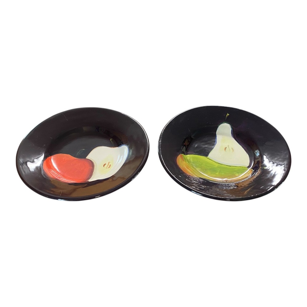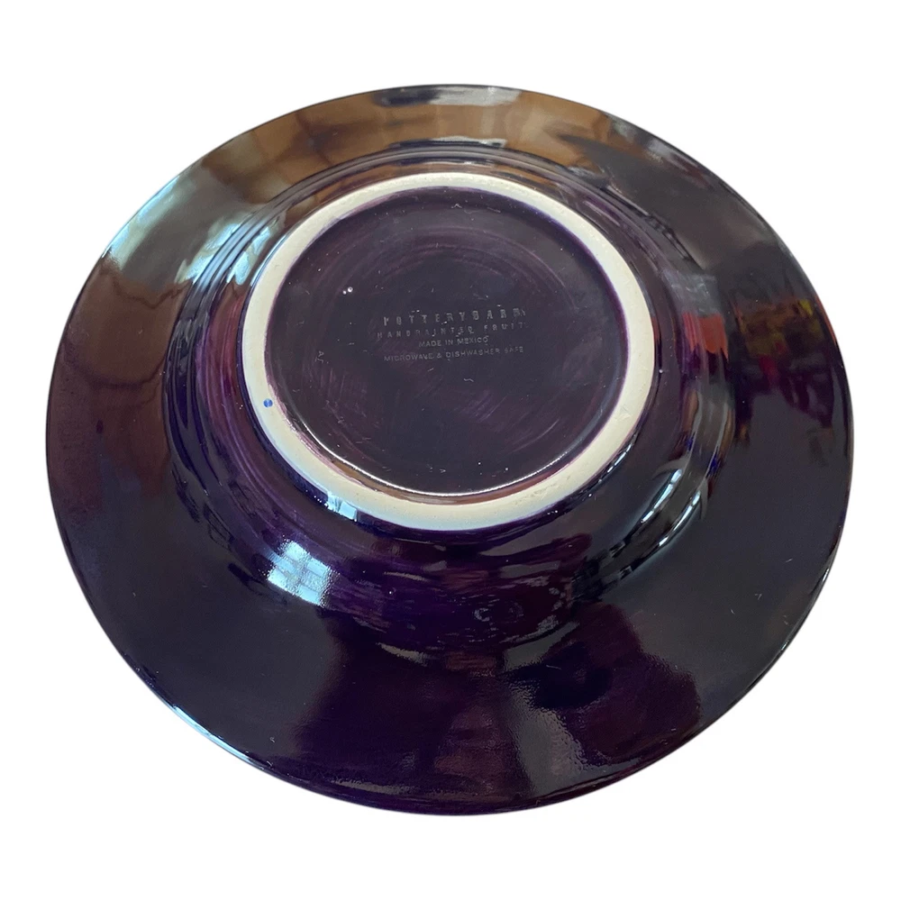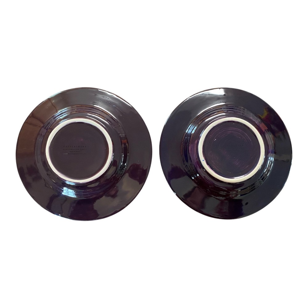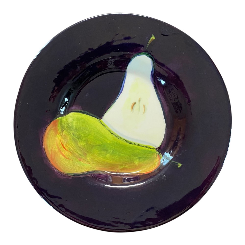 This set of two-piece salad plates by Pottery Barn features a hand-painted fruit pattern with green pears and red apples on a round purple ceramic plate. The plates have a contemporary style and are 10 inches in diameter, making them suitable for all occasions.