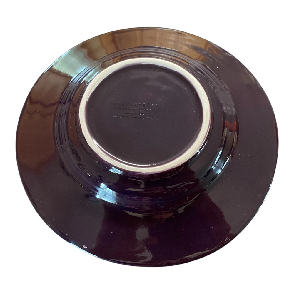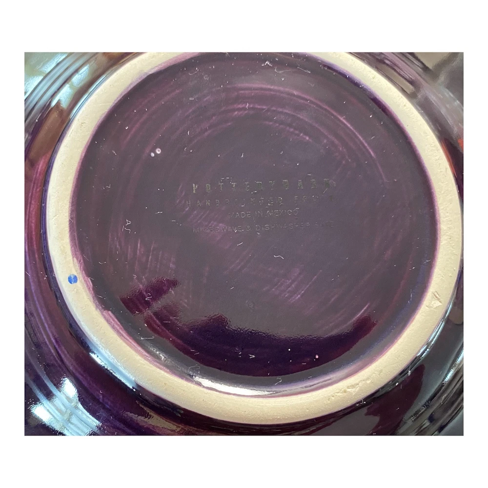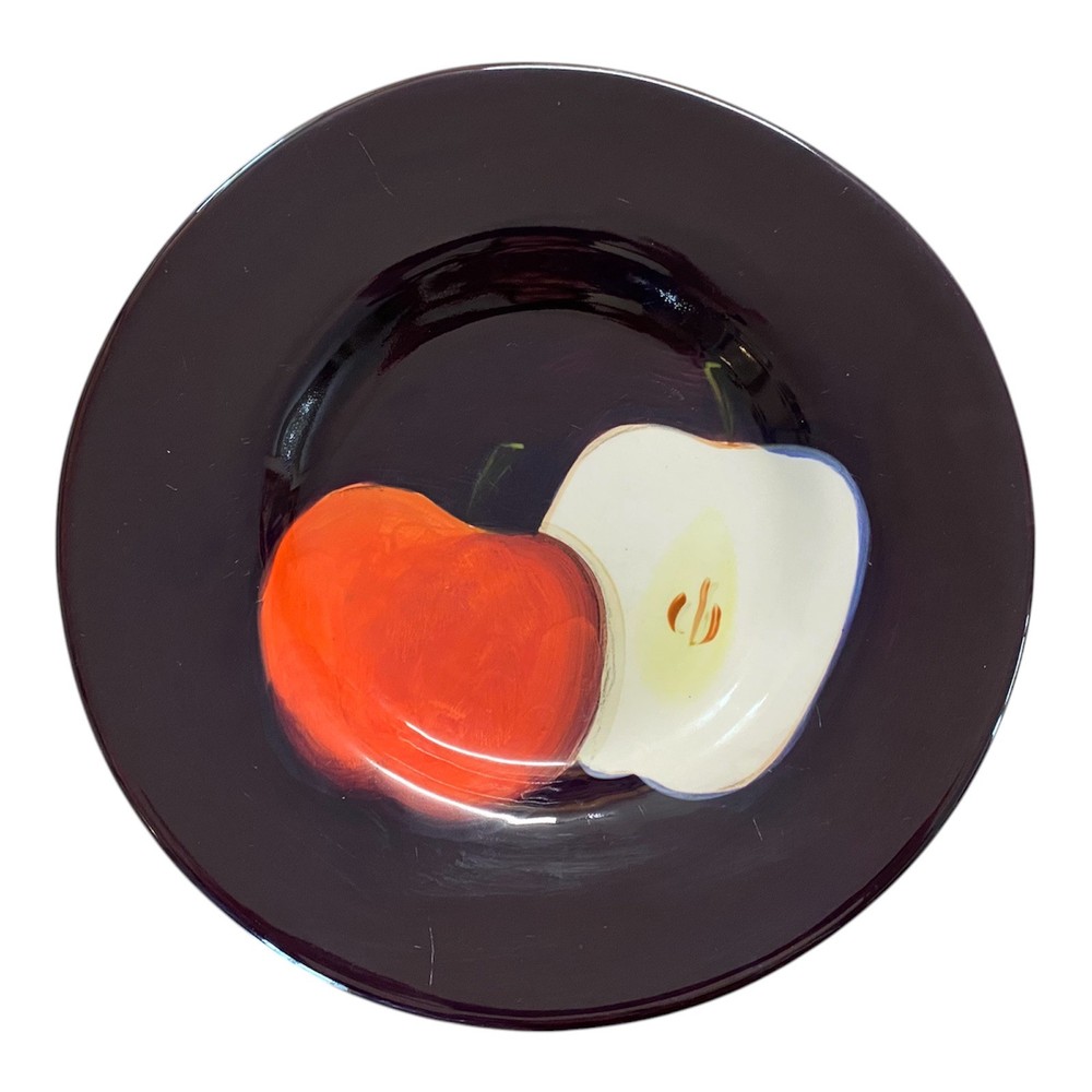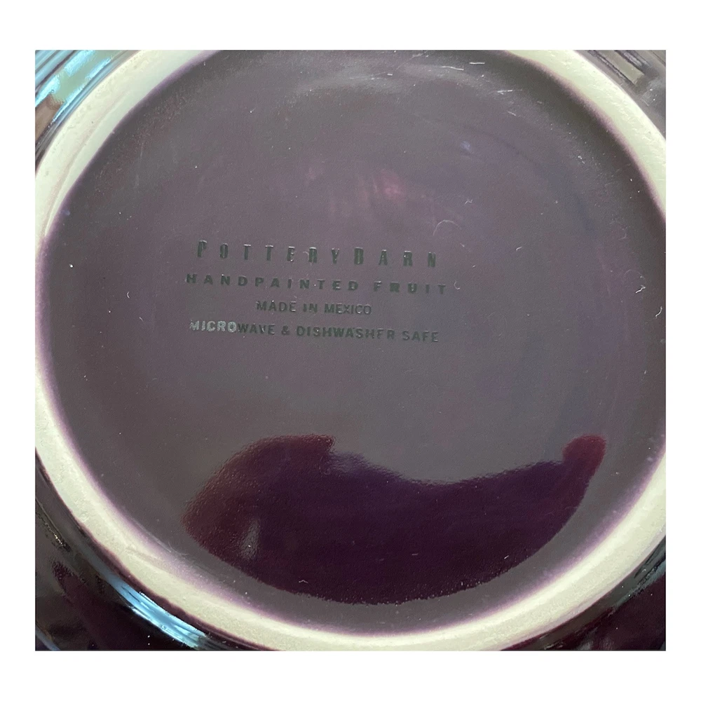 This set of two-piece salad plates by Pottery Barn features a hand-painted fruit pattern with green pears and red apples on a round purple ceramic plate. The plates have a contemporary style and are 10 inches in diameter, making them suitable for all occasions.