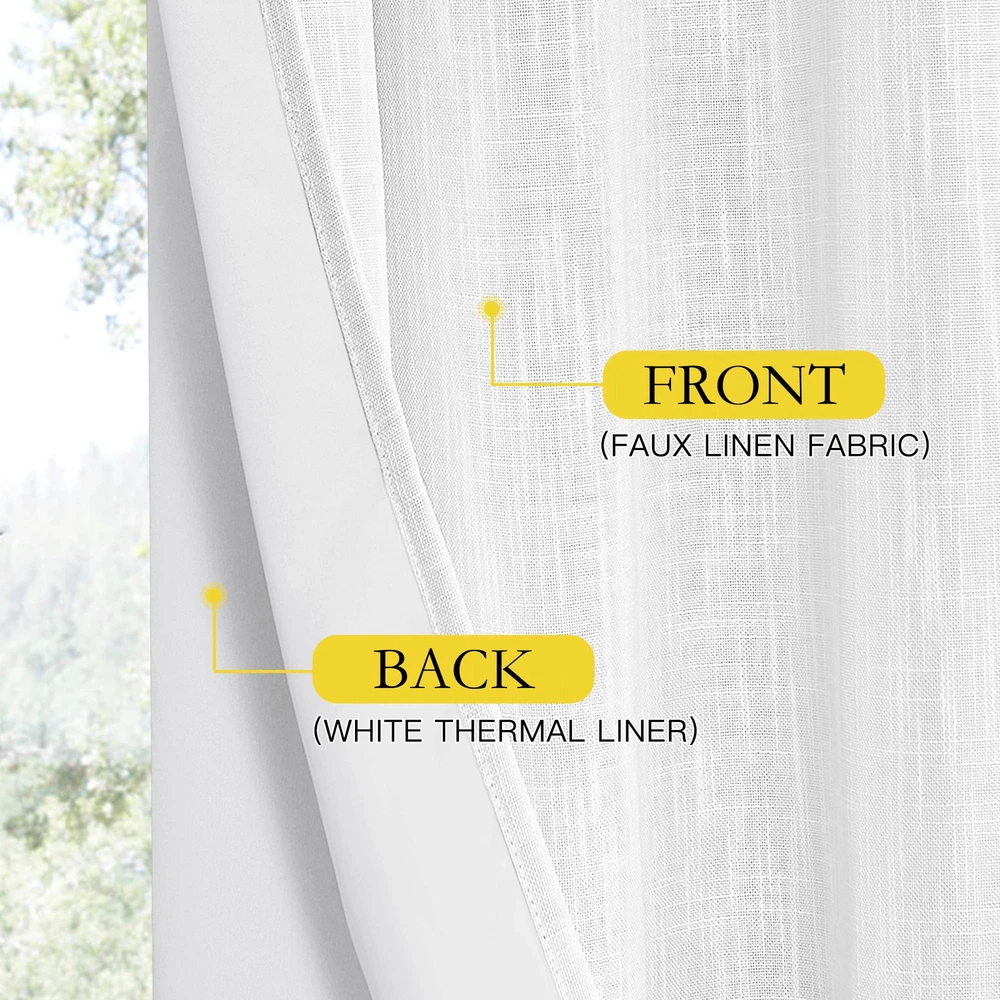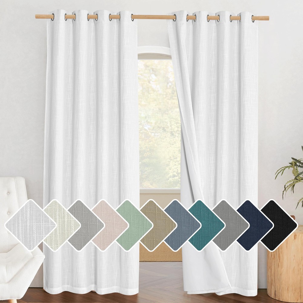 No matter where you live, California, Texas or even Florida, if you have the annoying sunshine of torture, and need a completely dark sleep environment, you can choose our 100% blackout linen curtains. No matter how strong the unwanted light was, you can have a good sleep. Ready Made: 2 panels per package. Each classic linen blackout curtain measures 52" wide x 84" long (Total width is 104"). The unique design of silver grommet (1.6-inch inner diameter) creates farmhouse style for your house, which makes the curtains easy to install and slide. 100% Blackout: Sewn in White color liner diffuses daylight softly and adds additional privacy, making the drapes completely keep out the 100% sunlight and UV rayThe greatest benefit is to offer you a real dark environment, bringing you a good night's sleep during the day. Wide Compatibility: These durable elegant linen blend blackout curtains will decorate your windows and rooms with new sense. Perfect for bedroom, living room, kitchen, patio, room divider, functional and Morden. While still have top performance on energy saving and noise reducing, create airy, breathable, and rustic style. Flax Linen Blend: Linen blackout curtains bring both casual warmth and refined style to the room. The weave of the natural yarn-dyed fibers creates dimensional highs and lows for added depth. This curtain is an elegant option for any room in the home. Lab test shows these awesome curtain panels are environmental and vinyl free. Washing Tips: real linen texture is wrinkle-free and has a great vertical sense. But for the material is made from linen, to keep the original shape, you'd better dry-cleaning or wash the curtains with netural detergent.