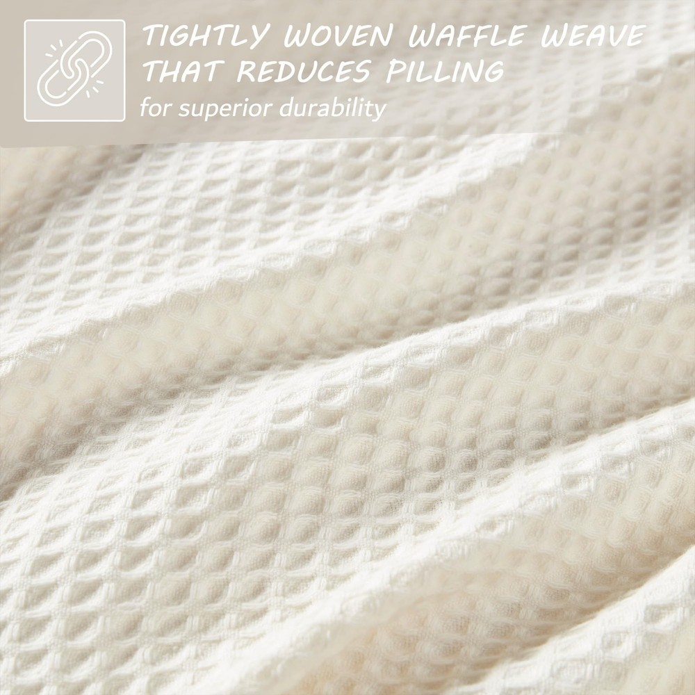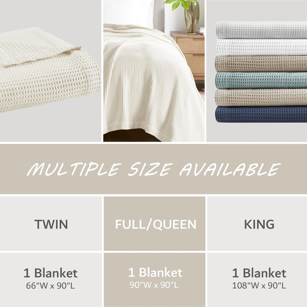 The Waffle Weave Blanket offers an added layer of warmth and comfort to your bed or couch perfect for your year round warmth Made from ultra-soft 100% cotton, this soft and lightweight blanket features tightly woven waffle weave that reduces pilling This cotton blanket is OEKO-TEX certified, meaning it does not contain any harmful substances or chemicals to ensure quality comfort and wellness Set include: 1 Blanket: 90"W x 90"L Care Instructions: Machine Wash
