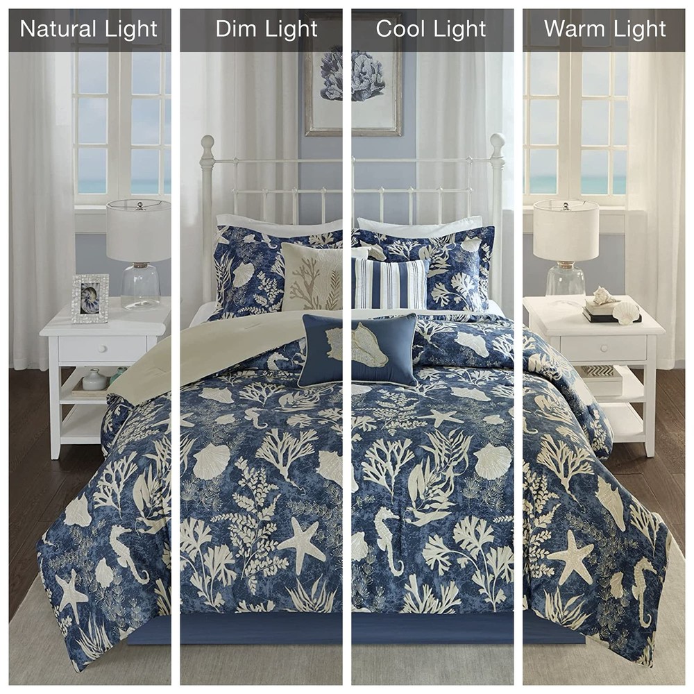 cotton satten coastal motifs embroidered decorative pillows 15" drop bed skirt cotton sateen front, printed, cotton/polyester crossweave reverse, 8oz/yd2 polyester filling, crossweave drop, crossweave shell decorative pillow 1 Comforter:90"W x 90"L 2 Standard Shams:20"W x 26"L + 2"D (2) 1 Bedskirt:60"W x 80"L + 15"D 3 Decorative Pillows:18"W x 18"L/12"W x 18"L/16"W x 16"L Machine Washable Spot Clean Pillows