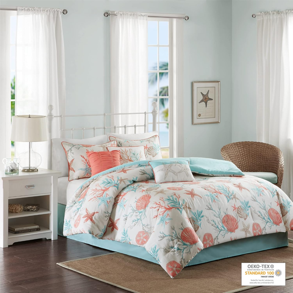 Menu Other Items Feedbacks About Us Contact Us Add To Favorites 100% Cotton Comforter Set - Coastal Coral, Starfish Design All Season down Alternative Cozy Bedding with Matching Shams, Decorative Pillow, King(104"X92"), Teal 7 Piece Cover: 100% Cotton Filling: 100% Polyester Imported For a vibrant coastal update to your bedroom, the Madison Park Pebble Beach 7 Piece Comforter Set is perfect for you! This cotton comforter and shams feature a starfish and coral motif in vivid colors to brighten your space. The solid reverse adds a splash of color to complement the coastal design. Naturally breathable and lightweight cotton fabric that is Oeko-Tex certified to be free of any chemicals and harmful substance paired with hypoallergenic filling for a perfect all season bedding. Set includes: 1 Comforter: 104"W x 92"L, 1 Bed Skirt: 78"W x 80"L + 15"D, 2 King Shams: 20"W x 36"L, 3 Decorative Pillows: 18"W x 18"L/16"W x 16"L/12"W x 18"L Care instructions: Machine wash cold, gentle cycle, and separately. Do not bleach. Tumble drty low, remove promptly. Do not iron. If there is no free movement in the washer or dryer, use large capacity commercial washer/dryer. For a vibrant coastal update to your bedroom, the Madison Park Pebble Beach 7 Piece Comforter Set is perfect for you! This cotton comforter and shams feature a starfish and coral motif in vivid colors to brighten your space. The solid reverse adds a splash of color to complement the coastal design. Three decorative pillows with embroidery and fabric manipulation add dimension to your top of bed, while a solid bed skirt adds the finishing touch. This bedding set is also OEKO-TEX certified, meaning it does not contain any harmful substances or chemicals to ensure quality comfort and wellness. Item Specification Item model number MP10-2705 Assembly required No Pattern Floral Country of Origin China Theme Coastal,Beach Department unisex-adult Import Imported Number of Pieces 7 Batteries required No Product Dimensions 104 x 92 x 1.5 inches Material Cotton Seasons All Form Factor Platform Item dimensions L x W x H 104 x 92 x 1.5 inches Included Components 1 Comforter, 2 King Shams, 1 Bed Skirt, 3 Decorative Pillows Item Weight 15.07 pounds Color Pebble Beach Teal 7pcs Thread Count 210 Global Trade Identification Number 00675716747992 Refill cotton Is Discontinued By Manufacturer No Fabric Type Cover: 100% Cotton Filling: 100% Polyester Product Care Instructions Machine Wash Size King Dimensions Shipping Returns Additional Info Product Dimensions: 92.0 inches x 104.0 inches x 1.5 inches. Weight: 15.07 lb Fast shipping is very important for us. Our standard shipping service is FREE. Your order will be shipped within 1-3 business days upon full payment received. Most items are delivered within 3-5 business days, however, please allow 3-10 business days. We are shipping only to USA. We only ship to the confirmed Paypal address. We reserve the right to cancel any order for any reason at any time. We are not responsible for undeliverable addresses. We offer a 30 day return policy from checkout winning date. Your satisfaction is guaranteed! If for any reason you are unhappy with your item, just return it within 30 days for a full refund, minus shipping cost. Please contact us prior to initiating a return so that we can issue you a refund authorization. Items defective upon receipt must be packaged in their retail packaging as if new and returned with a detailed description of the problem. Return shipping fees are not refundable. We reserve the right to decline any returns if the above guidelines are not followed. All of our items, unless otherwise stated, will only run on 120 volts. Please check to make sure your country complies with these specifications. If you have a problem or question regarding your transaction please contact us before leaving any type of feedback. We will work with you to resolve any problem you may have.