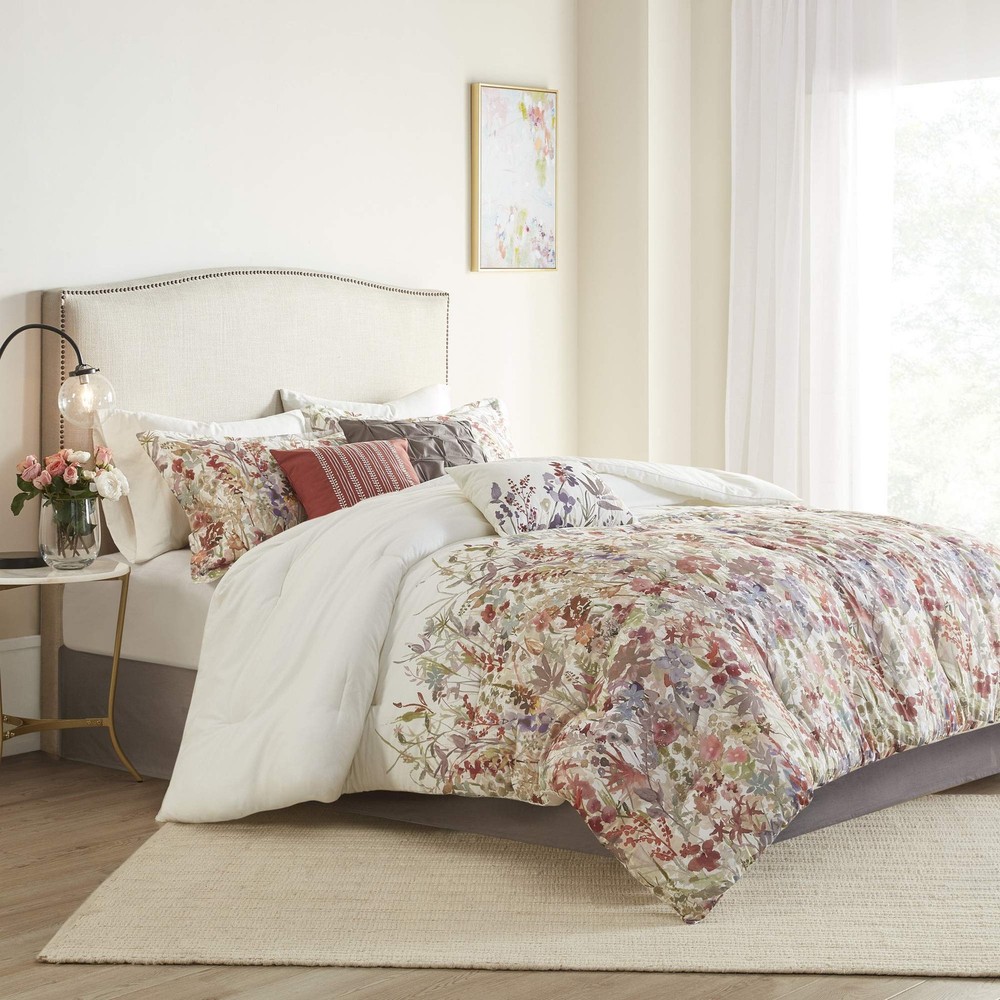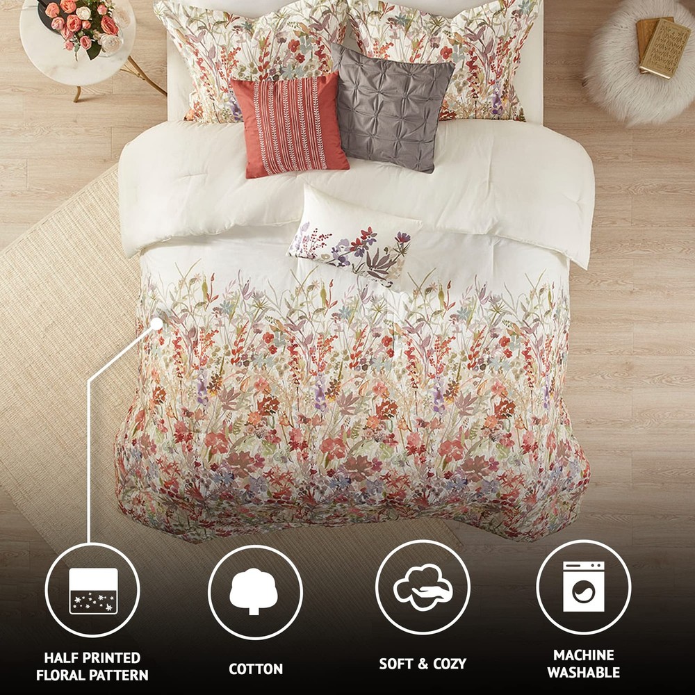 The Mariana 7 Piece Cotton Printed Comforter Set brings a touch of beauty to your bedroom decor. This cotton comforter features a watercolor floral print that runs from the middle of the bed to the foot, for a beautiful transitional look. Soft and Cozy Bedding Set that's Oeko-Tex certified that no harmful chemical substance was used during the production process. Set includes: 1 Comforter: 104"W x 92"L, 2 King Shams: 20"W x 36"L + 2"D, 1 Bedskirt: 78"W x 80"L + 15"D, 3 Decorative Pillows: 18"W x 18"L/12"W x 18"L/16"W x 16"L Machine Washable and pillow spot clean only. Commercial size washer and dryer is recommended for best result.