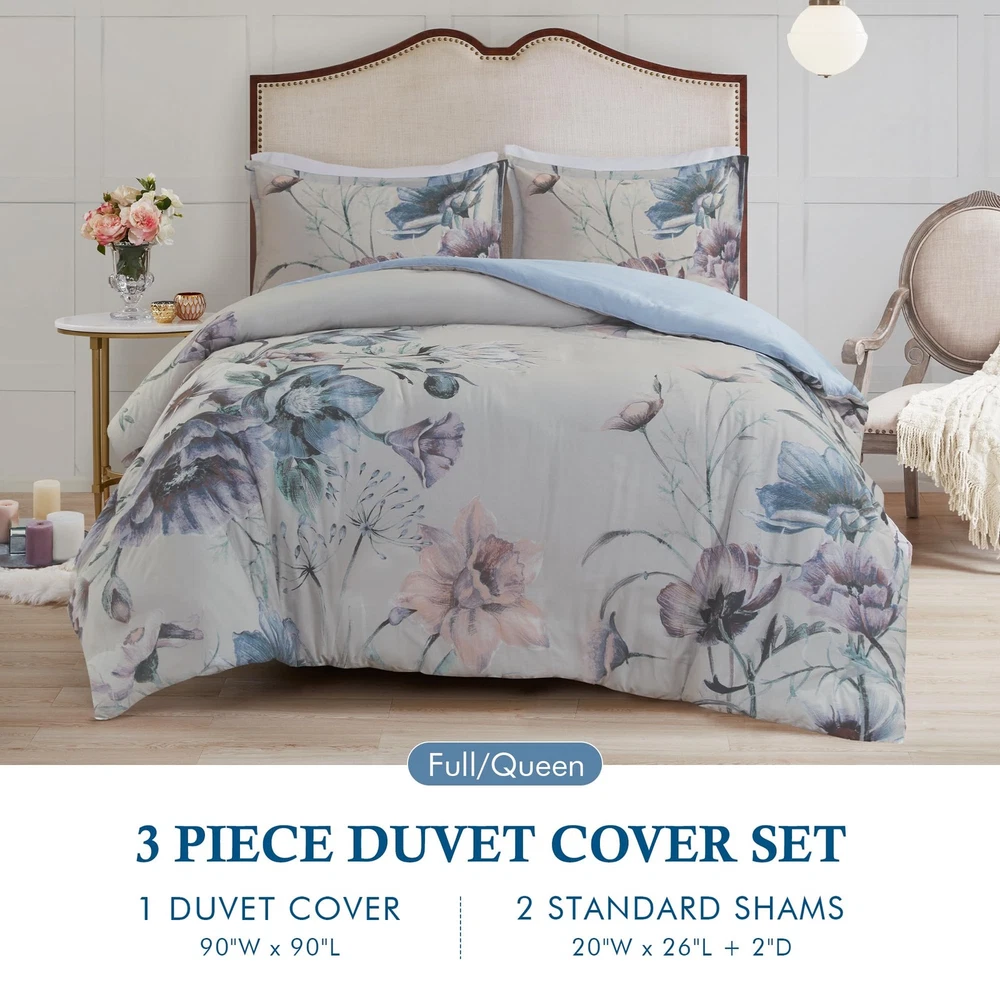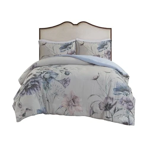 The Madison Park Cassandra 3 Piece Cotton Printed Duvet Cover Set offers a beautiful shabby chic update to your bedroom. The cotton duvet cover and shams feature a large floral print, in soft blue hues, creating a gorgeous look. With its romantic color combination, this shabby chic duvet cover set set brings a soft allure to your bedroom. A button closure helps secure a comforter insert within the duvet cover and four corner ties help prevent it from shifting (insert is NOT included). This bedding set is also OEKO-TEX certified, meaning it does not contain any harmful substances or chemicals to ensure quality comfort and wellness. Modern shabby chic cozy duvet cover set to update your bedroom decor with a charming farmhouse cottage décor or a country living lifestyle. 100% cotton percale, this duvet cover and matching shams feature a large floral print in soft blush hues to create a gorgeous look Naturally breathable and lightweight cotton fabric equipped with 4 corner ties and button closure to secure the filled insert from shifting Set includes: 1 Duvet Cover: 90"W x 90"L, 2 Standard Shams: 20"W x 26"L + 2"D Care Instructions: Machine Washable