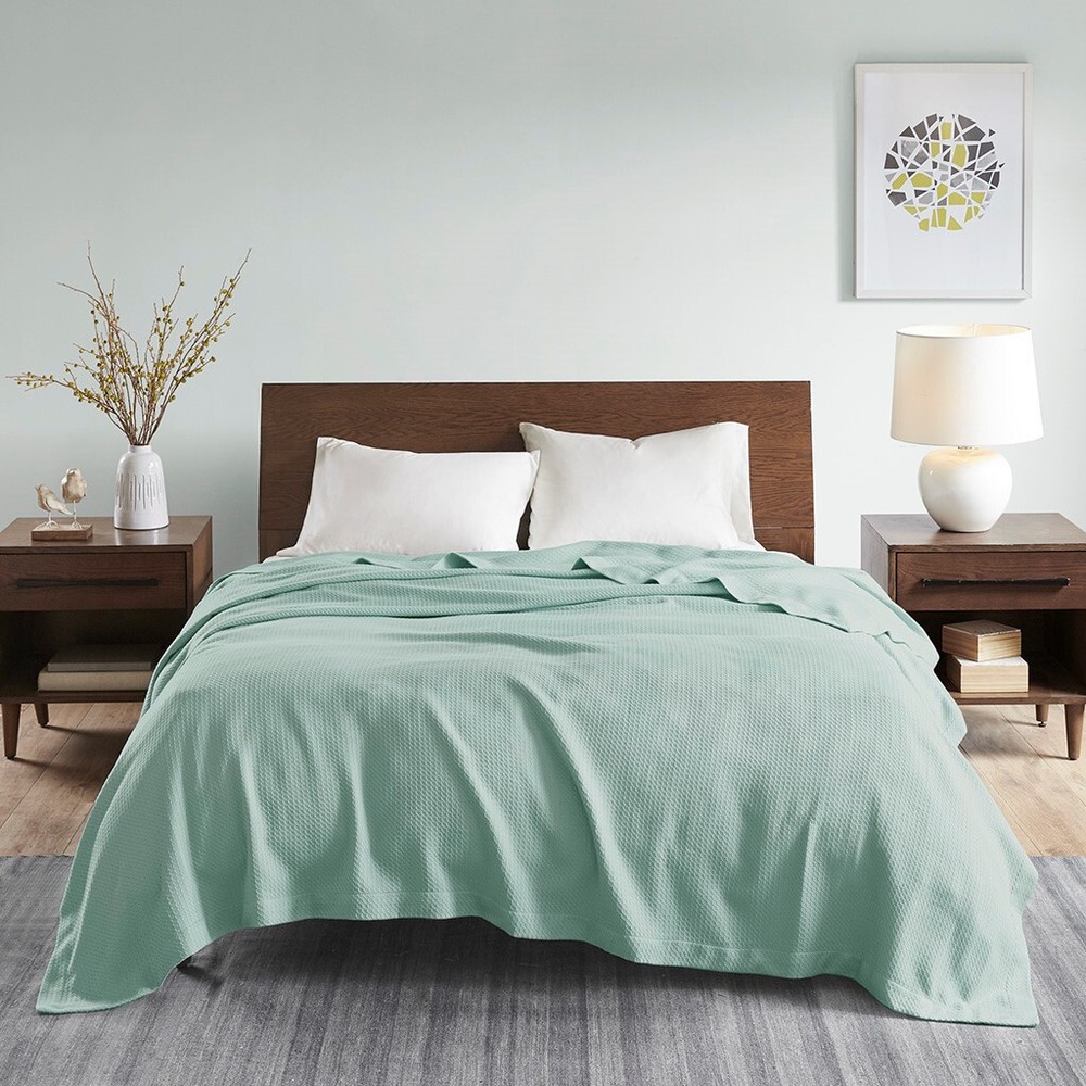 Wrap yourself up in the luxurious comfort of the Madison Park Egyptian Cotton Blanket. This ultra-soft seafoam blanket in made from 100% certified Egyptian cotton that features reduced shrinkage, pilling, and snagging, for a durable and comfortable feel. The solid pattern of the blanket makes it easy to match with your existing casual décor. Machine washable this Egyptian cotton blanket is perfect for lying across your bed or sofa to keep warm and cozy all year round. 100% Egyptian Cotton Immerse yourself in an exceptionally comfort of our 100% Certified Genuine Egyptian Cotton Bedding Blanket featuring super soft and breathable fabric for year round comfort Our premium quality Egyptian cotton blanket is tightly woven blanket to reduce piling and snagging for enhanced durability for the years to come Premium quality blanket Oeko-Tex Certified, includes no harmful substances or chemicals ensuring quality comfort and wellness 1 Full/Queen Size Blanket: 90"W x 90"L For you convenicend it's machine wash cold, gently and separately. Do not bleach. Tumble dry low. Remove promptly