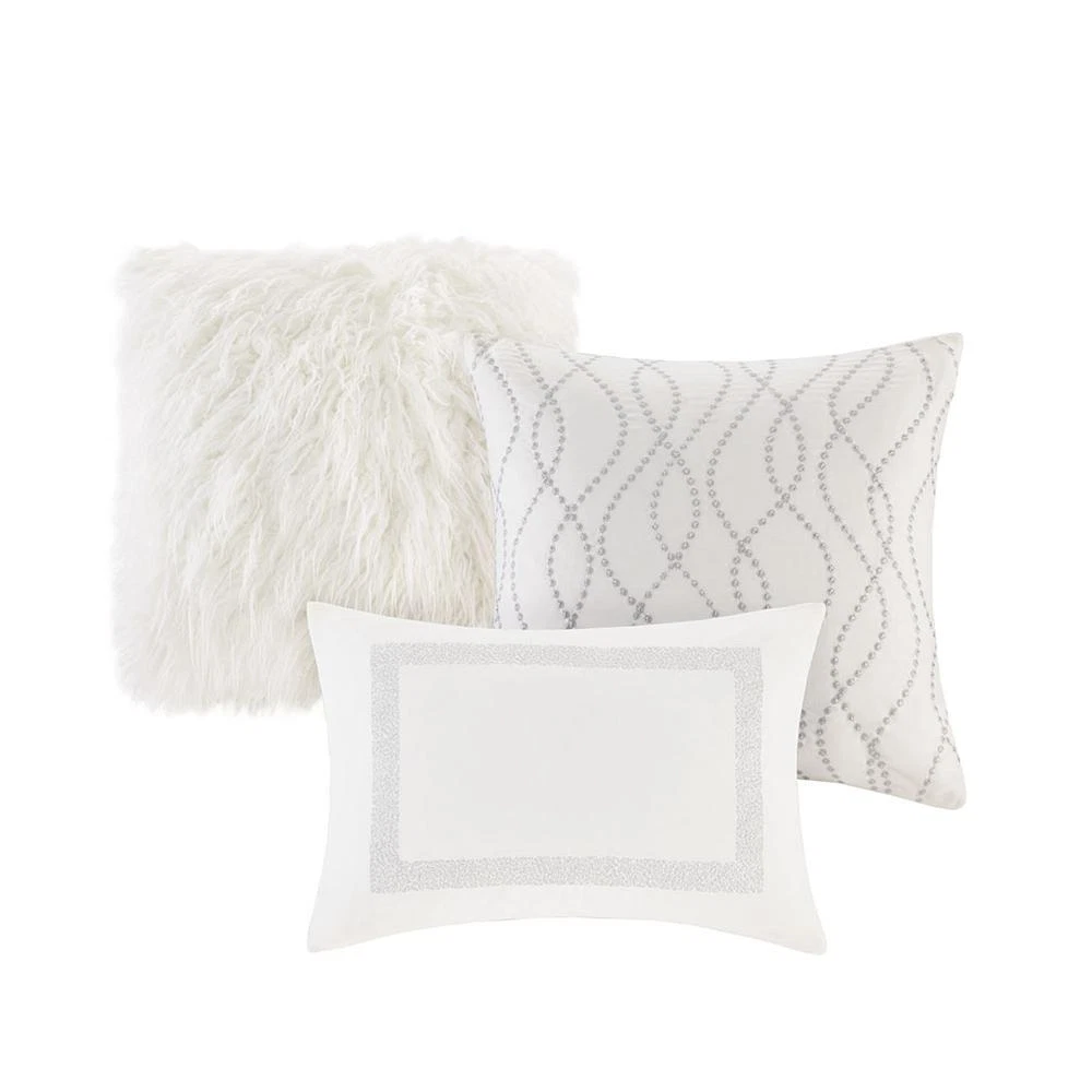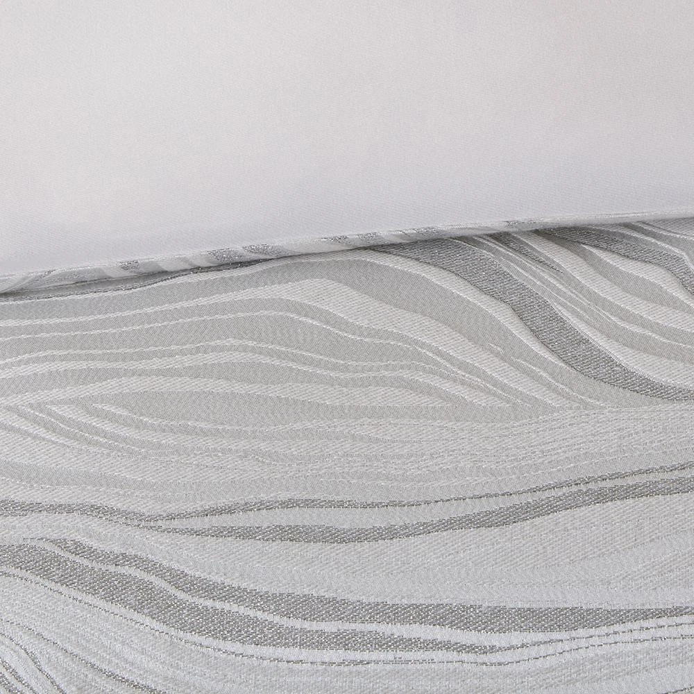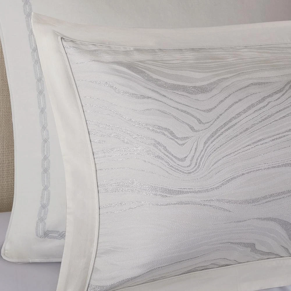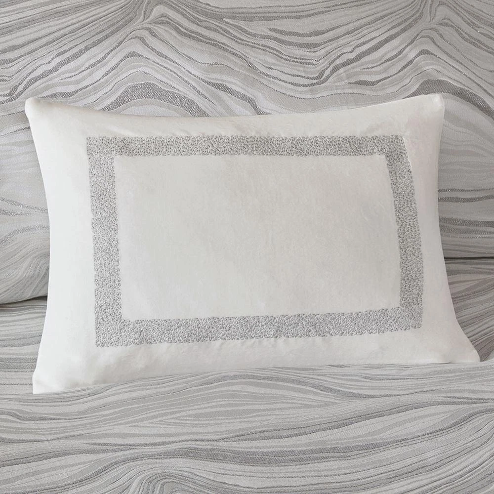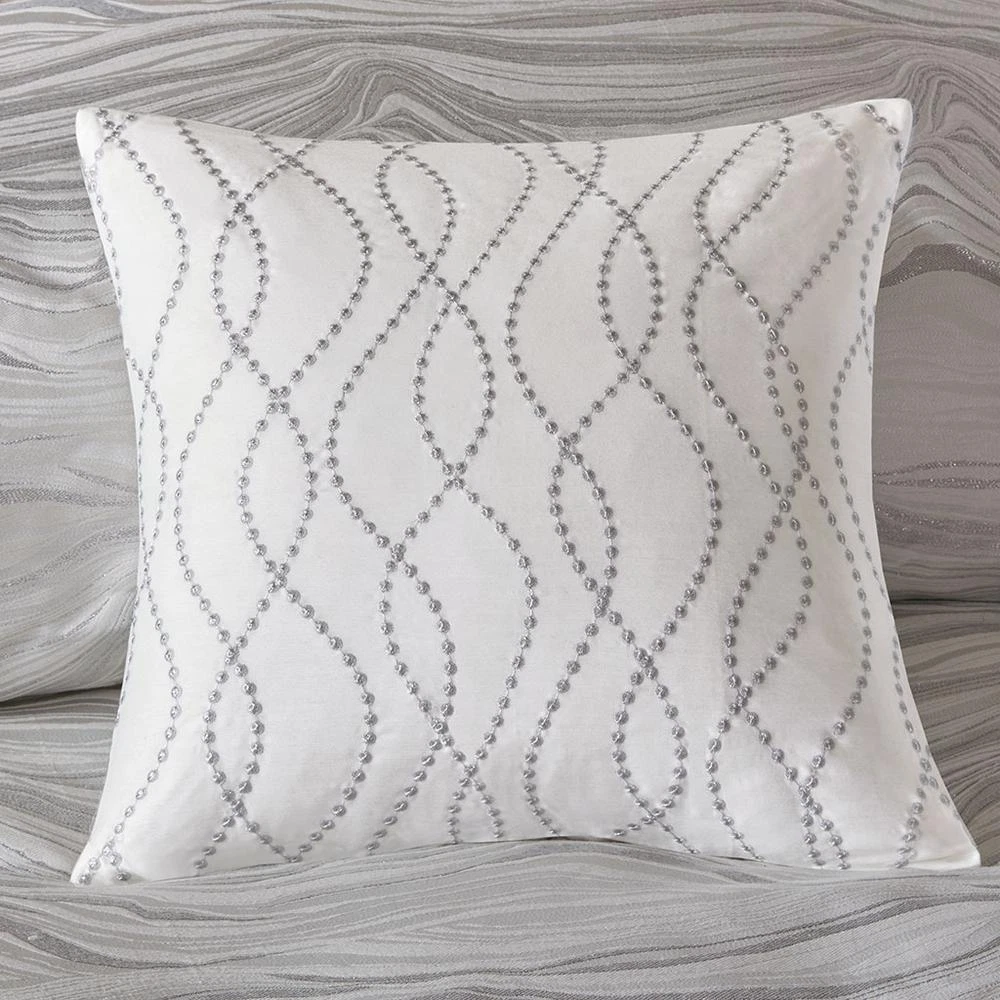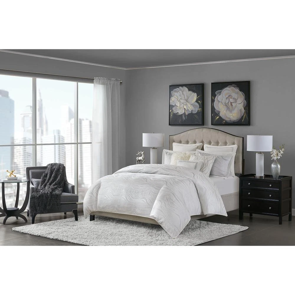 100% Polyester Jacquard Metallic 8pcs Comforter Set Luxury metallic jacquard Oversize and overfilled weight comforter Removable comforter cover for easy wash Oeko-Tex Certified, includes no harmful substances or chemicals (# 19.HCN.68889) The Madison Park Signature Hollywood Glam Comforter Set offers a modern and elegant update to the bedroom. This jacquard comforter flaunts an all-over metallic detailing on the luxurious white base, for glamorous allure. The comforter cover is also removable with button closures, making it easy to wash. Coordinating shams mirror the motif of the comforter and the Euro shams feature a rich cotton velvet face with embroidered details. Three decorative pillows are embellished with unique embroidery and texture, adding dimension and glam to this lavish comforter set. This bedding set is OEKO-TEX certified, meaning it does not contain any harmful substances or chemicals, ensuring quality comfort and wellness. Product Specifications Primary Color White Size Description Queen Material/Fabrication Comforter/Sham face: 100% polyester jacquard with metallic with filled piping around 3 edges comforter Back: 100% polyester micro fiber standard sham back: 100% polyester solid jacquard Filling: 10 oz per yard 100% polyester Euro sham: 100% cotton velvet with embroidery on face 20x20"pillow cover: faux fur pilow 20x20" pillow cover: 100% polyester jacquard with embrodiery on face 14x20" pillow cover: 100% cotton velvet with embroidery on face Pillow: hidden zipper with polyester filler