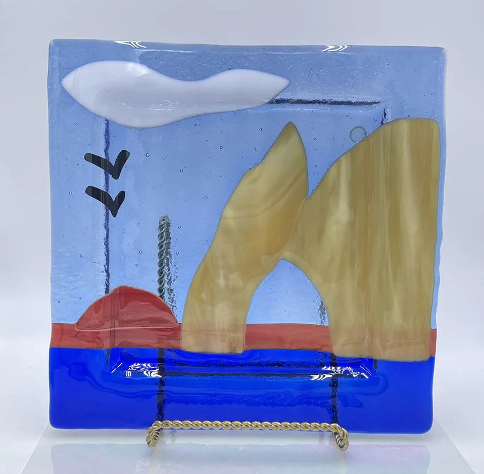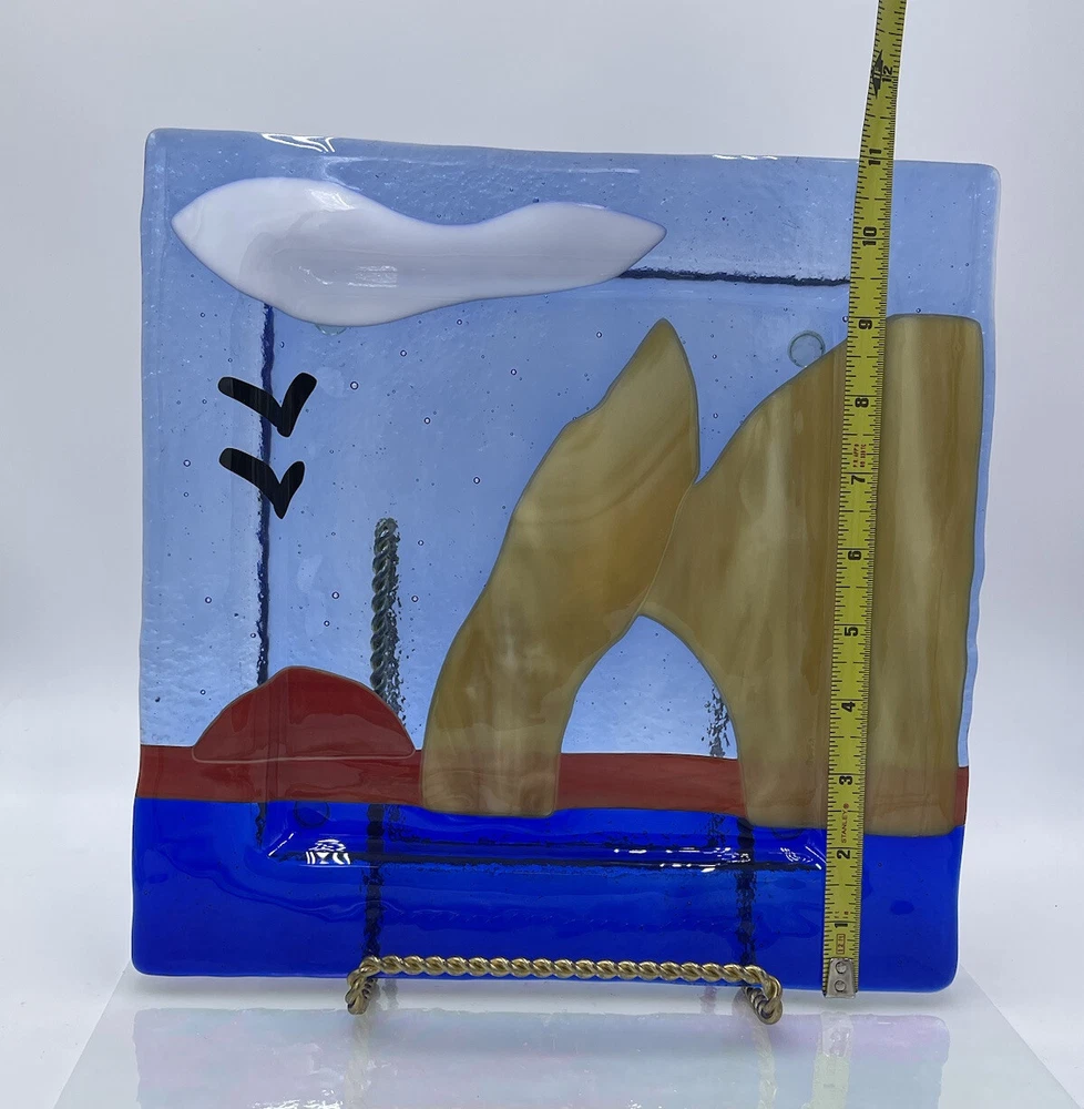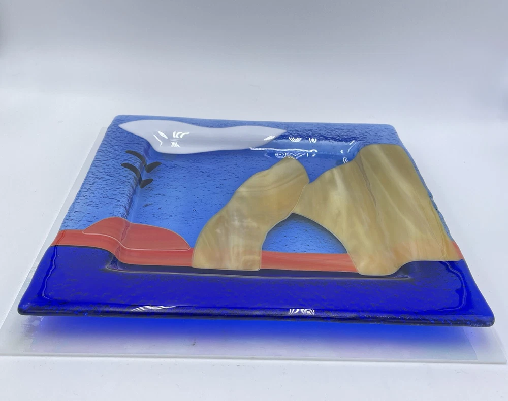 11" Large Studio Art Fused Glass Dish Platter Tray Desert Arches Scenery Design...