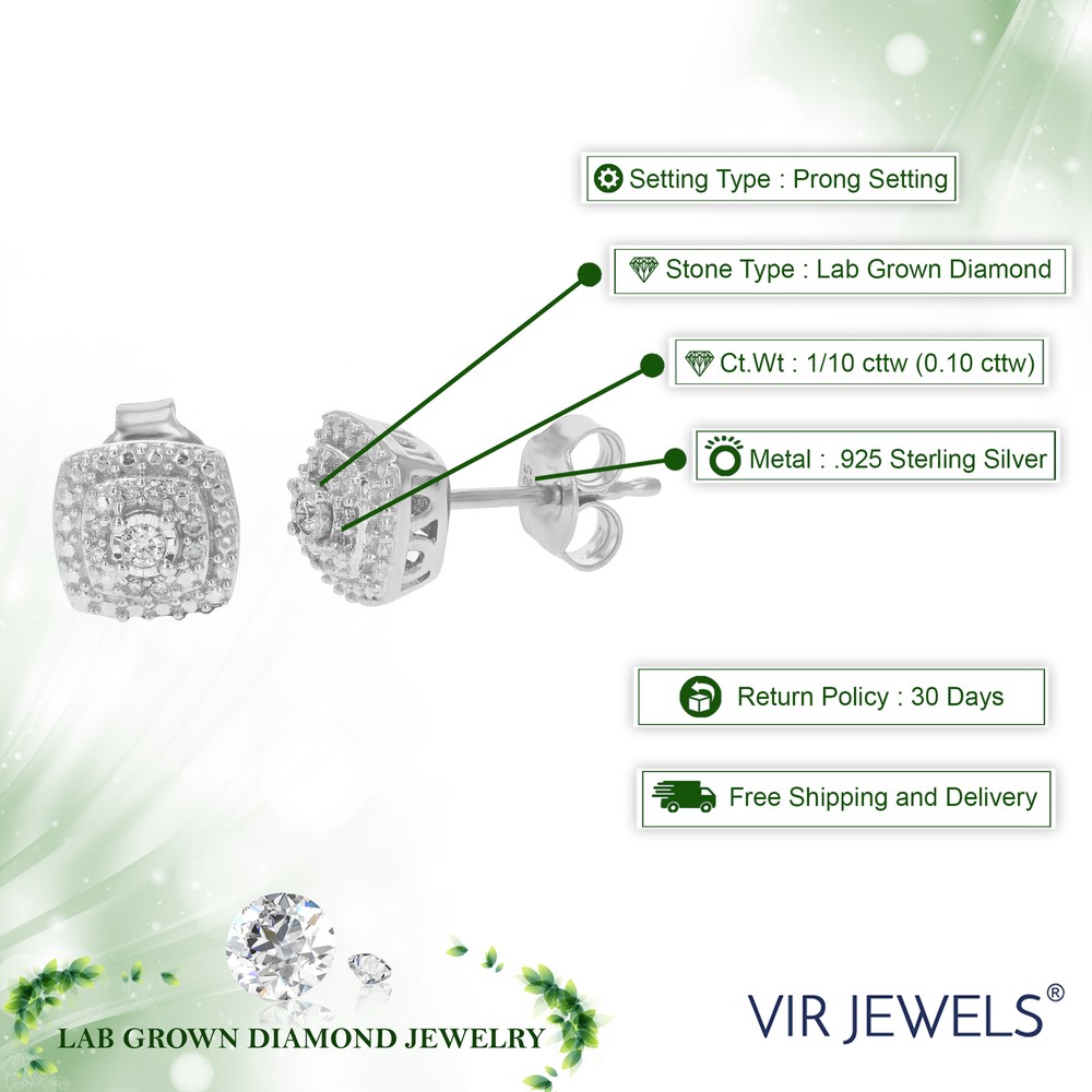 Diamonds are a popular choice when it comes to stud earrings. And what better than a lab grown diamond that has the same chemical, optical and physical properties, crystal structure and hardness as a natural diamond. Lab grown diamonds are a responsible choice since no mining is required and are just as valuable as natural diamonds. The sterling silver in the lab grown diamond stud earrings is a very durable metal that stays shiny for a long time. The diamonds in the earring perfectly complement the sterling silver metal that has always been on the forefront of fashion. The sparkling 18 diamonds are mounted in a prong setting that securely hold the diamonds and accentuates their brilliance. Prong setting ensures that diamonds are visible and well supported, thereby offering a balance of style and durability. You can accessorize the 1/10 cttw diamond stud earrings with any outfit and elevate your style. Charismatic and chic, the stud earrings look nothing less than perfect. we have a 30-days easy return policy. The gorgeous diamond stud earrings come in a beautiful jewelry box. Committed towards making unique jewelry, we design what you demand. Diamonds are a popular choice when it comes to stud earrings. And what better than a lab grown diamond that has the same chemical, optical and physical properties, crystal structure and hardness as a natural diamond. Lab grown diamonds are a responsible choice since no mining is required and are just as valuable as natural diamonds. The sterling silver in the lab grown diamond stud earrings is a very durable metal that stays shiny for a long time. The diamonds in the earring perfectly complement the sterling silver metal that has always been on the forefront of fashion. The sparkling 18 diamonds are mounted in a prong setting that securely hold the diamonds and accentuates their brilliance. Prong setting ensures that diamonds are visible and well supported, thereby offering a balance of style and durability. You can accessorize the 1/10 cttw diamond stud earrings with any outfit and elevate your style. Charismatic and chic, the stud earrings look nothing less than perfect. we have a 30-days easy return policy. The gorgeous diamond stud earrings come in a beautiful jewelry box. Committed towards making unique jewelry, we design what you demand. Vir Jewels ® - Beautiful Diamond Jewelry in Gold and Silver Search Our Store Toll Free: 1-888-717-1299 Home | Bracelets | Earrings | Pendants | Rings | Watches | Certified | Color Diamonds | Gemstones | On Sale | Weekly Special Shop by Category Store Home Bracelets Earrings Pendants Rings Sets Watches Men's Certified Jewelry Color Diamond Gemstones Loose Diamond On Sale Weekly Special Shop by Bridals Bridal Sets Engagement Eternity Men's Solitaire Three Stone Wedding Bands Color Diamonds Black Blue Champagne Green Yellow Certified Jewelry Bracelets Earrings Pendants Rings Loose Diamonds Gemstones Amethyst Aquamarine Blue Topaz Citrine Emerald Garnet Green Amethyst Lemon Quartz Pearl Peridot Ruby Sapphire Tanzanite Store Newsletter Add our Store to your Favorites and receive our email newsletters about new designs and special promotions & discounts. Search Our Store Product Description Diamonds are a popular choice when it comes to stud earrings. And what better than a lab grown diamond that has the same chemical, optical and physical properties, crystal structure and hardness as a natural diamond. Lab grown diamonds are a responsible choice since no mining is required and are just as valuable as natural diamonds. The sterling silver in the lab grown diamond stud earrings is a very durable metal that stays shiny for a long time. The diamonds in the earring perfectly complement the sterling silver metal that has always been on the forefront of fashion. The sparkling 18 diamonds are mounted in a prong setting that securely hold the diamonds and accentuates their brilliance. Prong setting ensures that diamonds are visible and well supported, thereby offering a balance of style and durability. You can accessorize the 1/10 cttw diamond stud earrings with any outfit and elevate your style. Charismatic and chic, the stud earrings look nothing less than perfect. we have a 30-days easy return policy. The gorgeous diamond stud earrings come in a beautiful jewelry box. Committed towards making unique jewelry, we design what you demand. Gem Type : Lab Grown Diamond Carat Weight : Diamond - 0.10 Gemstone - Cut : Good-Cut Color : H-I Clarity : SI2-I1 Metal Type : Sterling-Silver Metal Purity : 925-Sterling Dimensions : Width - 7.000 MM Length - 15.000 MM Retail Price : About Us Payment / Shipping Policy Holiday Shipping Return Policy Feedback / FAQ Welcome to Vir Jewels ® - Online Diamond and Jewelry Store For the most exquisite and wide selection of diamonds and gemstone jewelry, Vir Jewels ® is your number one online source that guarantees the best in price, quality and service. Vir Jewels ® offers an extensive array of beautiful earrings, necklaces, pendants, and rings for you as well as to make an ideal gift for all occasions. We specialize in beautiful engagement rings and wedding bands perfect for the special moment. With our vast collection of white, black, blue, champagne and yellow diamonds, you can be assured to find what you are looking for. We also have incredible deals and specials, you cannot afford to miss. Vir Jewels ® is your one-stop-online-shop for the most diverse styles at the best prices. About Us - In The Jewelry Business For Over 40 Years - Handcrafted Jewelry (Unique and Elegant Designs) - All Our Diamonds Are 100% Natural - Get It Fast (Next Day Delivery) - Guaranteed Lowest Prices (Buy Direct From the Source) - Excellent Customer Service - Live Chat - 30 Day Return Policy - Friendly, Helpful and Knowledgeable Professional Staff - Telephone and 24/7 EMail Response Product Promotions About Us Payment / Shipping Policy Holiday Shipping Return Policy Feedback / FAQ Payment / Shipping Policy - We 