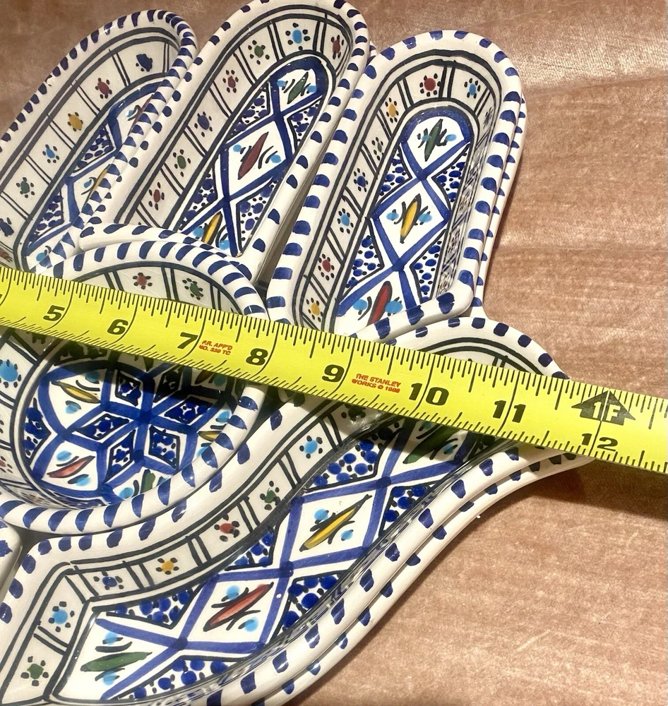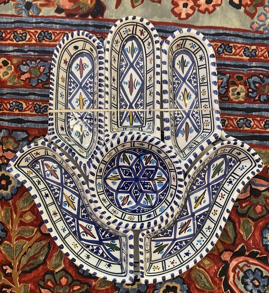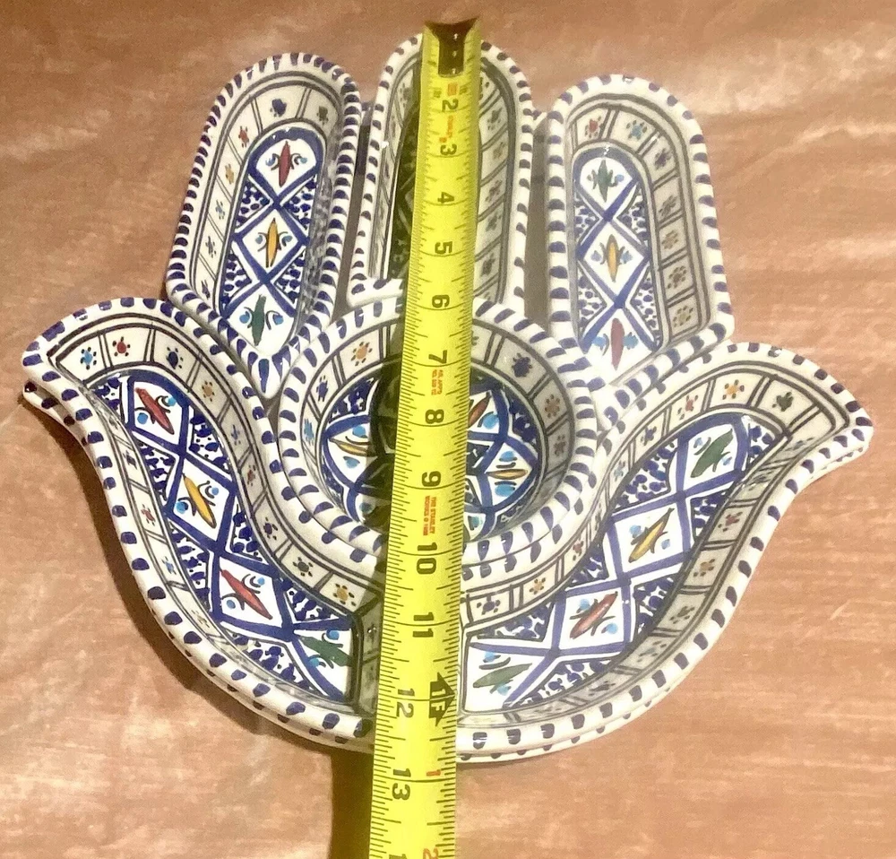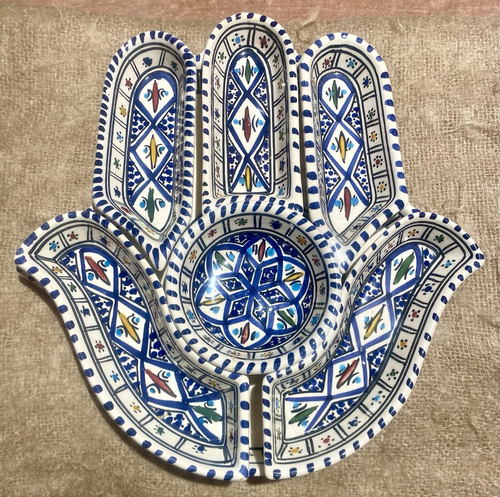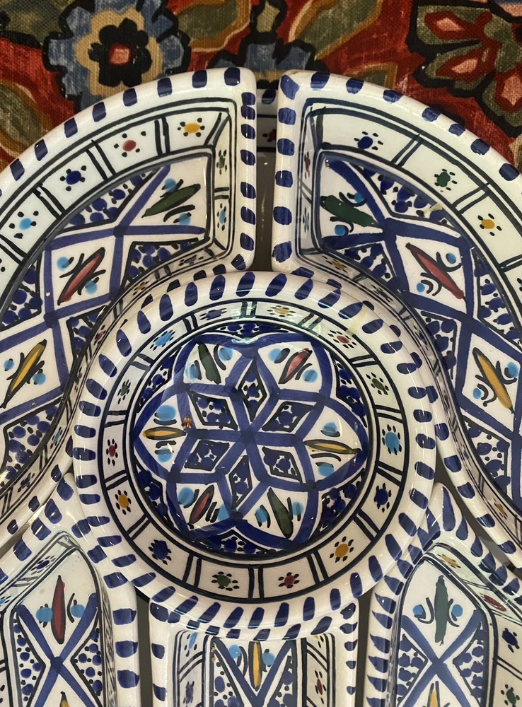 Beautifully patterned, Tunisian Hamsa or Hand of Fatima- style serving dish offers six detachable compartments for dips, sauces or nibbles. Large (12 1/2 x 12" ) dish makes a dramatic presentation on your table or buffet. Traditional and folkloric, its predominantly blue and white tones complement rustic as well as modern décor. In very good used condition, I find no chips, cracks, fading or staining. There is the generalized, allover crazing which typifies handcrafted, soft clay earthenware pieces of this type ( please see photos). Marked KAMSAH on the reverse, the stunning North African ceramic server ships USPS Ground Advantage from Los Angeles.