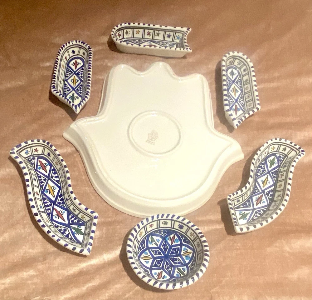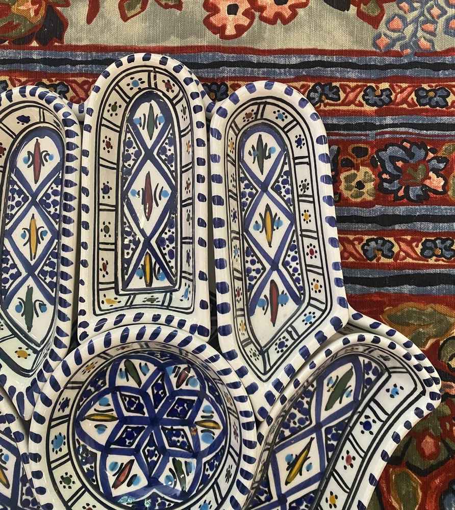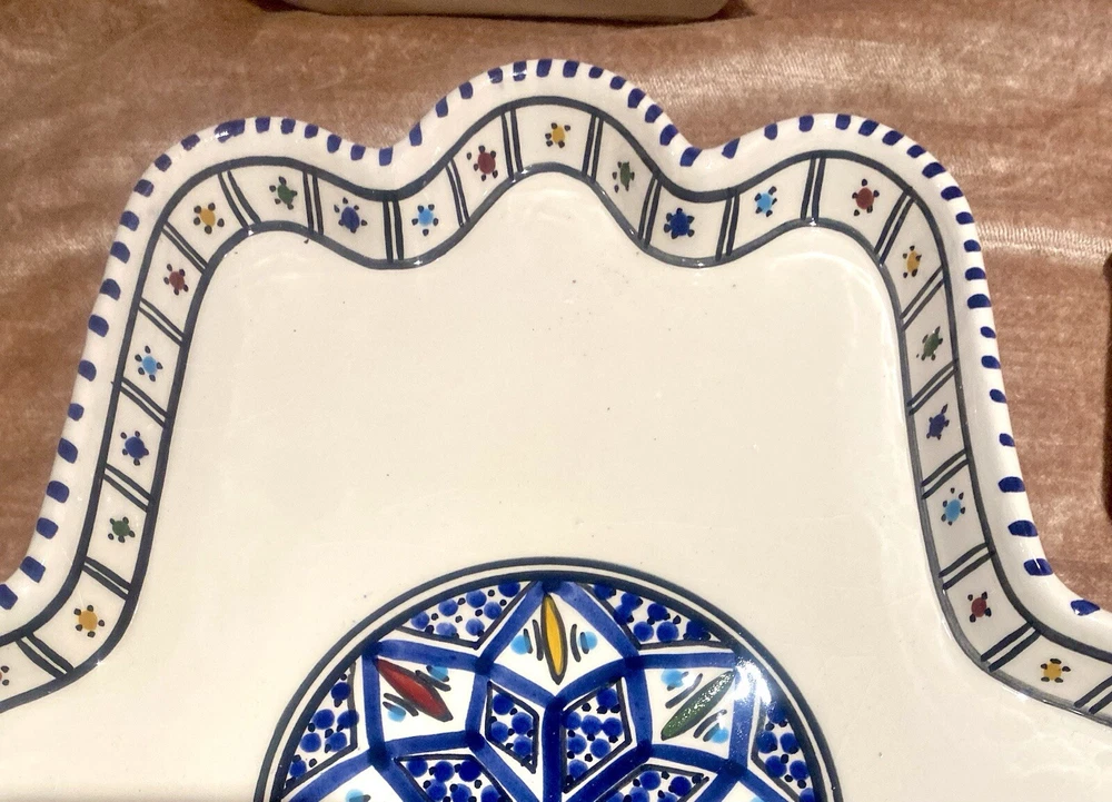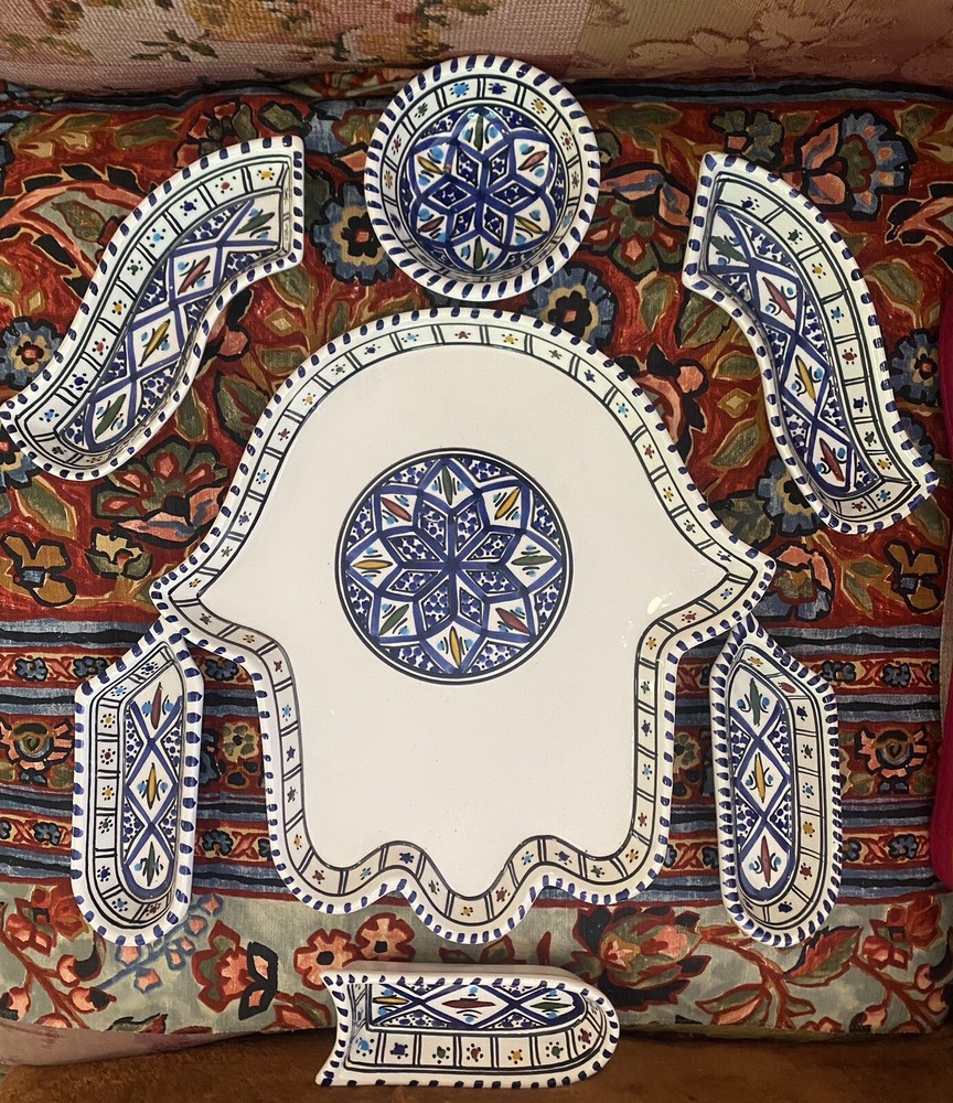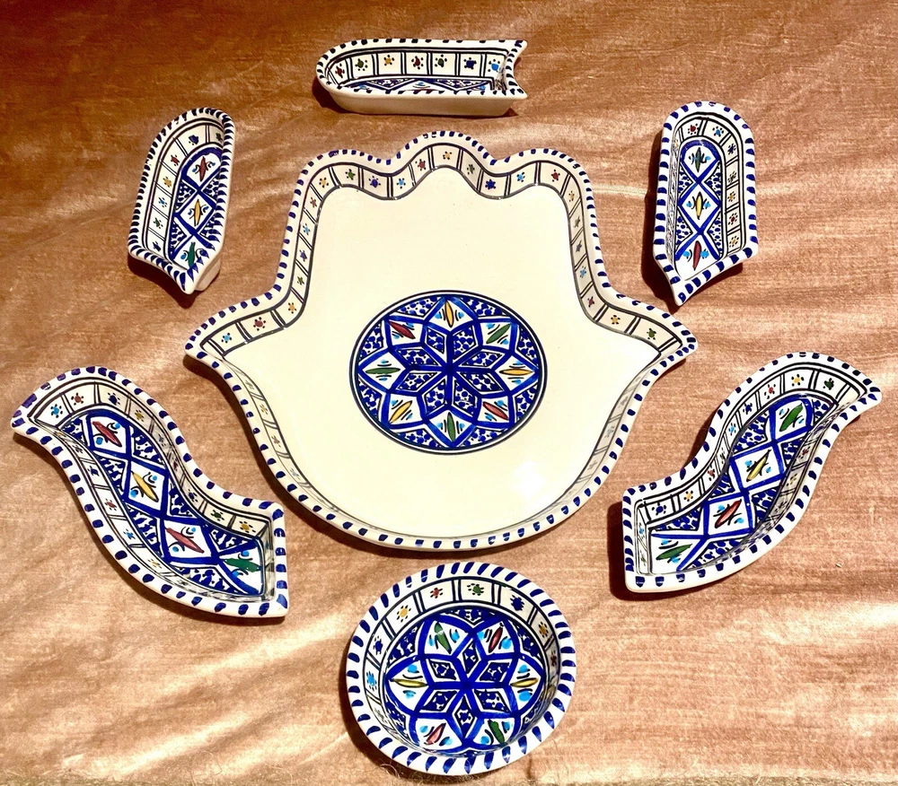 Beautifully patterned, Tunisian Hamsa or Hand of Fatima- style serving dish offers six detachable compartments for dips, sauces or nibbles. Large (12 1/2 x 12" ) dish makes a dramatic presentation on your table or buffet. Traditional and folkloric, its predominantly blue and white tones complement rustic as well as modern décor. In very good used condition, I find no chips, cracks, fading or staining. There is the generalized, allover crazing which typifies handcrafted, soft clay earthenware pieces of this type ( please see photos). Marked KAMSAH on the reverse, the stunning North African ceramic server ships USPS Ground Advantage from Los Angeles.