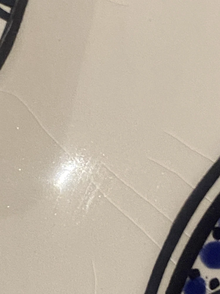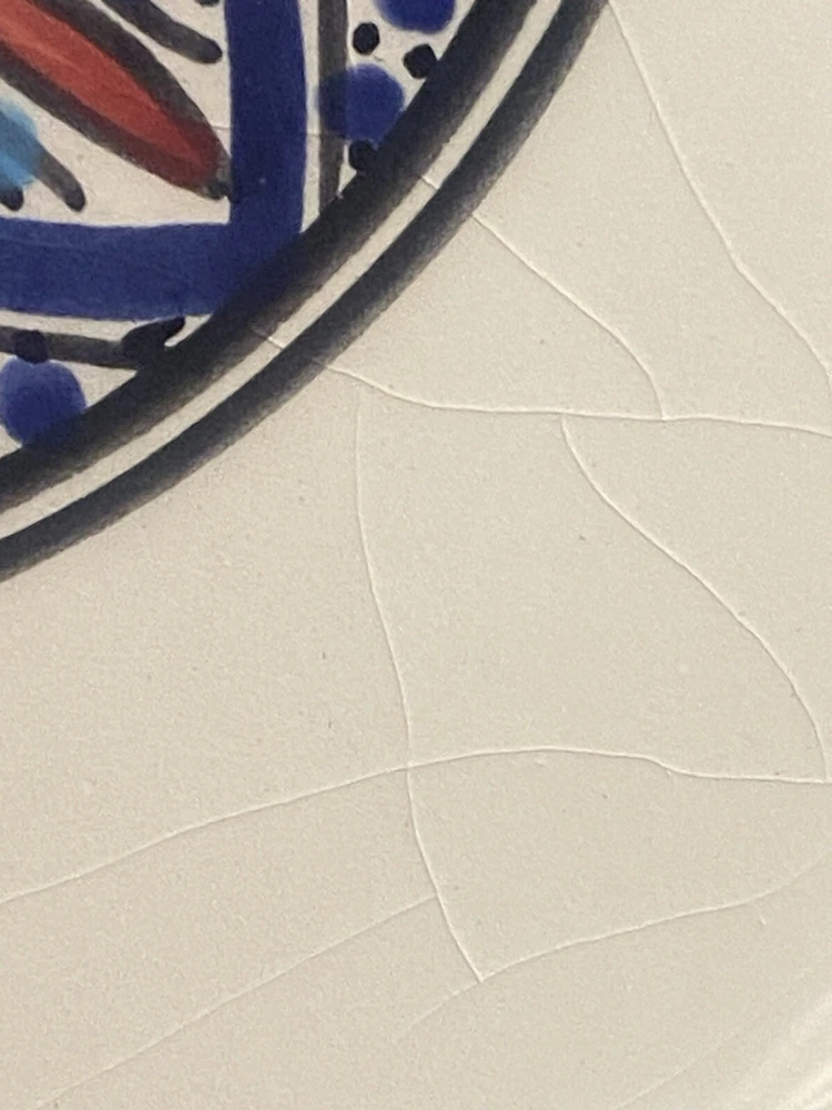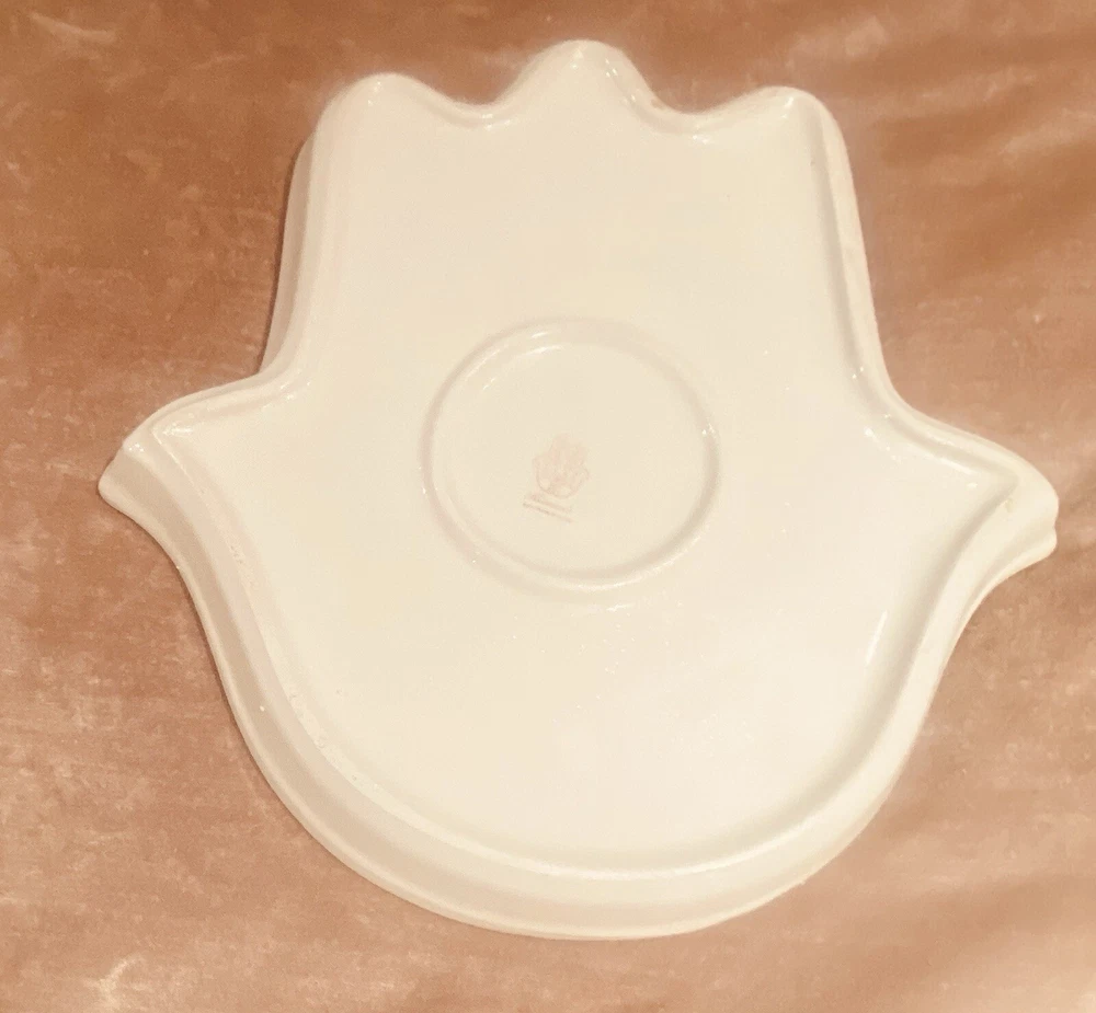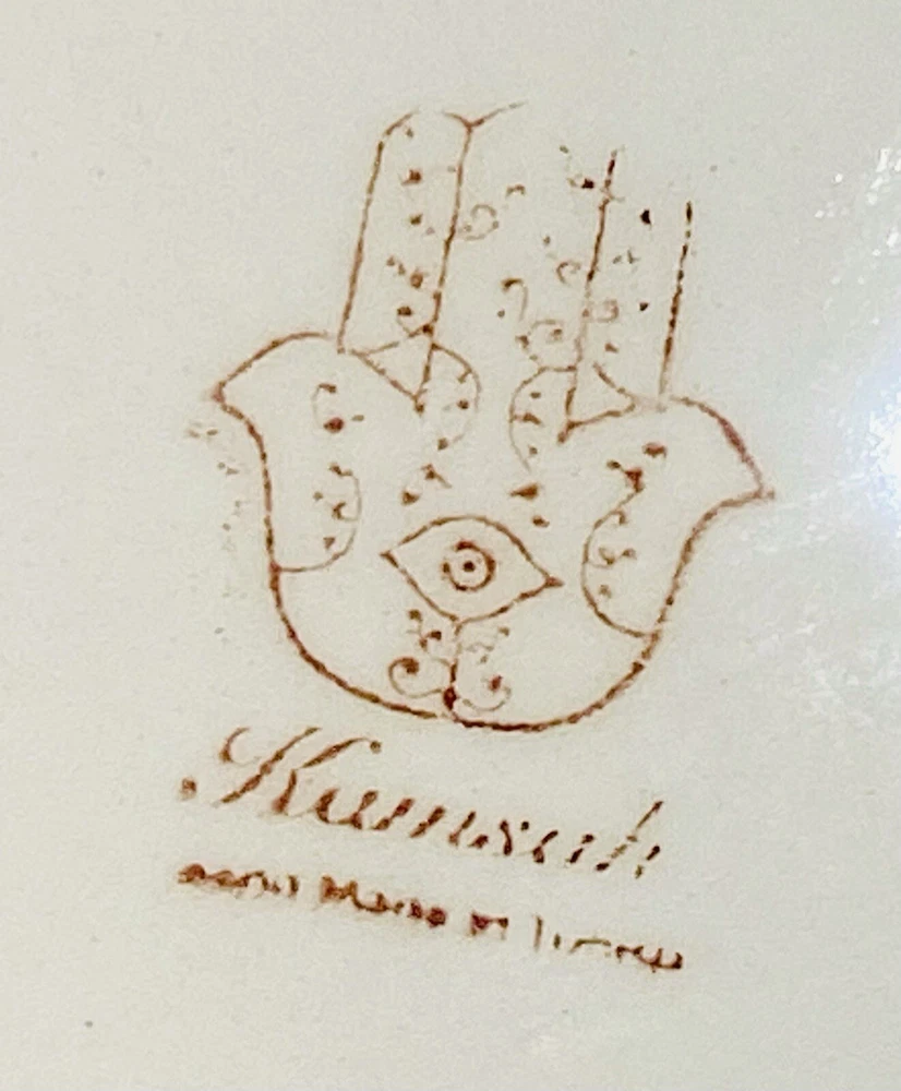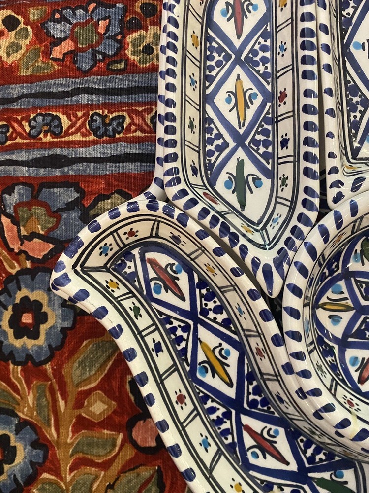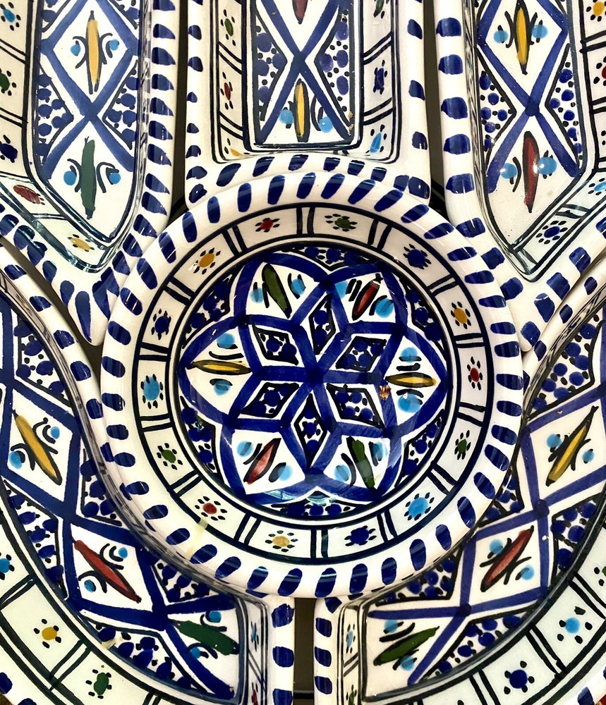 Beautifully patterned, Tunisian Hamsa or Hand of Fatima- style serving dish offers six detachable compartments for dips, sauces or nibbles. Large (12 1/2 x 12" ) dish makes a dramatic presentation on your table or buffet. Traditional and folkloric, its predominantly blue and white tones complement rustic as well as modern décor. In very good used condition, I find no chips, cracks, fading or staining. There is the generalized, allover crazing which typifies handcrafted, soft clay earthenware pieces of this type ( please see photos). Marked KAMSAH on the reverse, the stunning North African ceramic server ships USPS Ground Advantage from Los Angeles.
