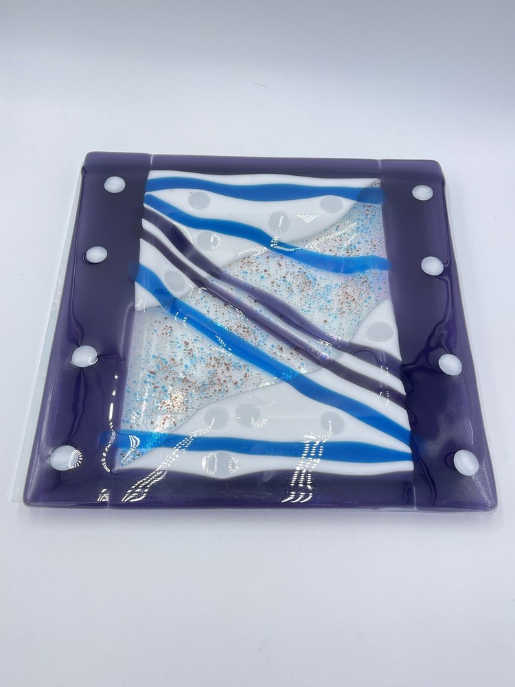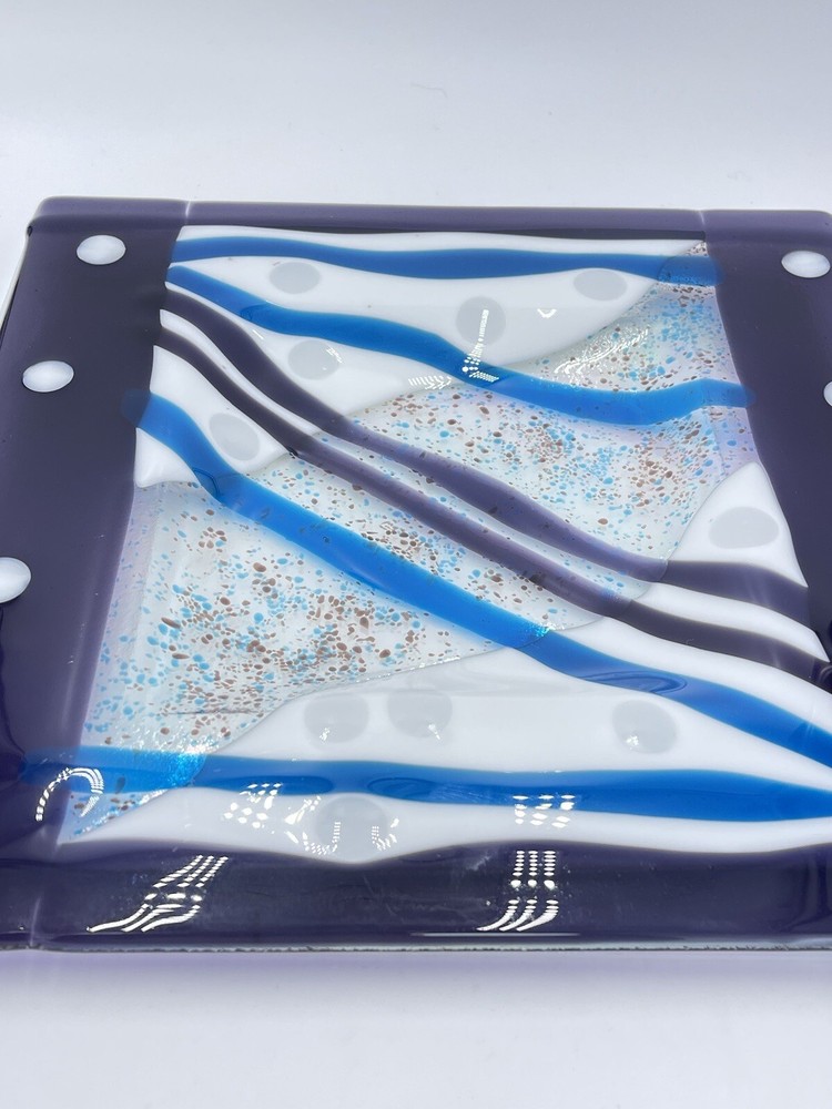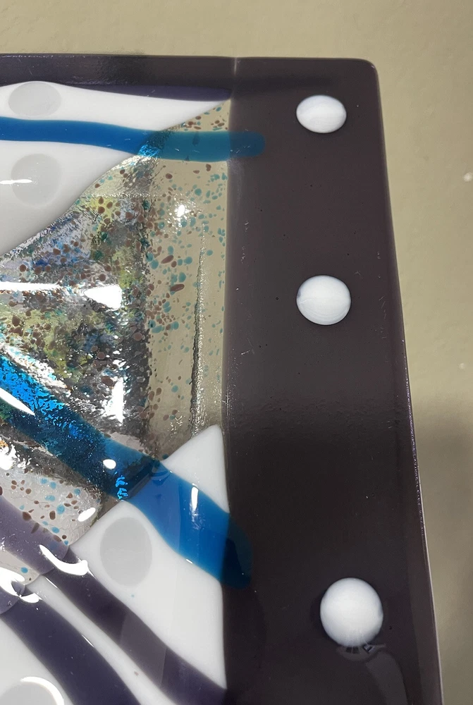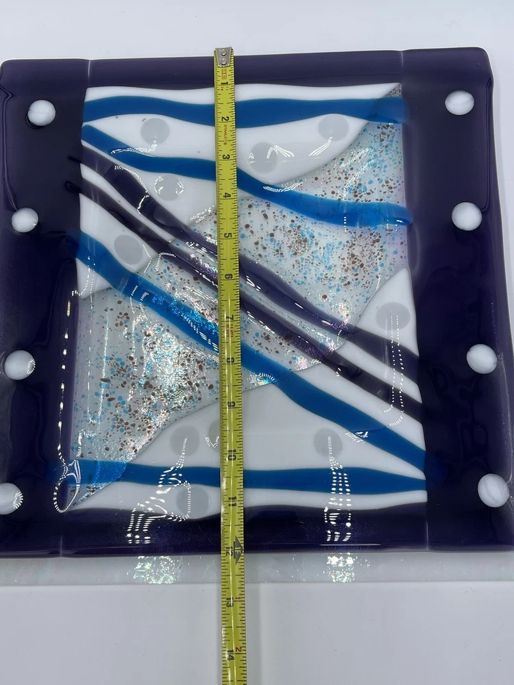 12" Large Studio Art Fused Glass Dish Platter Tray Purple Blue Abstract Design. Note: some edges have tiny scuffs, not very noticeable. Please see photos....