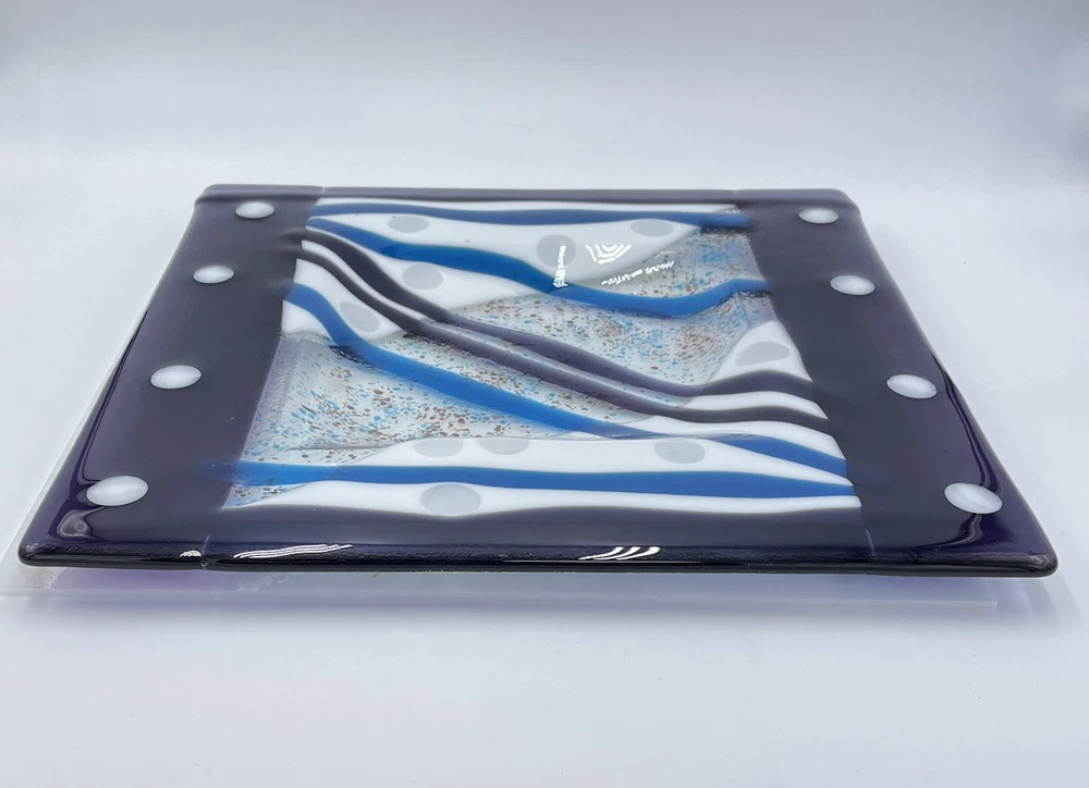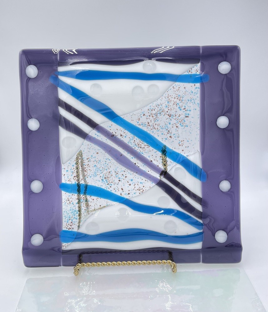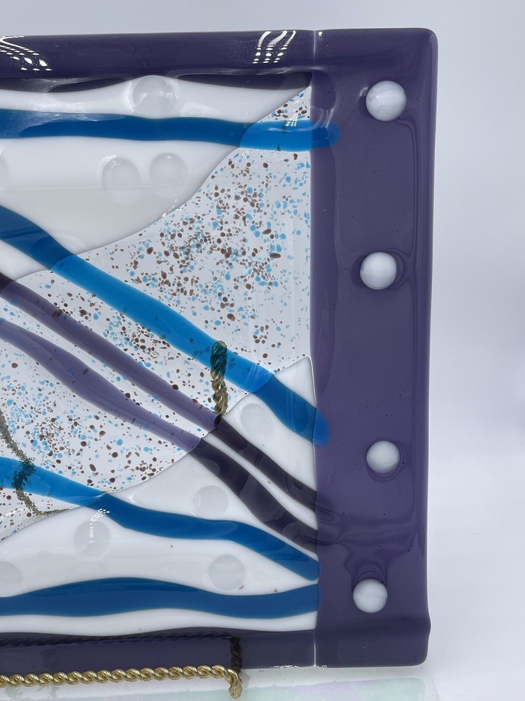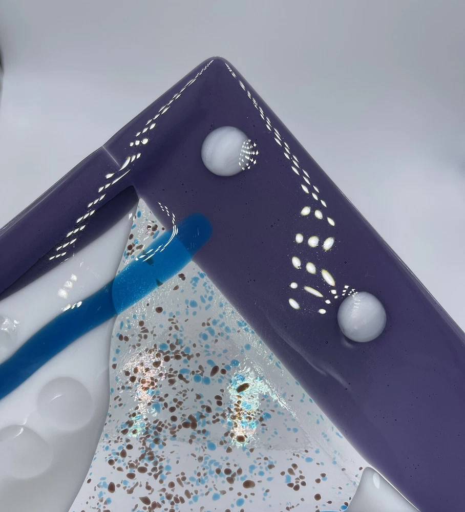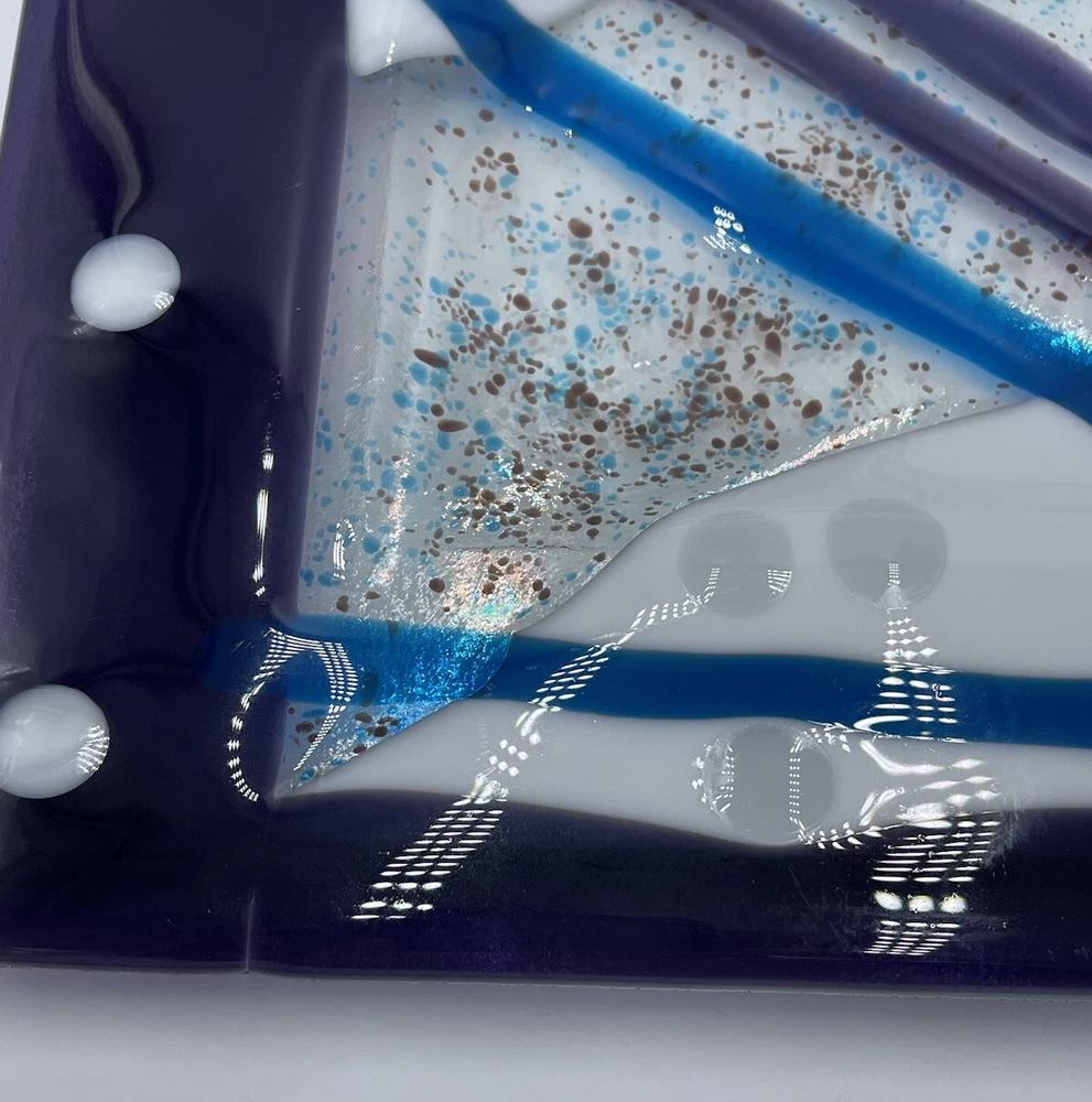 12" Large Studio Art Fused Glass Dish Platter Tray Purple Blue Abstract Design. Note: some edges have tiny scuffs, not very noticeable. Please see photos.