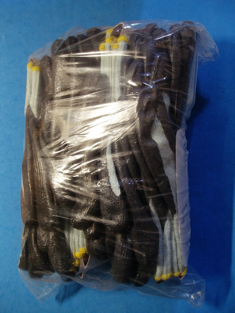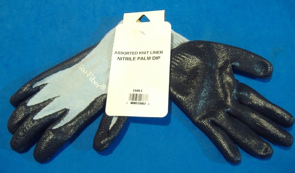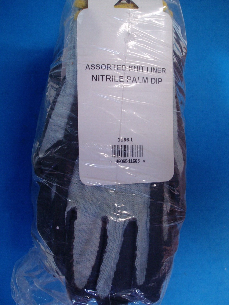This is a lot of twelve (12) pairs (dozen) of brand new large nitrile palm dipped work gloves. These gloves have a knit liner with an elastic cuff. These gloves are a multi-purpose glove for working around the house, in the garden, warehouse or shop. These fit your hand tightly so it is easy to pick up small parts and tools. Please visit my store. Thank you for looking! (B58) Medium size Gloves