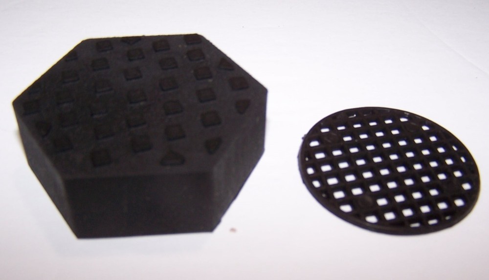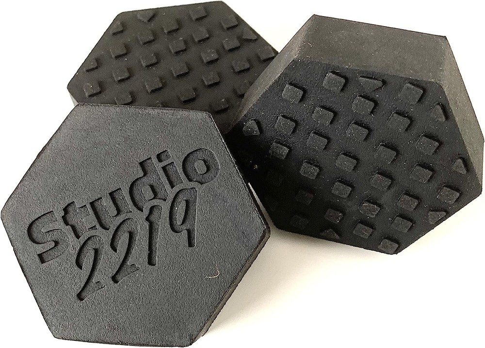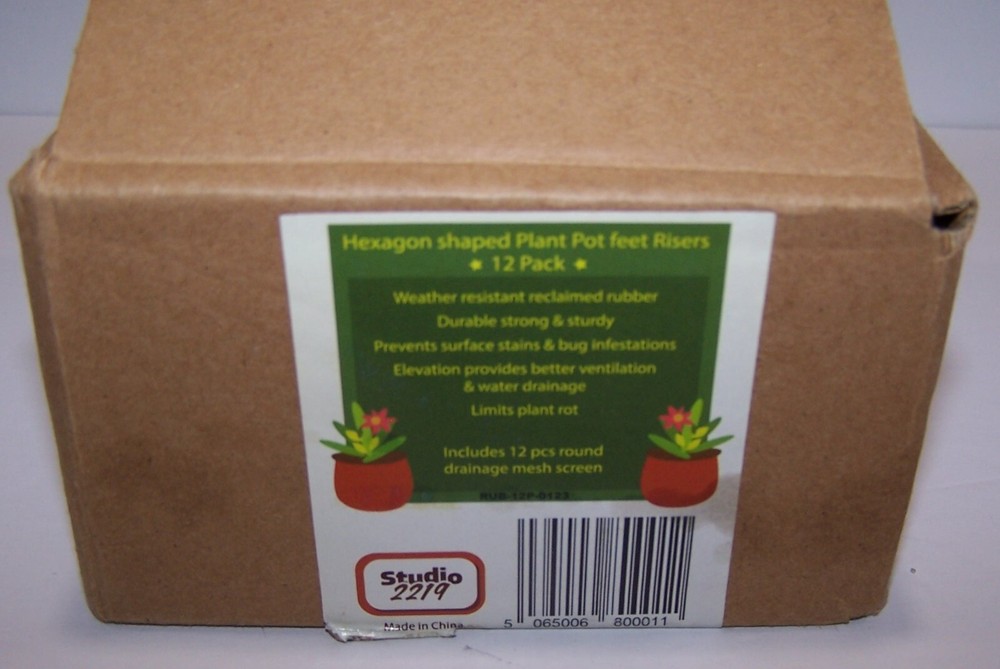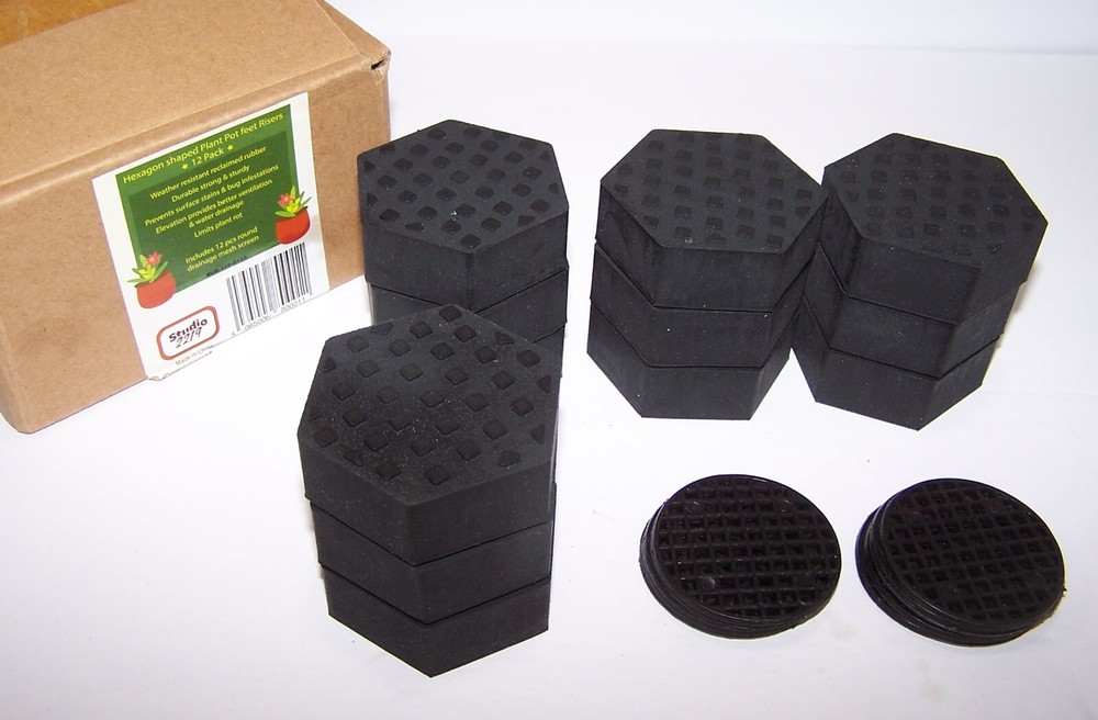 12 Pack of Rubber Hexagon Shaped Plant Stand Elevators w/Mesh Mats Brand: Studio 2219 Color: Black Material: Reclaimed Rubber Dimensions: 2" x 2" Condition: New - Open Box for photos Elevated stability The stable design of these rubber feet risers, enables you to elevate your plant pots discreetly, with the security of a stable hold and can be used with indoor & outdoor plant stands. Rest assured that your pots will be steady and secure, without the fear of them toppling over. Proper ventilation and drainage, preventing unwanted water clogging and additional build-up under your plant pots as floor plant stand, these risers come with 12 plastic drainage mesh mats to provide you with more sufficient airflow and water drainage solutions. Stain-Free Surface Box Contents: 12 Risers + 12 Mesh Mats