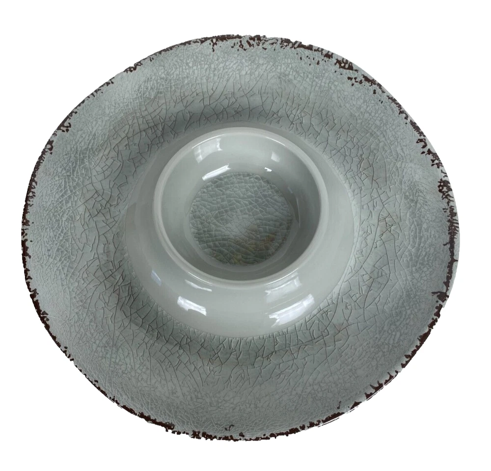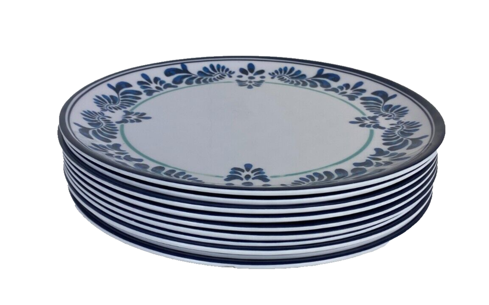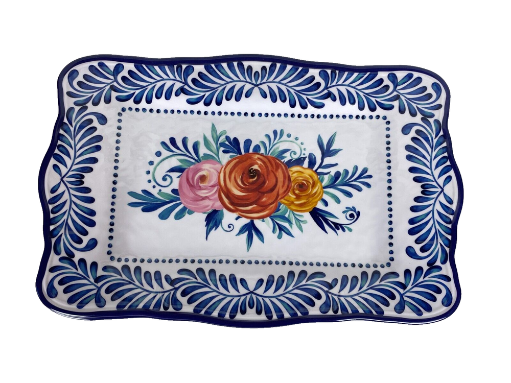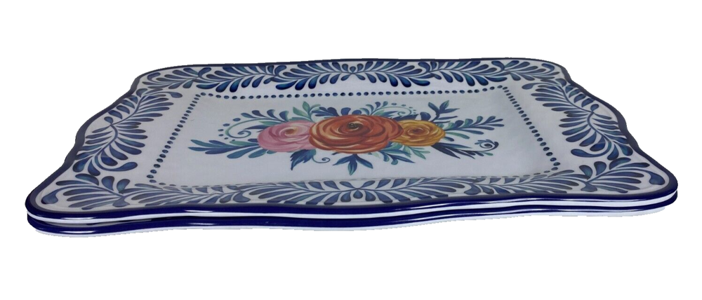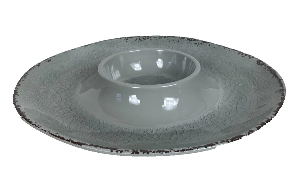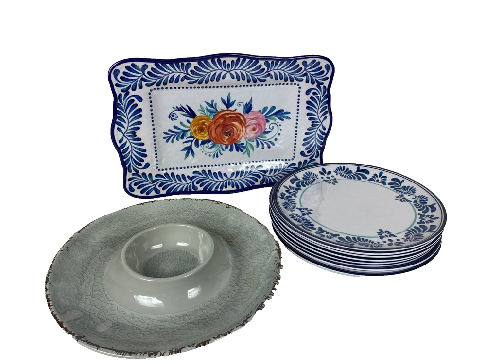 New Outdoor Melamine Party Plates, Serving Trays, and Dipping Tray This (13) Piece Set includes the following: (2) - Rectangular Serving Platter Tray: 17"L x 11"d (10) Plates: 11" Dia (1) Dipping Tray: 13" Dia Hand Wash Only Do Not Place in Microwave Dishwasher Safe - TOP SHELF ONLY
