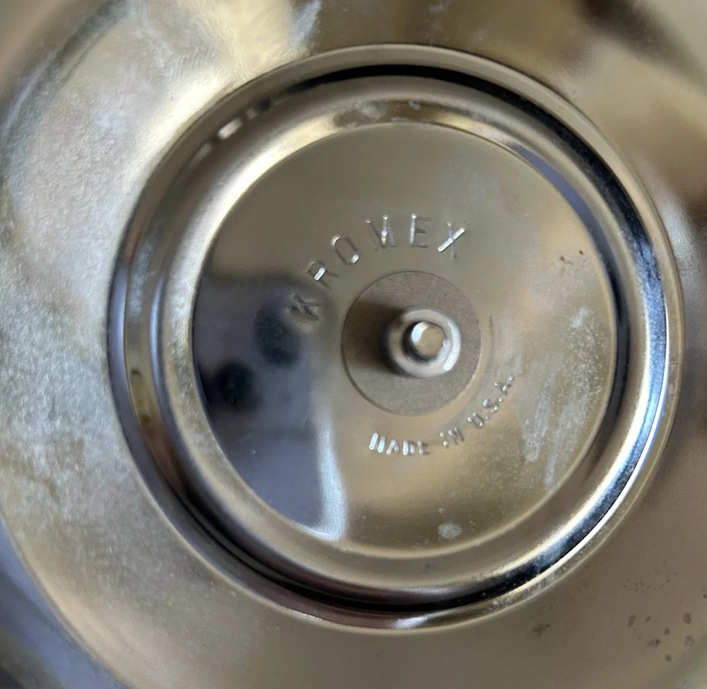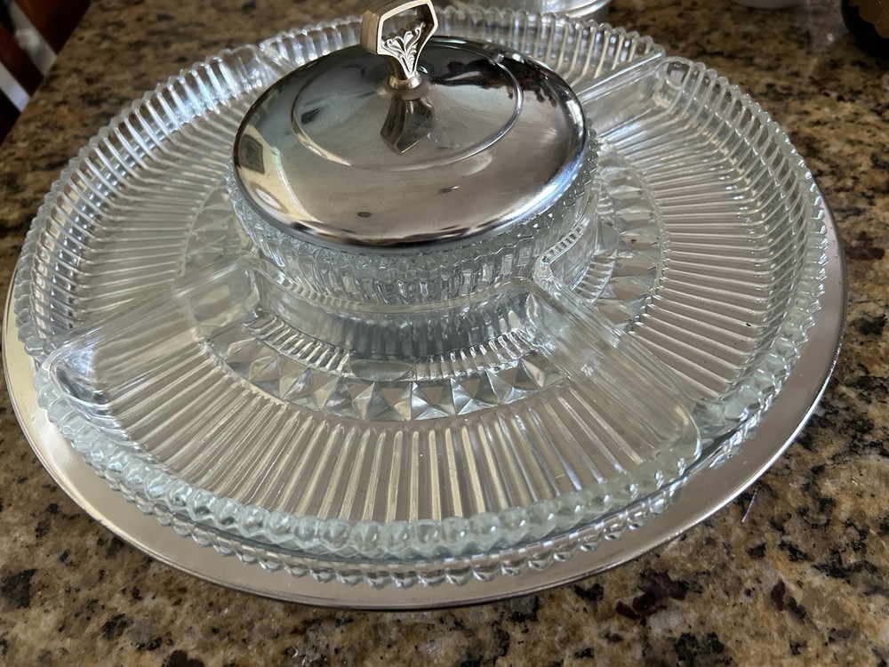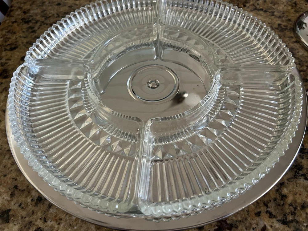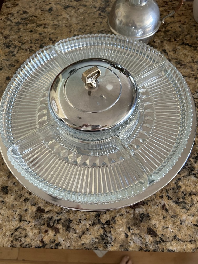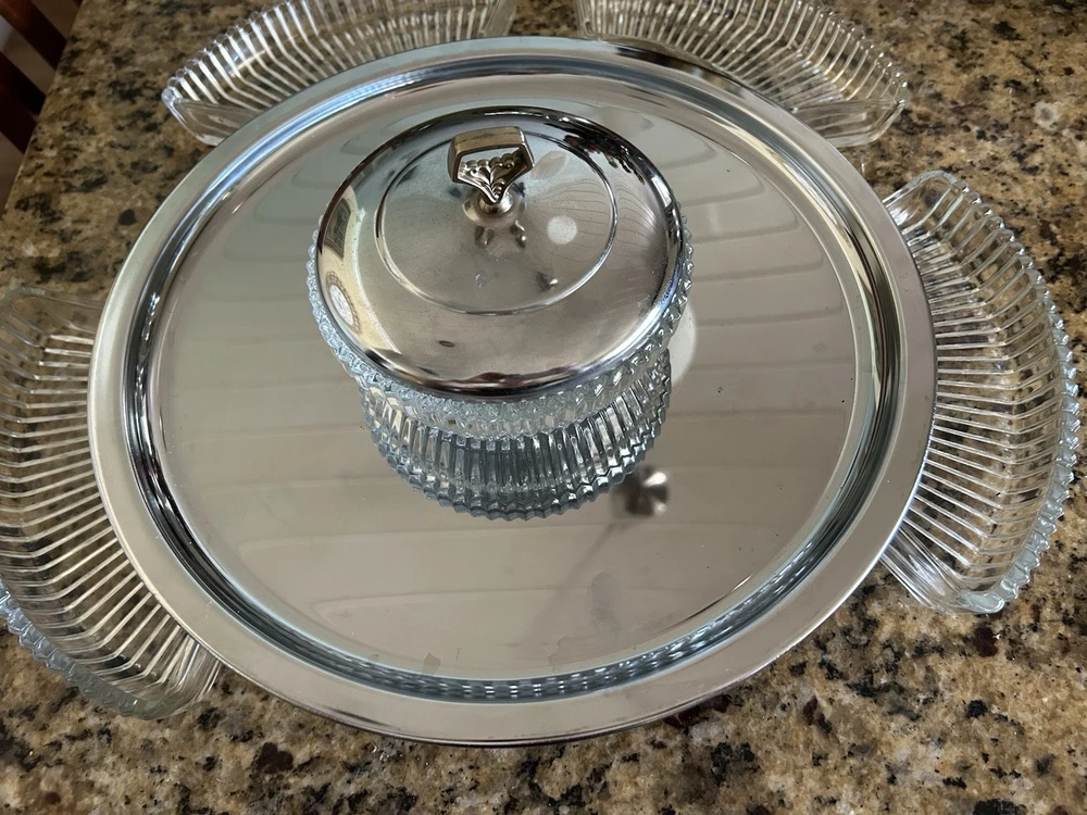 Enhance your hosting elegance with this striking 14" Kromex 7-piece Chrome and Glass Divided Lazy Susan Party Platter Dip Tray, a true gem from the 1970s. With its sleek round design, shiny chrome finish, and clear glass compartments, this tray is a blend of functionality and retro style, perfect for any occasion. The set includes a sturdy stand, a lid to keep contents fresh, and five compartments to organize a variety of appetizers and dips. Crafted in the United States, the tray's ribbed pattern and durable construction showcase the craftsmanship of the era. Whether for a dinner party or a casual gathering, this Kromex Lazy Susan is sure to impress your guests.