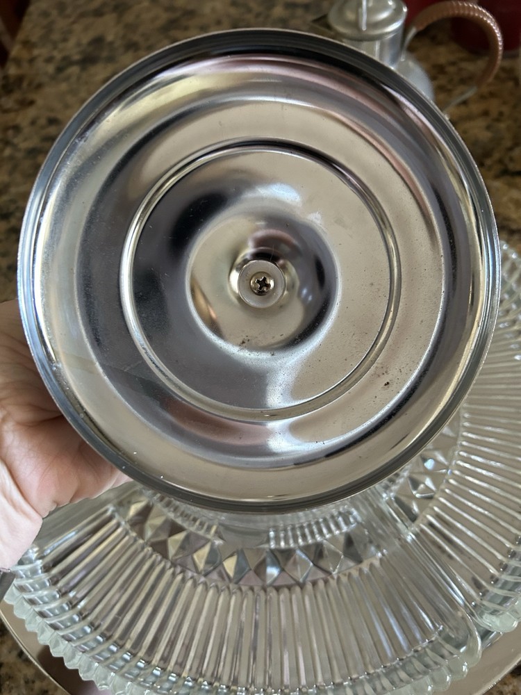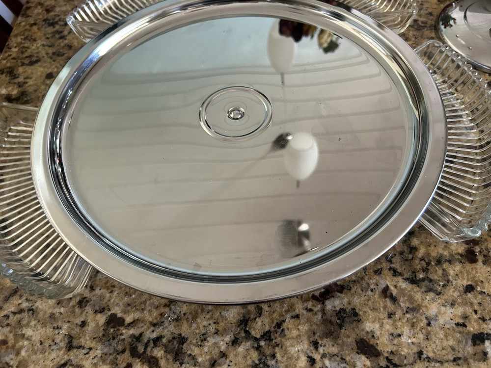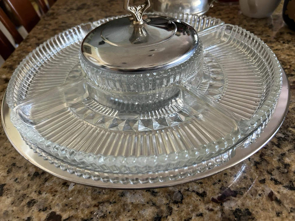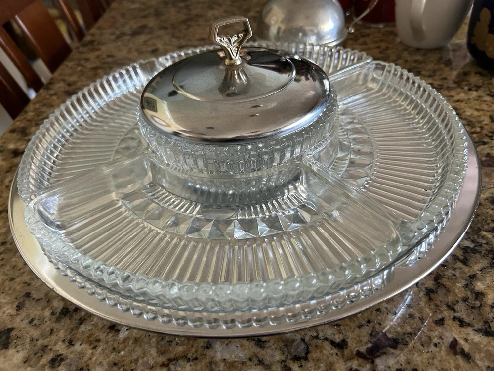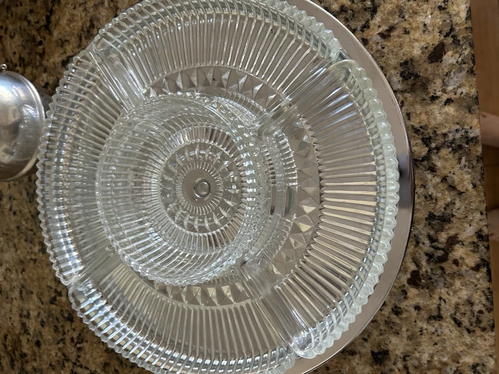 Enhance your hosting elegance with this striking 14" Kromex 7-piece Chrome and Glass Divided Lazy Susan Party Platter Dip Tray, a true gem from the 1970s. With its sleek round design, shiny chrome finish, and clear glass compartments, this tray is a blend of functionality and retro style, perfect for any occasion. The set includes a sturdy stand, a lid to keep contents fresh, and five compartments to organize a variety of appetizers and dips. Crafted in the United States, the tray's ribbed pattern and durable construction showcase the craftsmanship of the era. Whether for a dinner party or a casual gathering, this Kromex Lazy Susan is sure to impress your guests.