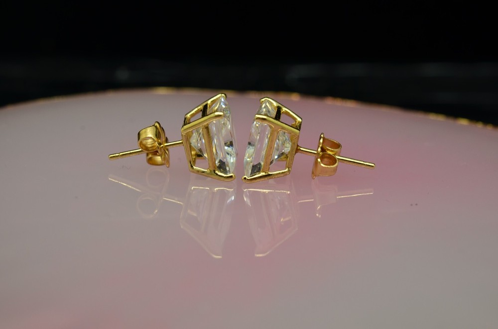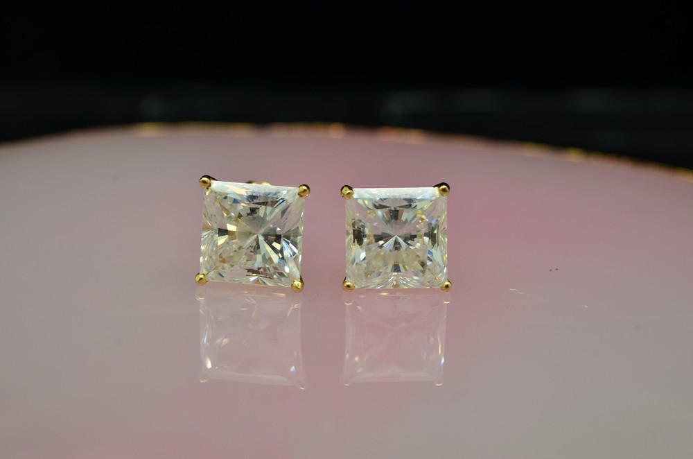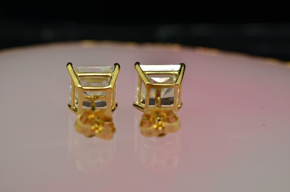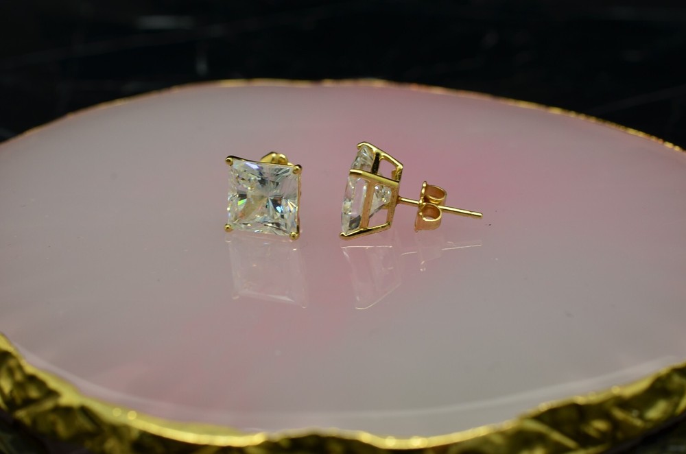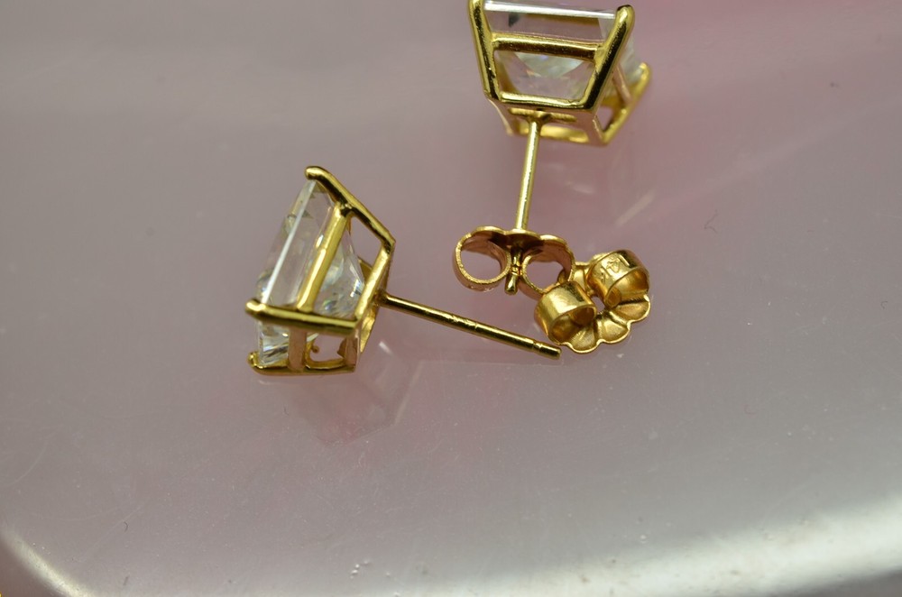 NV#D4082 BEAUTIFUL 14K YELLOW GOLD PRINCESS CUT CUBIC ZIRCONIA STUD EARRINGS -VERY PRETTY EACH CUBIC ZIRCONIA IS IN A FOUR PRONG SETTING AND IS 8mm SQUARE IN SIZE HALLMARKED: "14K" ON BOTH THE POSTS AND THE BUTTERFLY BACKS THESE EARRINGS ARE SOLID 14K GOLD, NOT PLATED, FILLED OR LAYERED STUNNING DESIGN THAT IS SURE TO GET NOTICED HEIGHT: 8.7mm WIDTH: 8.6mm CONVERSION: 25.4mm = 1 INCH WEIGHS: 3.2 GRAMS