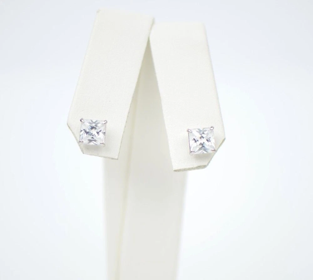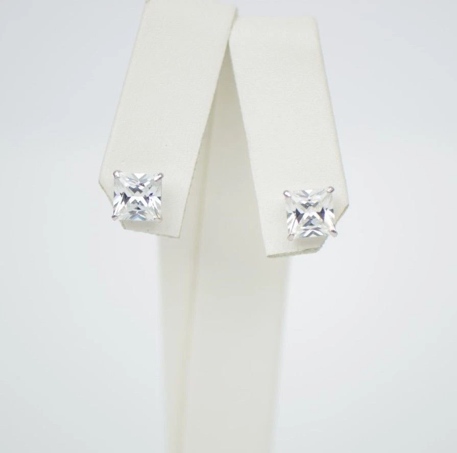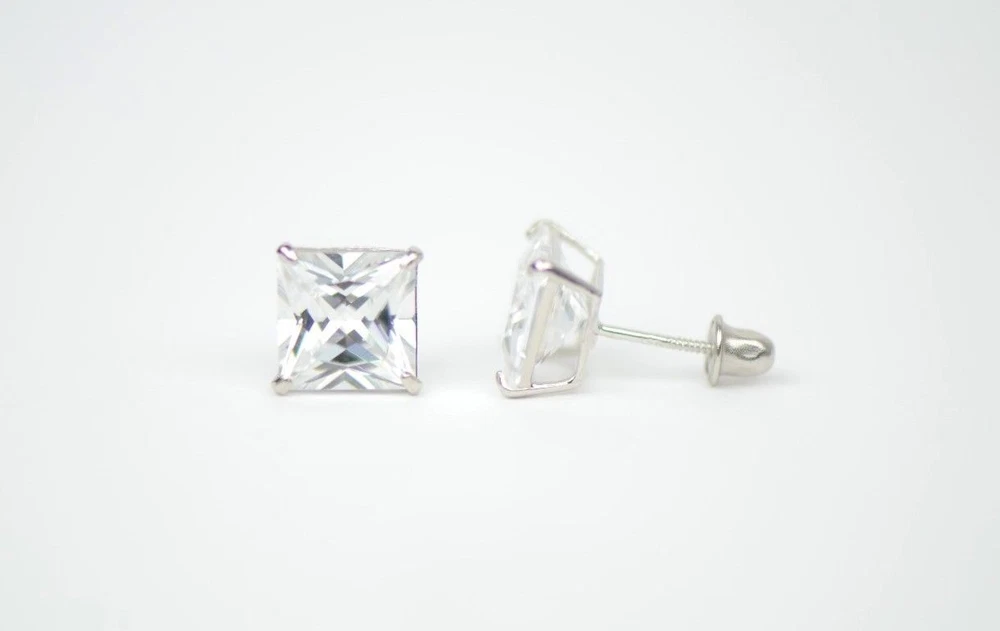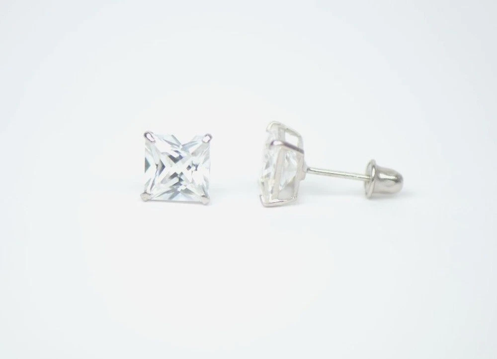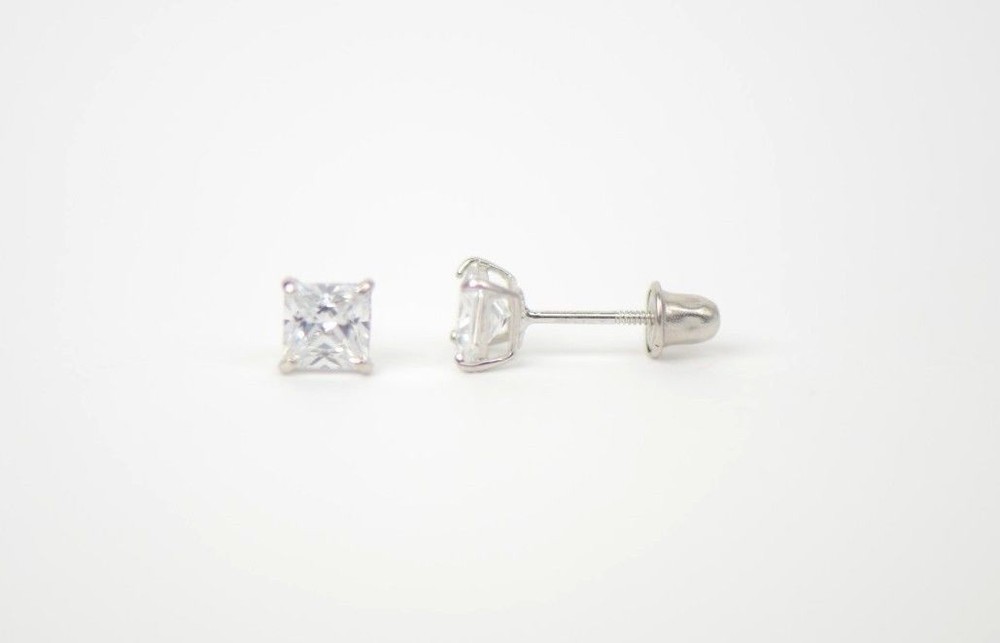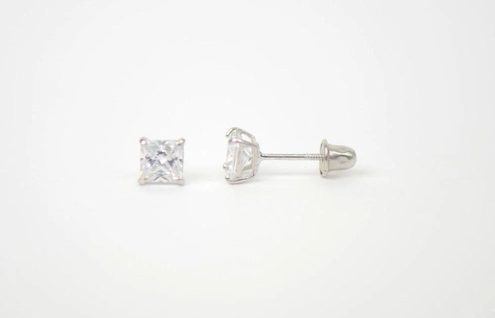This is 14K White Gold screw Back Earrings with CZ (Cubic Zirconia stone) that have become a classic. You can wear them day-by-day they will match with any close. The earrings are studs with the post which length is 8 mm. The stone is square shape. The stone secure with Prong Set. This pair of earrings comes with a free gift box (colors of gift box will be chosen randomly). We guarantee that our product is 14K Gold Available in 3, 4, 5, 6, 7mm with screw back, also we have 3, 4, 5, 6, 7mm earrings with push back. Also in white and yellow gold.