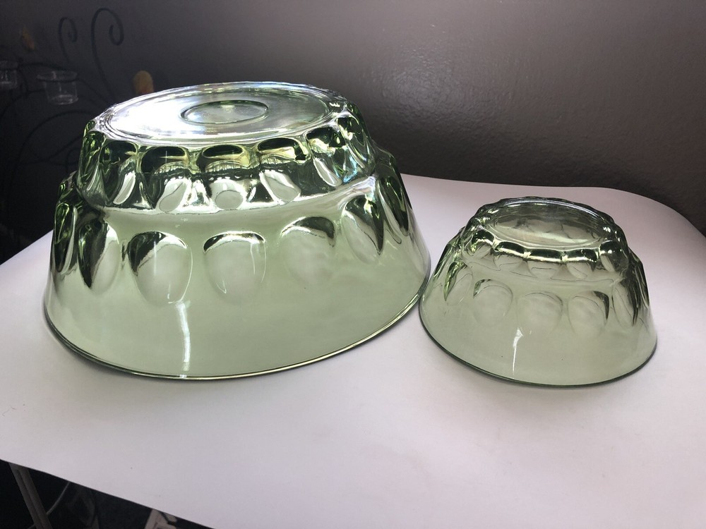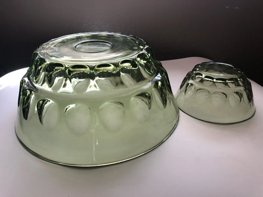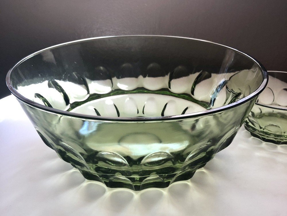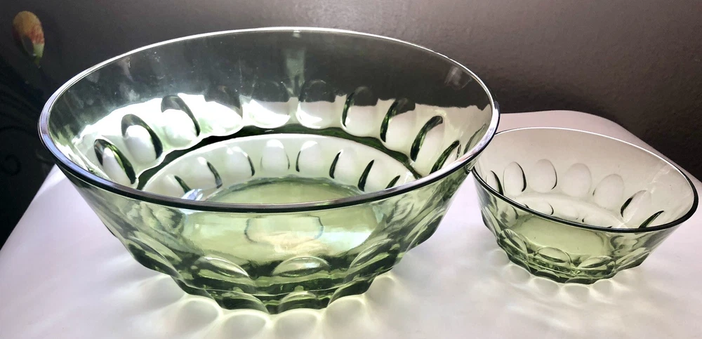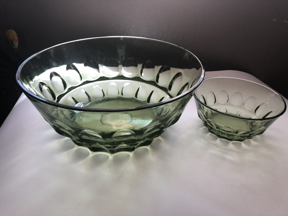 This two-piece vintage thumbprint serving set is a true gem for any occasion. The round 10.25" serving bowl and 5.25" small dip bowl in a beautiful avocado green color are made of high-quality glass material and have a glossy finish. The set includes a large and small bowl, both stackable and dishwasher safe for easy cleaning. Crafted by Hazel-Atlas in late 20th century mid-century modern style, this decorative art glass production is perfect for all occasions. The set is machine washable up to 100°F and can be a great addition to any pottery and glass collection. There are no chips or cracks on either bowl but there are some scattered superficial scratches Not very noticeable.