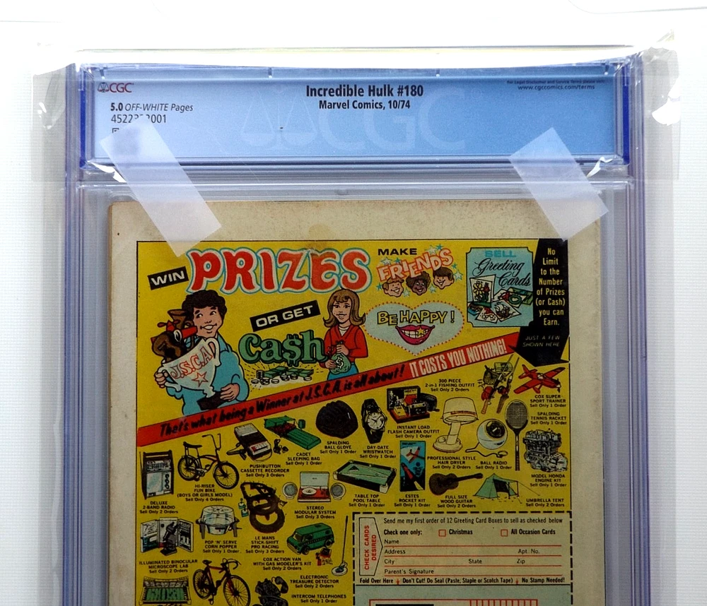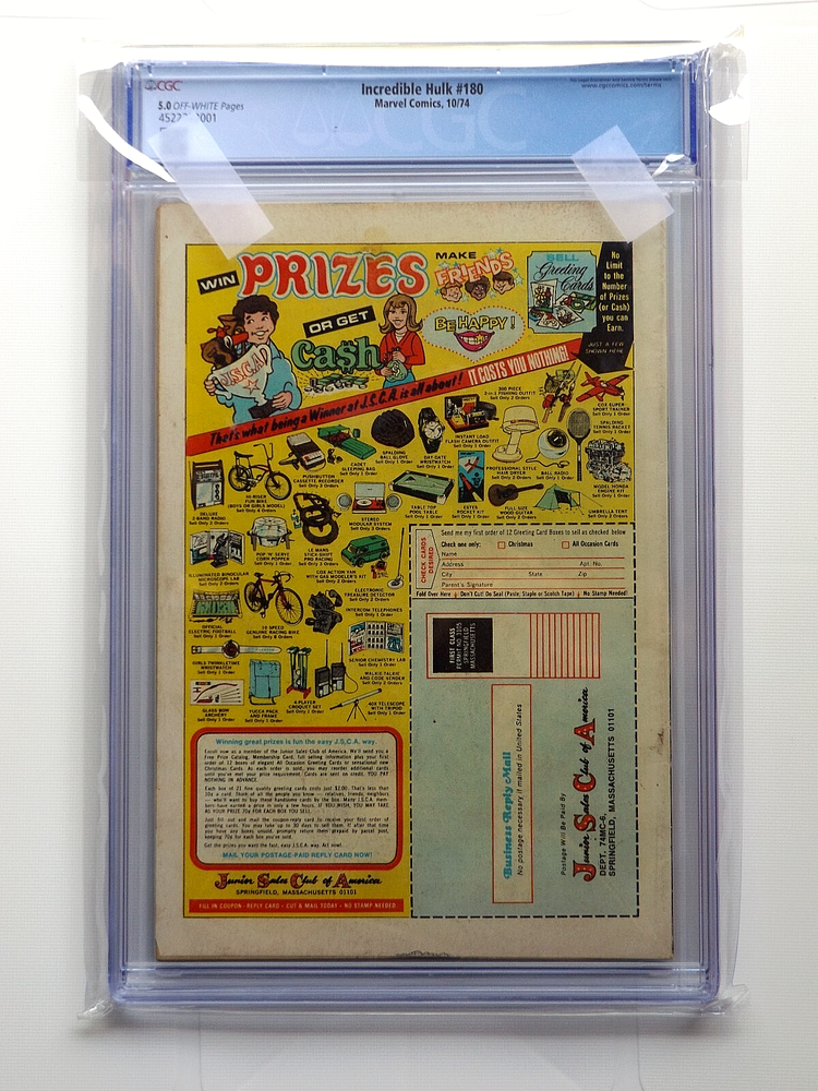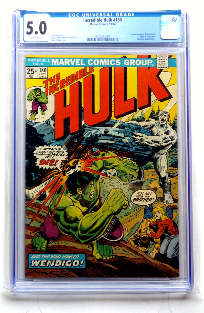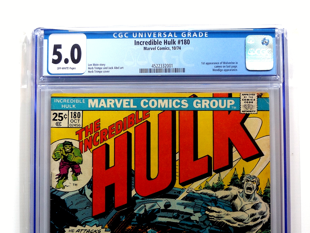THANKS FOR STOPPING! PLEASE READ CAREFULLY. ITEM DESCRIPTION: MARVEL COMICS, THE INCREDIBLE HULK, #180, 1974. KEY BRONZE AGE COMIC FEATURES THE FIRST APPEARANCE OF WOLVERINE IN CAMEO. VERY SIGNIFICANT VINTAGE X-MEN KEY COMIC. YOU WILL RECEIVE THE EXACT COMIC IN THIS AUCTION. ITEM CONDITION: BEAUTIFUL BOOK, BRIGHT COLORS , BLUE LABEL, GRADED (5.0) VERY FINE BY CGC, WITH OFF-WHITE PAGES. CGC IDENTIFIER NUMBER #4522332001. THE CASE IS IN EXCELLENT CONDITION AND IS ENCLOSED IN A MYLAR GRADED COMIC SLEEVE. PLEASE NOTICE ALL OF THE INCLUDED PHOTOS AND ASK ANY QUESTIONS IF NEEDED. YOU WILL RECEIVE THE EXACT COMIC PICTURED IN THE PHOTOS OF THIS AUCTION. I DO NOT USE STOCK PHOTOS. IT WILL BE SHIPPED SAFELY WITH PLENTY OF SHIPPING PROTECTION AND IN A PRIORITY MAIL BOX. IT WILL BE SHIPPED VERY SECURELY AS I AM A COLLECTOR TOO AND UNDERSTAND HOW CRUCIAL PROTECTION CAN BE. ADDITIONALLY, IF YOU EVER HAVE ANY CONCERN WITH OUR TRANSACTION, PLEASE ALWAYS FEEL COMFORTABLE REACHING OUT. I AM ALWAYS HAPPY TO ASSIST IF AT ALL POSSIBLE. *PLEASE NOTE* I OFFER A FULL MONEY BACK (LESS SHIPPING) GUARANTEE IF YOU ARE NOT TOTALLY PLEASED WITH THIS OR ANY COMIC I HAVE LISTED. ITEM NOTES: WHILE I AM NOT A PROFESSIONAL GRADER, I DO TAKE GREAT CARE IN EXAMINING A COMIC/ITEM PRIOR TO SALE AND TRY TO MENTION ANY DEFECT(S) I MAY FIND. THE RATING I USE IS MY OPINION BASED ON THE ACCEPTED RULES FOR EACH GRADING CATEGORY. PLEASE UNDERSTAND IF I MISS SOMETHING, IT WAS AN OVERSIGHT AND NOT INTENTIONAL. AS NOTED ABOVE, I ACCEPT ALL RETURNS FOR ANY REASON..... PLEASE ASK ANY QUESTIONS IF NEEDED AND EXAMINE ALL PHOTOS CAREFULLY. PLEASE FEEL FREE TO MAKE AN OFFER ON THIS OR ANY AUCTION I HAVE LISTED! SHIPPING : ALL SHIPPING WILL BE COMPLETED THROUGH USPS MAIL AND TO THE USA, WILL BE A RATE OF $11.50 FOR THIS C OMIC WITH JUST .99 PER COMIC EXTRA FOR EACH ADDITIONAL BOOK. I WILL SHIP BY USPS PRIORITY MAIL (2-3 DAYS SHIPPING, PLUS UP TO 2 DAYS HANDLING, POSSIBLY LESS.) IT WILL BE $19.99 FOR INTERNATIONAL DESTINATIONS (WITH FIRST CLASS INTERNATIONAL USPS MAIL.) I DO COMBINE SHIPPING CHARGES SO PLEASE FEEL FREE TO ADD ITEMS TO YOUR ORDER! I WILL SHIP YOUR ITEM WITHIN 2 TO 3 DAYS OF HAVING RECEIVED PAYMENT AND WILL LEAVE IMMEDIATE FEEDBACK AS PER EBAY POLICY. I ASK THAT YOU PLEASE LEAVE ME PROMPT FEEDBACK WHEN YOU RECEIVE YOUR ITEM. RETURNS : I ACCEPT RETURNS IN THE UNLIKELY EVENT YOU ARE DISPLEASED WITH YOUR PURCHASE. JUST SEND IT BACK WITH A QUICK EMAIL NOTIFYING ME OF ITS ARRIVAL. NO QUESTIONS ASKED. I ASK YOU DO THIS PRIOR TO LEAVING FEEDBACK SO I AM ABLE TO CORRECT ANY ISSUE YOU MAY HAVE. ALL ITEMS COME FROM A SMOKE FREE HOME AND FROM A FELLOW COLLECTOR. PLEASE PAY PROMPTLY SO THAT I CAN SHIP YOUR ITEM AS SOON AS POSSIBLE. IF YOU HAVE ANY QUESTIONS FOR ME, PLEASE FEEL FREE TO EMAIL!