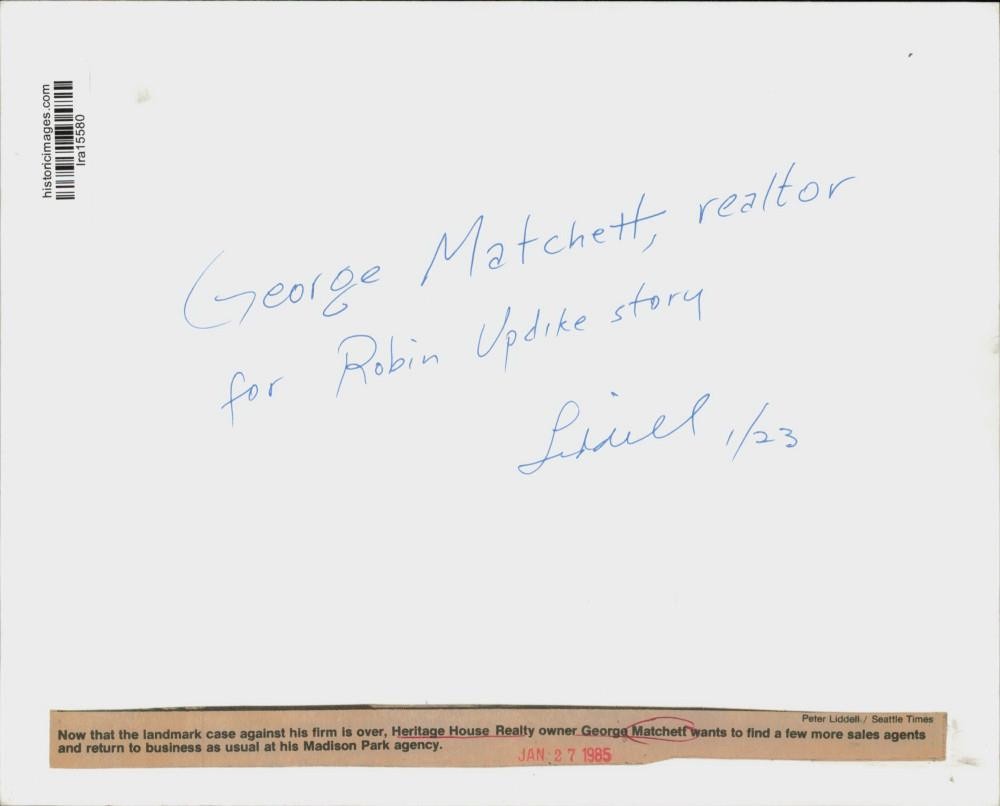 ebay template Note: Please study the images carefully to determine the condition of this vintage photograph, as it may not be in perfect condition. It may contain wrinkles, cracks, and possibly even tears due to its age and how it was handled before it got to us. A scanner may interpret colors and contrast differently than human eyes will, so it is possible that the actual photograph may be slightly darker or lighter in person. This vintage photograph is offered for sale as a collectible item and conveys no transfer of copyright. 1985 Press Photo Heritage House Realty Owner George Matchett in Madison Park This is an original press photo. Now that the landmark case against his firm is over, Heritage House Realty owner George Matchett wants to find a few more sales agents and return to business as usual at his Madison Park agency.Photo measures 10 x 8inches. Photo is dated 01-27-1985. PHOTO FRONT PHOTO BACK Historic Images Part Number: lra15580 Sell Smarter with Kyozou. Inventory and Ecommerce Management