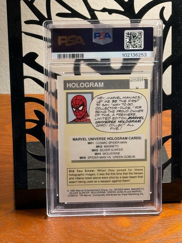 The product is a 1990 Marvel Universe Wolverine hologram trading card featuring Hugh Jackman as Wolverine from the X-Men. The PSA 8 grades card, manufactured by Impel in the United States, is part of the Marvel franchise and showcases Wolverine from the Deadpool movie. It is made of card stock and belongs to the standard size category. The card is non-autographed and is in English language.
