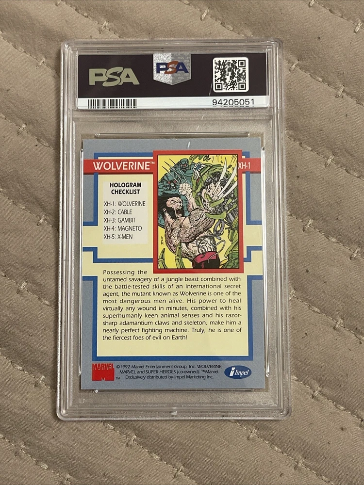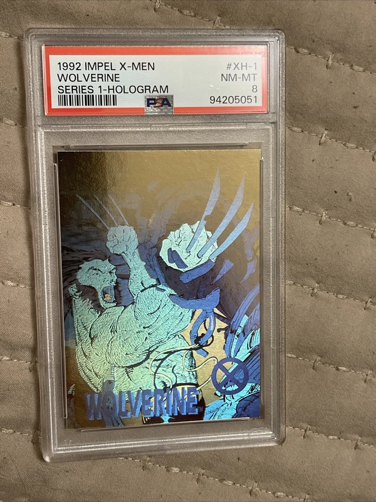 Up for sale is a 1992 Impel X-Men Wolverine Hologram #XH-1 trading card. This card features a stunning hologram of the iconic Marvel character Wolverine, also known as Logan. The card is made of high-quality card stock and is in near mint condition, with a PSA 8 NM-MT grading. This collectible card is a must-have for any X-Men or Marvel fan, especially those who love Wolverine. The card comes from the X-Men Series 1 set and features Jim Lee's artwork. It is an original, non-sport trading card that is perfect for collectors of all ages. Don't miss your chance to own this rare and valuable card!