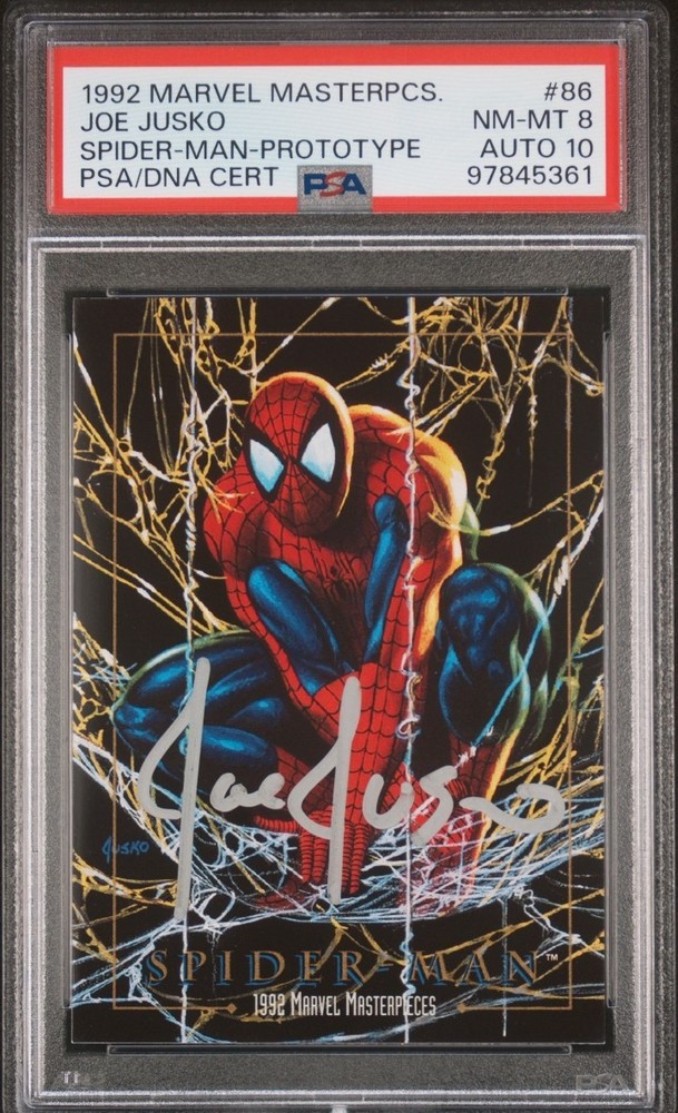 This is a 1992 Marvel Masterpieces Spider-Man trading card featuring an autograph by illustrator Joe Jusko. It is a PROTOTYPE card and part of the Marvel franchise, specifically related to characters like Thor, Deadpool, Wolverine, and The Avengers. The card is a collectible item in the Non-Sport Trading Card category.