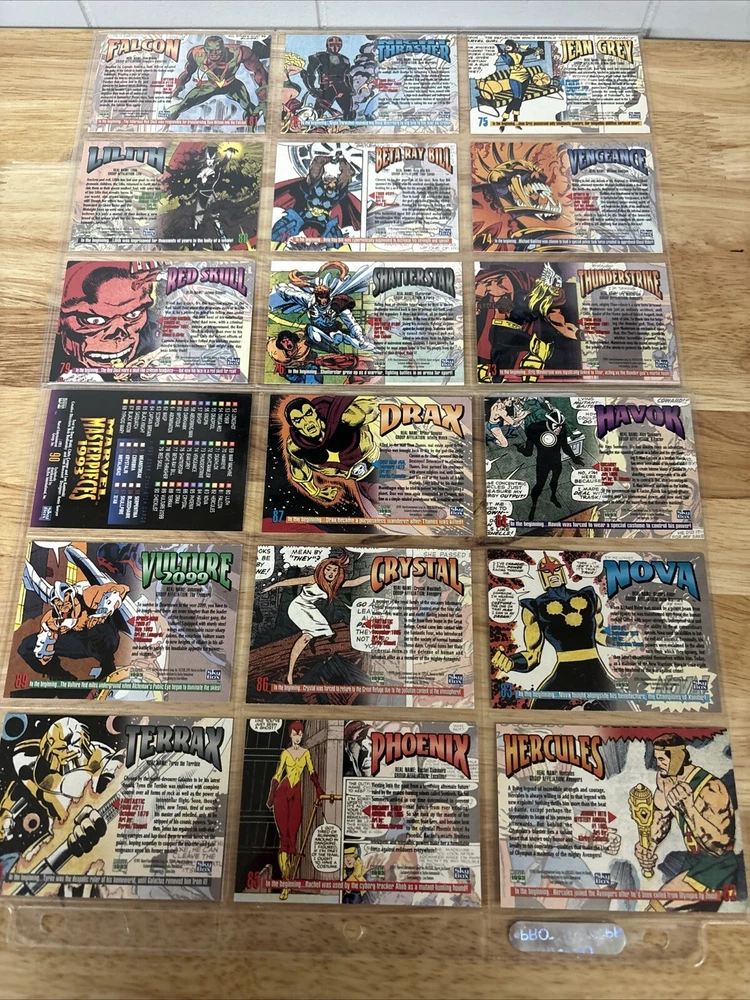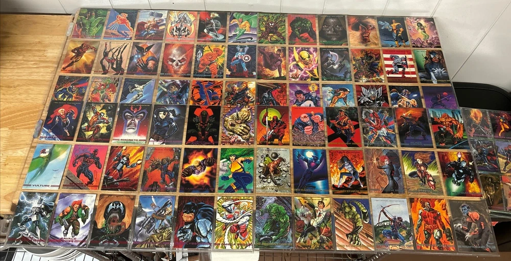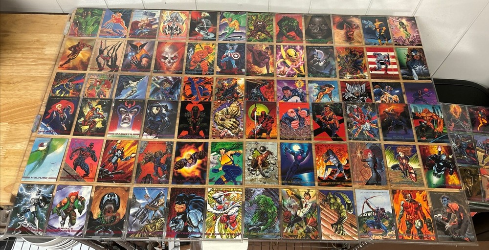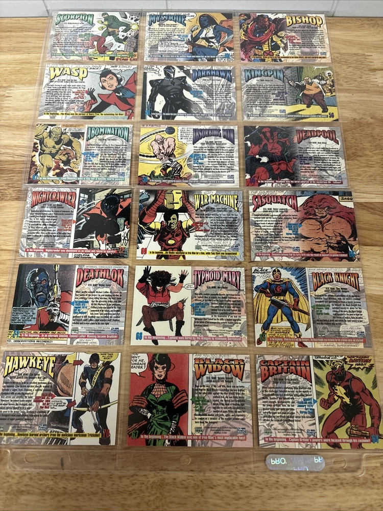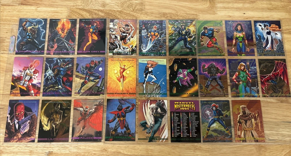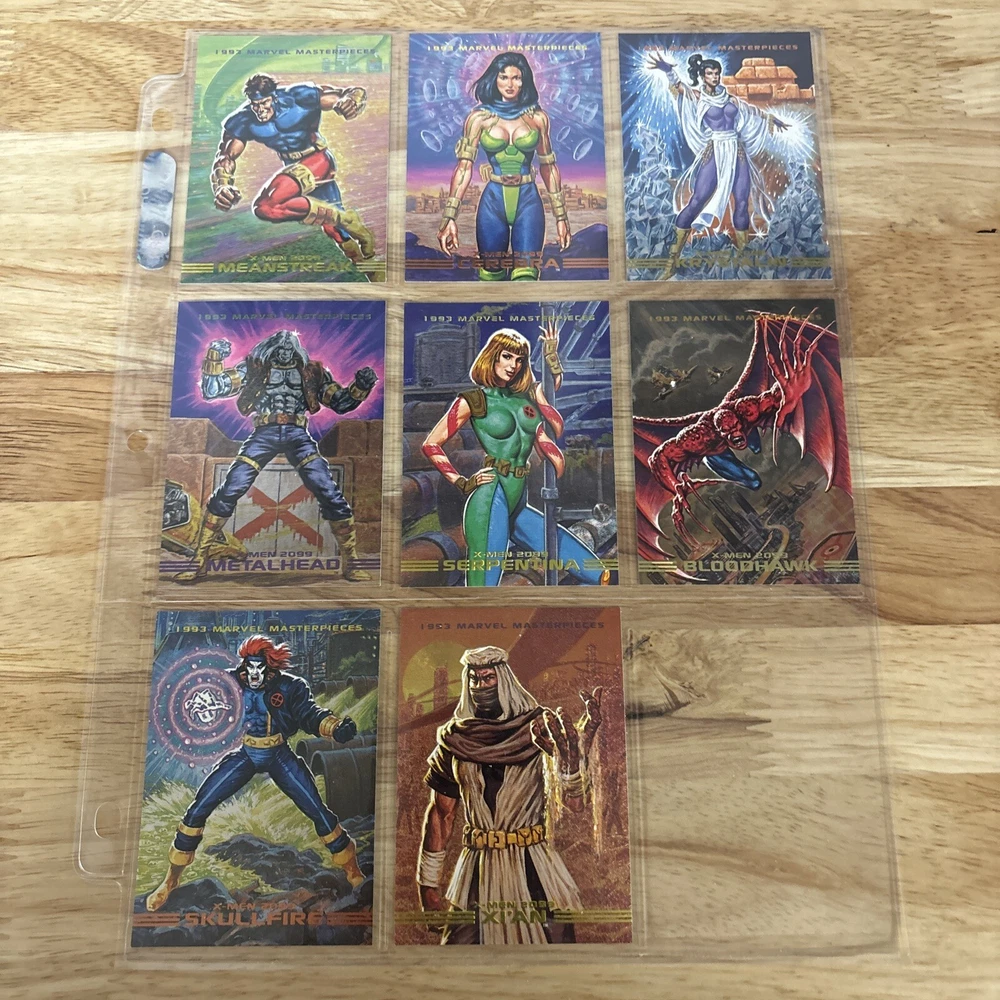 This is a rare and complete set of 1993 Marvel Masterpieces X-Men trading cards, featuring 98 cards of your favorite superhero characters such as Deadpool, Magneto, Storm, Captain America, Tony Stark, Iron Fist, Professor X, Beast, Hulk, Thor, Cyclops, Spider-Man, Wolverine, Phoenix, Jean Elaine Grey, Thanos, and Black Widow. The cards are made of high-quality card stock material and come with a checklist and foil features. The set is an original and licensed reprint from the United States, manufactured by Fleer in 1992. The illustrators for this set are Greg Hildebrandt, Joe Jusko, and Tim Hildebrandt, with Joe Jusko being the featured artist. The cards are in standard size and are perfect for collectors and fans of the X-Men franchise and superhero genre. This set is a must-have for any vintage or non-sport trading card collector. Cards are in mint to near mint condition and come in sleeves. Includes the original 90 cards as well as the eight X-Men 2099 Dyna-Etch cards. Feel free to contact me with any questions you may have.