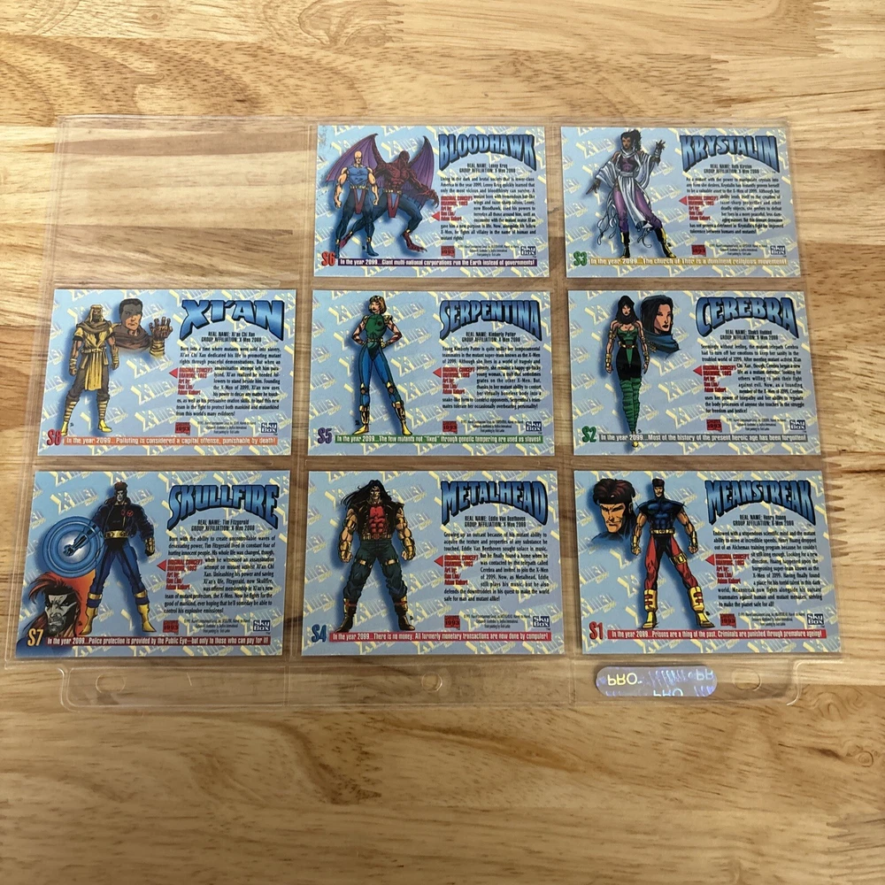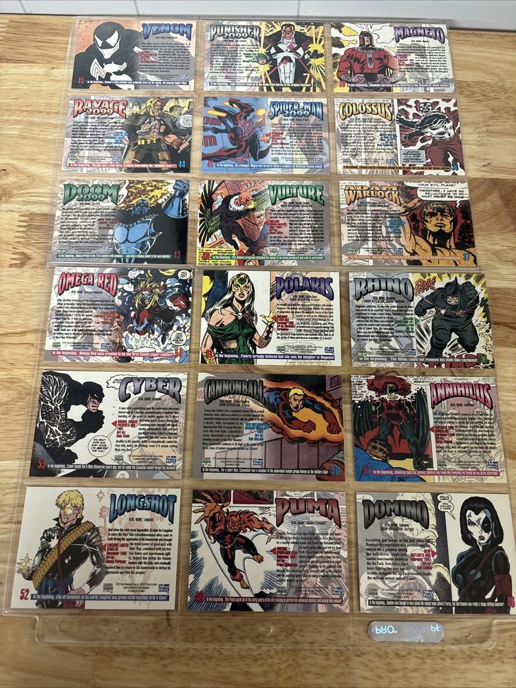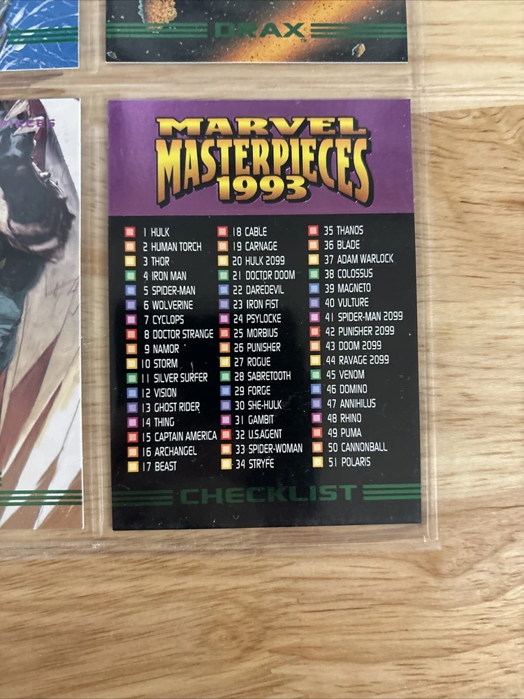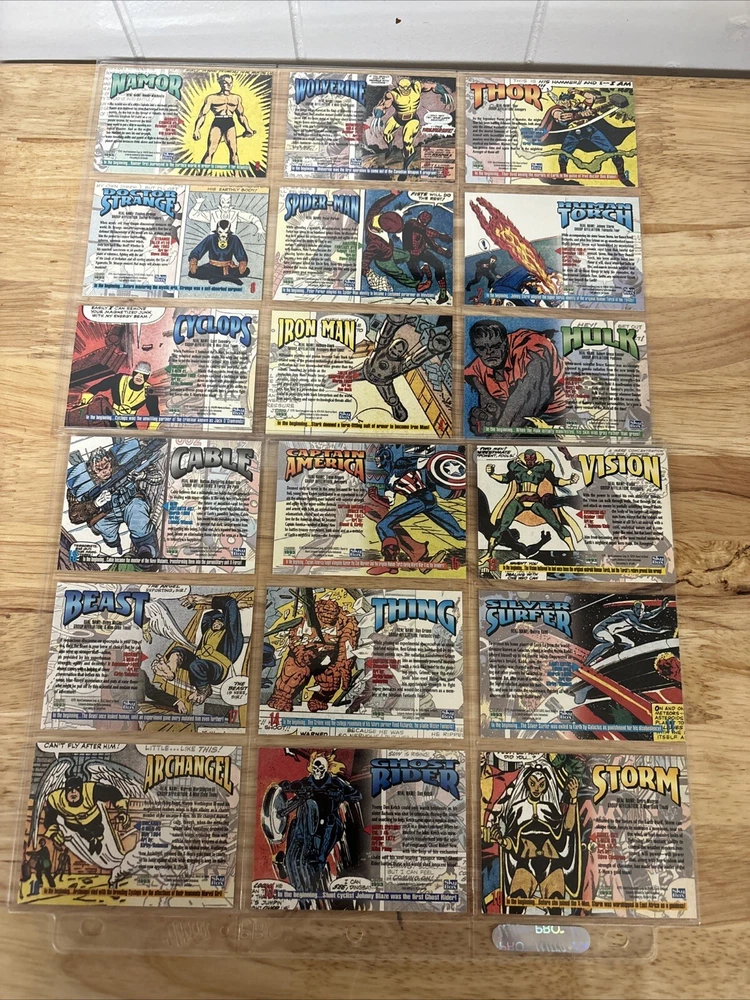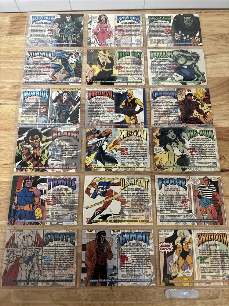 This is a rare and complete set of 1993 Marvel Masterpieces X-Men trading cards, featuring 98 cards of your favorite superhero characters such as Deadpool, Magneto, Storm, Captain America, Tony Stark, Iron Fist, Professor X, Beast, Hulk, Thor, Cyclops, Spider-Man, Wolverine, Phoenix, Jean Elaine Grey, Thanos, and Black Widow. The cards are made of high-quality card stock material and come with a checklist and foil features. The set is an original and licensed reprint from the United States, manufactured by Fleer in 1992. The illustrators for this set are Greg Hildebrandt, Joe Jusko, and Tim Hildebrandt, with Joe Jusko being the featured artist. The cards are in standard size and are perfect for collectors and fans of the X-Men franchise and superhero genre. This set is a must-have for any vintage or non-sport trading card collector. Cards are in mint to near mint condition and come in sleeves. Includes the original 90 cards as well as the eight X-Men 2099 Dyna-Etch cards. Feel free to contact me with any questions you may have.