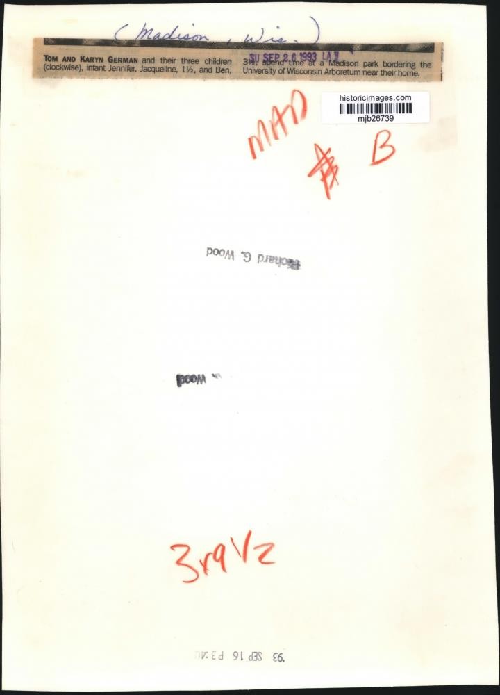 ebay template Note: Please study the images carefully to determine the condition of this vintage photograph, as it may not be in perfect condition. It may contain wrinkles, cracks, and possibly even tears due to its age and how it was handled before it got to us. A scanner may interpret colors and contrast differently than human eyes will, so it is possible that the actual photograph may be slightly darker or lighter in person. This vintage photograph is offered for sale as a collectible item and conveys no transfer of copyright. 1993 Press Photo Tom and Karyn German and Children at Madison Park in Wisconsin This is an original press photo. Tom and Karyn German and their three children (clockwise), infant Jennifer, Jacqueline, 1 1/2 , and Ben, 3 1/2, spend time at a Madison park bordering the University of Wisconsin Arboretum near their home. (Madison, Wisconsin) Photo measures 7.75 x 11.25 inches. Photo is dated 09-16-1993. PHOTO FRONT PHOTO BACK Historic Images Part Number: mjb26739 FAQs Q: Can I just download a digital version instead? A: No, we sell only vintage originals and do not make or distribute any copies, including digital ones. Q: Do you combine shipping and invoices? A: Multiple photos won on the same seller ID combine automatically through the eBay checkout process. If you encounter problems with this, send us a message via eBay messaging and we will send you an invoice. Due to eBay limitations, we cannot combine items won on our different seller IDs for a single shipping charge. Q: How quickly do you ship the items once paid? A: We ship within one business day after your payment clears. If you do not receive an "order shipped" email from us by the close of the second business day from submitting payment, please e-mail us via eBay messaging. Q: How do you make sure my photograph arrives safely? A: We package each order between two cross-corrugated pieces of cardboard to ensure that the package is as difficult to bend as possible. We then wrap each order in a plastic sheet to help protect against moisture. We want you to rest assured that we take every precaution to ensure that the photograph you receive will be in the same condition in your care as it was in ours. Q: Will the "Historic Images" watermark be on my photo when I receive it? A: No. This is a digital watermark we use to protect our images. It is not printed on the photo. Q: What are your office hours? A: eBay for us is a business, and a very fun one to be in! We are open M-F 9 to 5 (CST). Therefore, we do not return e-mails and phone calls over the weekend. We observe the following holidays: New Years Day, Memorial Day, Fourth of July, Labor Day, Thanksgiving and the day after Thanksgiving, Christmas Eve and Christmas Day. Q: Where did all these vintage photos come from? A: These original vintage photographs are from various news service and newspaper photo archives from locations around the country including: Boston, Detroit, Tampa, Chicago, Denver, Seattle, New Orleans, Milwaukee, Portland, Spokane, and more. We do not copy or reproduce any photographs -- every item is a unique vintage piece that was housed in a news archive. Q: Can I use this photograph in my book/blog/website? A: The short answer is no. There is no transfer of copyright for republication or reproduction with these photographs when you purchase them, and only photographs taken before 1923 are currently automatically in the public domain. Permission from the copyright holder, which usually can be identified from the back of each photo, must be sought to republish or reproduce the image for any purpose. Q: Do you relist items (in case I miss an auction ending)? A: Auction items that receive no bids are relisted in our store (historicimages-store on eBay) as a fixed-price item and at a higher price than the starting auction price. Q: Do you leave feedback? A: Yes, we always leave feedback for buyers. Our software monitors when our buyers leave us feedback, then notifies us that we can leave feedback for the buyer. Rest assured, if you leave feedback, we will do the same! Check out our family of eBay IDs: historicimages01 Sports Photos historicimages02 Entertainment Photos historicimages03 Americana Photos historicimages04 International & War Photos historicimages05 Transportation Photos historicimages06 Photos of All Subjects historicimages07 Entertainment Photos historicimages08 Newsworthy Photos historicimages09 Entertainment Photos historicimages10 Sports Photos historicimages-store Our largest fixed-price selection historicimages-gallery Hand-picked photos Saturday night auctions About Us Historic Images was formed in September 2009, with a handful of scanners working out of a basement to digitize newspaper photo archives. We have since moved out of the basement, and we can now archive thousands of photos per day. Our company has worked with magazines and newspapers from Detroit, Boston, Denver, Seattle, Tampa, Chicago, and New Orleans, just to name a few. We are constantly adding to our inventory, and have assembled an archive of millions of photos to date. As our company evolved, we began our eBay business, which brings thousands of fresh auctions per week to the world's largest online auction marketplace. Our custom software systems and team of great employees allow us to efficiently scan and sell large photo archives online. At the very core of our company's DNA is a strong commitment to customer satisfaction and strict integrity for our product. Our promise to you is that we will do everything in our power to provide you a great buying experience. Copyright 2009 - Present, Historic Images, Inc. Sell Smarter with Kyozou. Inventory and Ecommerce Management