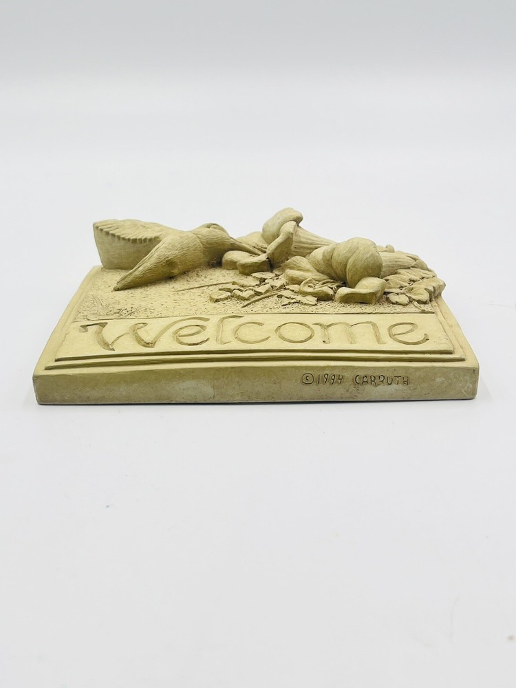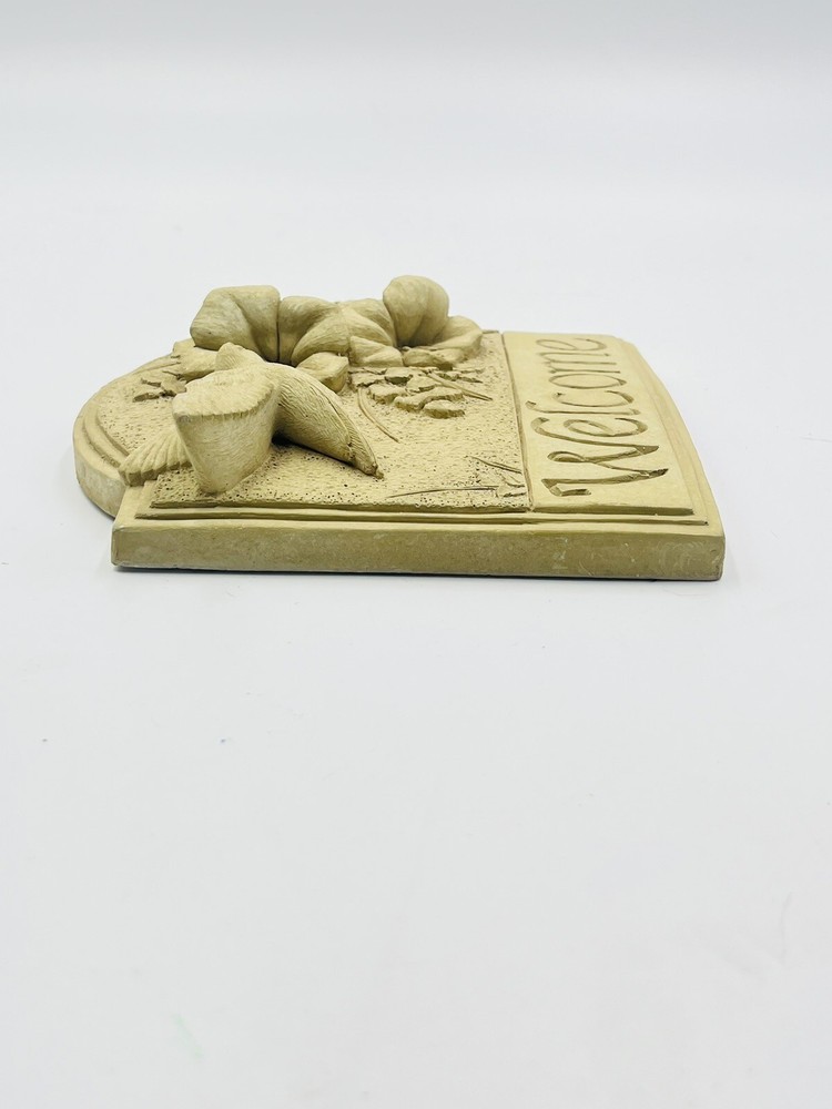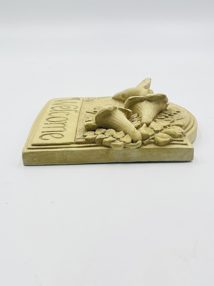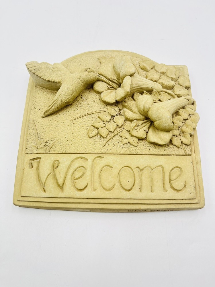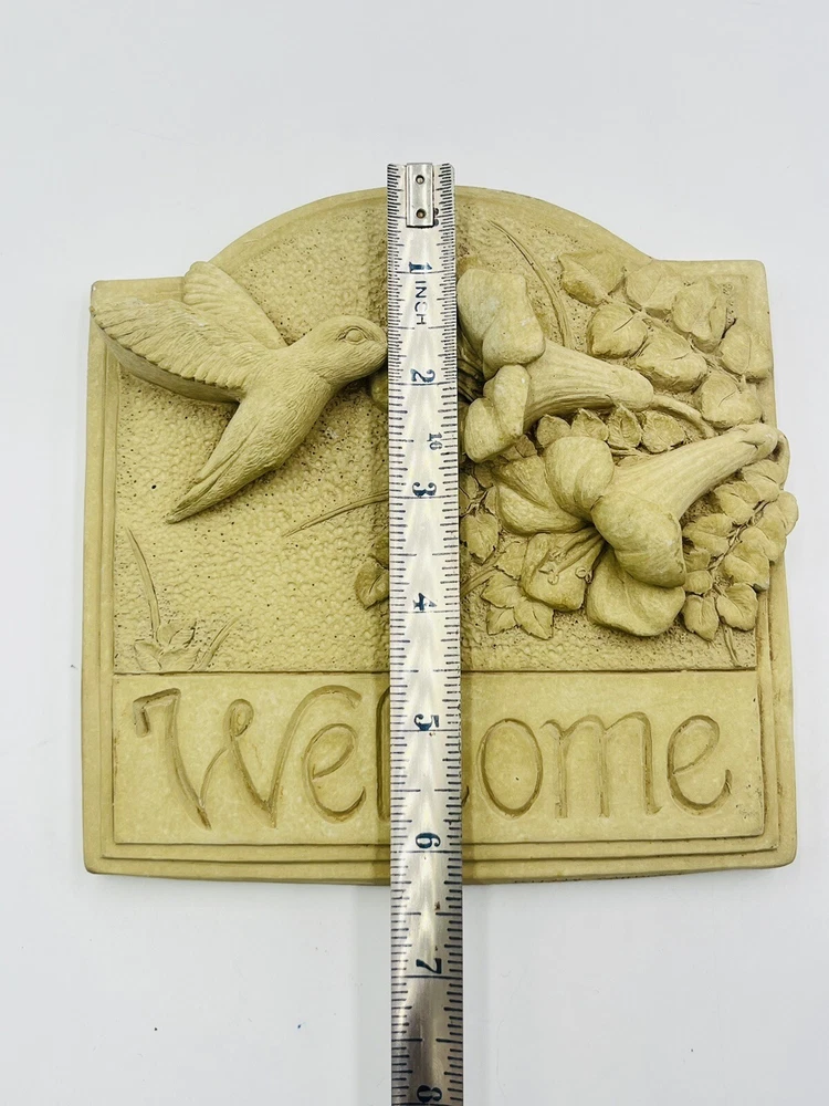 This beautiful hummingbird welcome sign from Carruth Studio is perfect for any occasion and adds a modern touch to your porch or balcony. The square-shaped plaque is made of durable cement material and can be used both indoors and outdoors. Measuring 6 inches in height and 6.5 inches in width, this medium-sized sign features a stunning hummingbird pattern as its subject. It comes with a "Welcome" theme and is ideal for all occasions. This plaque is a perfect addition to your home décor and will make a great gift as well. Small Chip in Hummingbird Wing