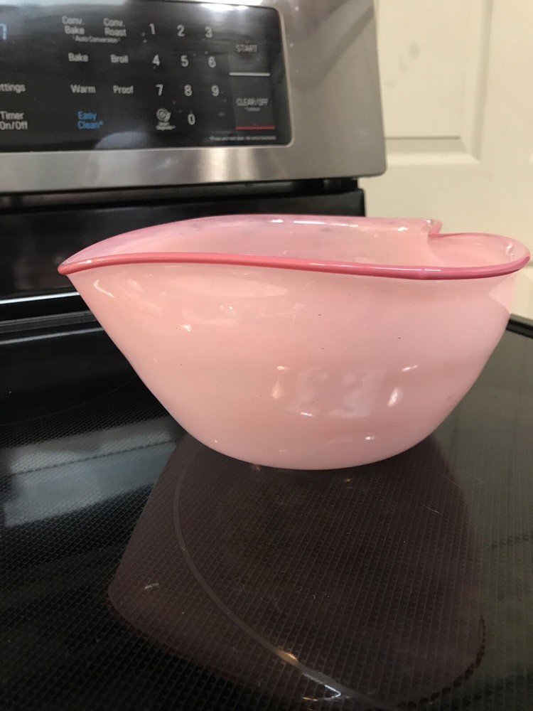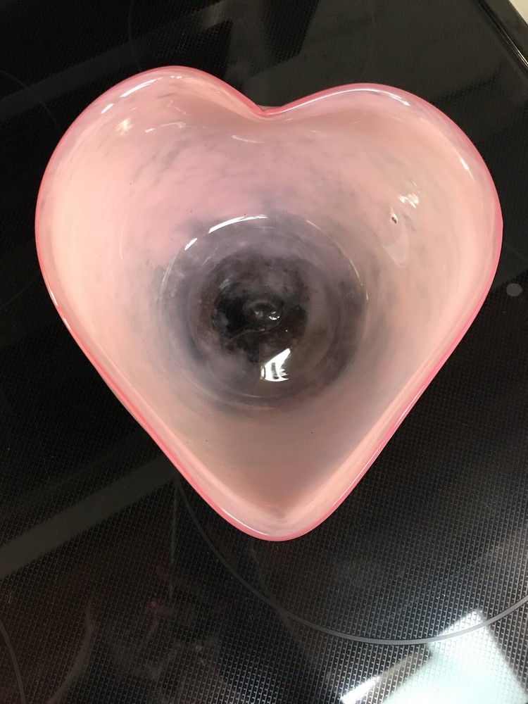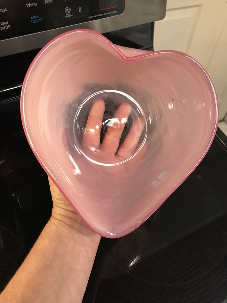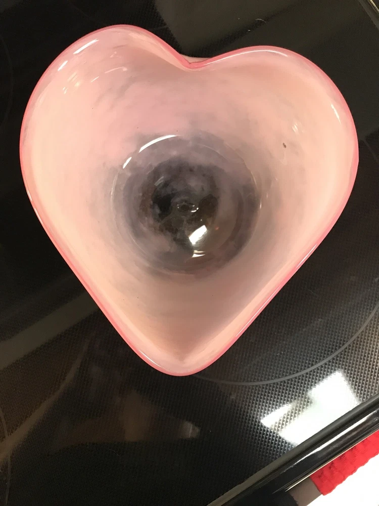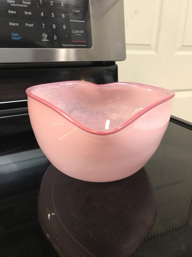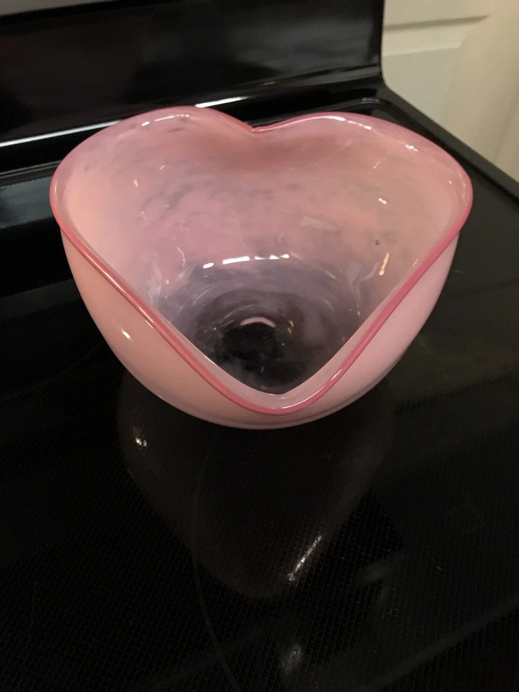 Gorgeous Signed John Burchetta 1994 Pink heart shaped Studio Art Glass Bowl 7.5” x 7” and 4” H signed on bottom has pontil mark. Glass is a light pink with darker pink rim. No chips or nicks. Some minor scratches on bottom. Really good shape for its age. Beautiful bowl. Reasonable offers will be considered. Shipped with USPS Priority Mail.