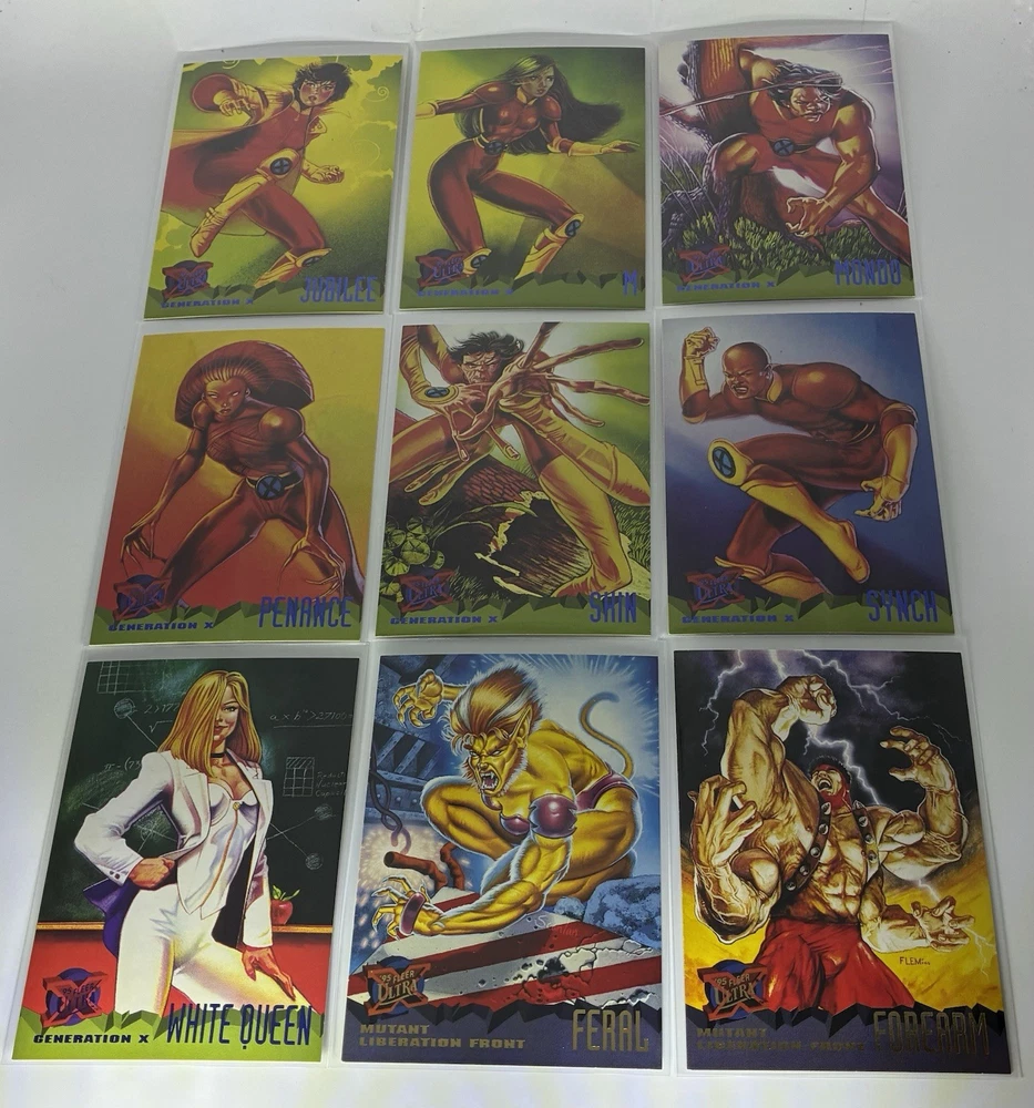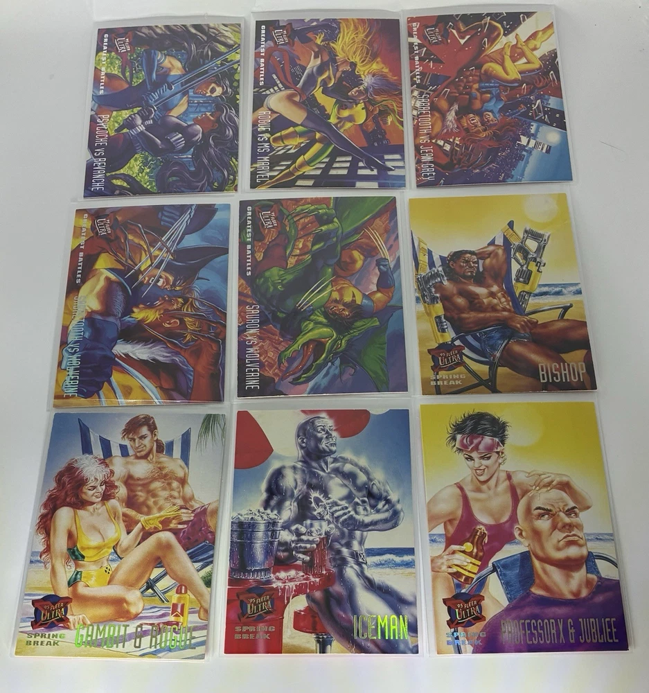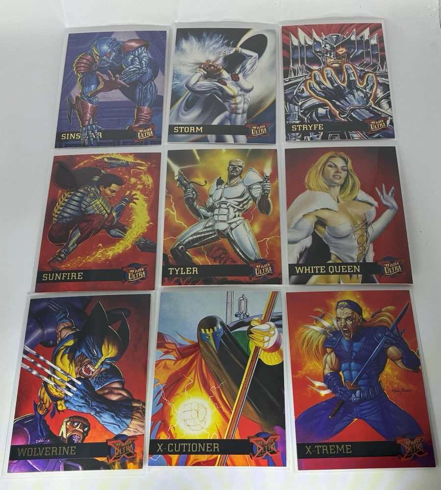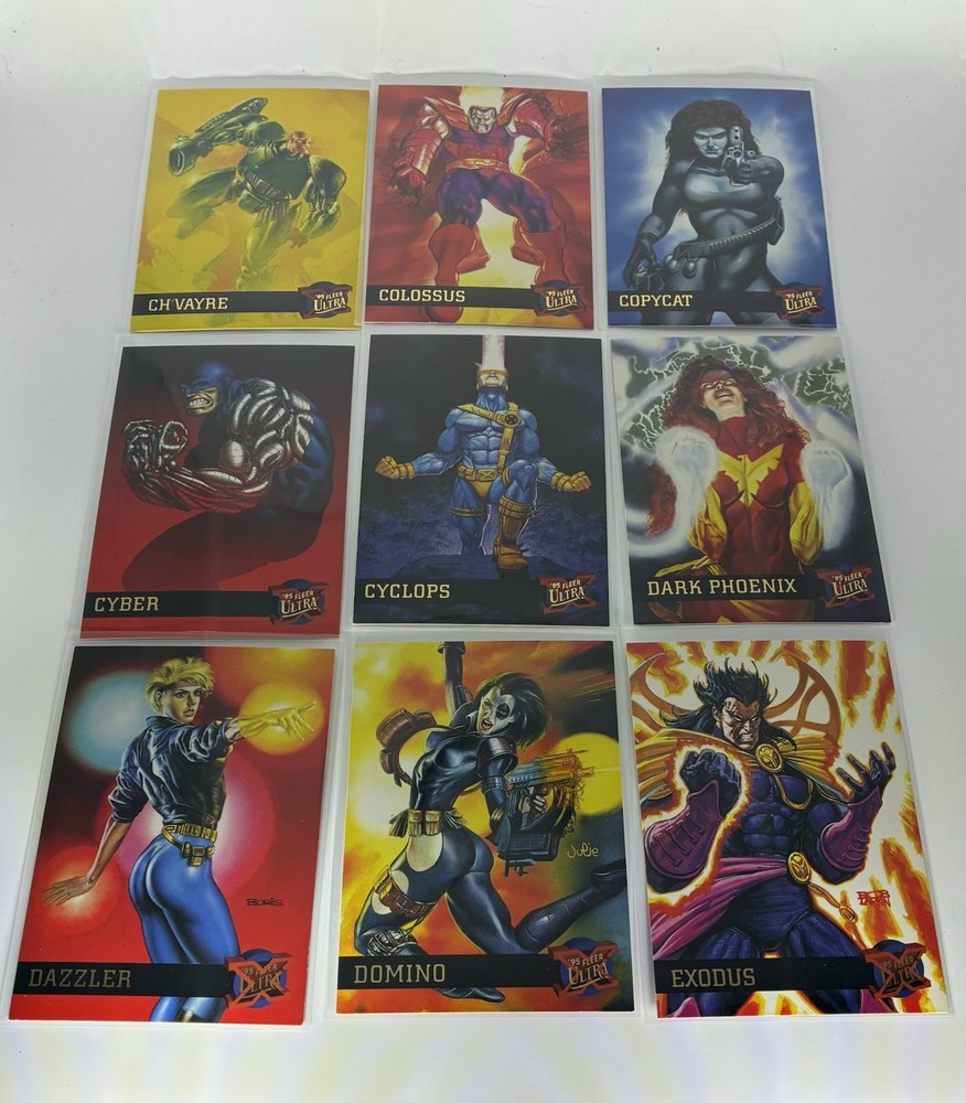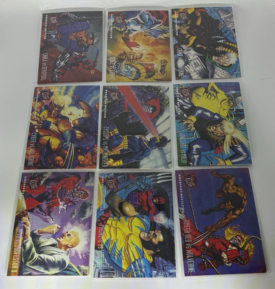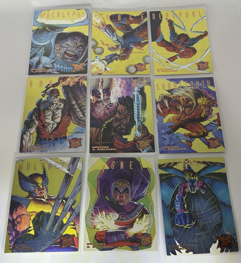 The 1995 Fleer Ultra X-Men complete base set includes 150 standard-sized cards featuring characters such as Wolverine from the X-Men franchise. Spring Break collection and checklist are included. Manufactured by Fleer in the United States, these original non-sport trading cards are made of card stock. The set also includes all 9 Gold Hunter Stalker inserts. A must have for fans of the X-Men movies and 90’s TV show. Set is in individual sleeves and in a card box. Set will ship wrapped in bubble wrap and packing paper inside a shipping box.