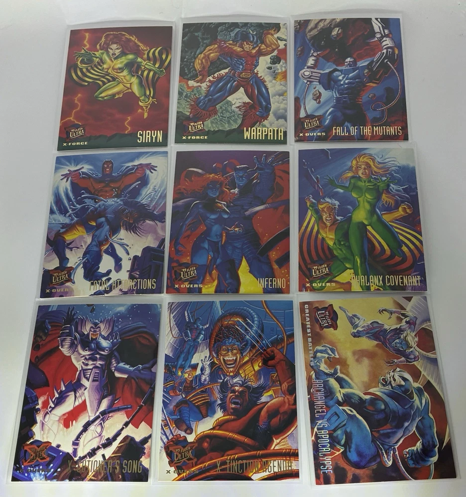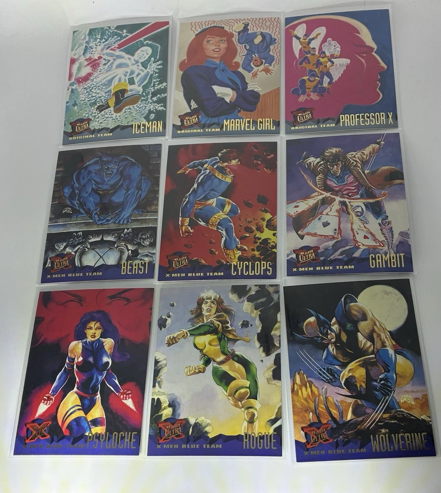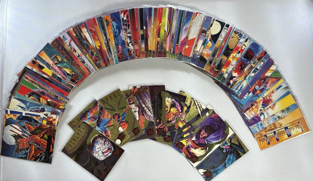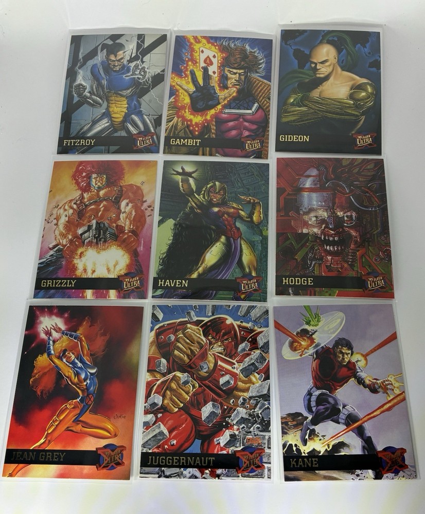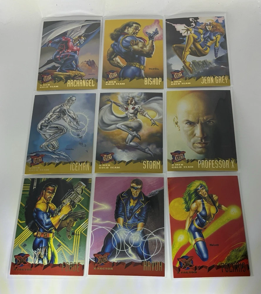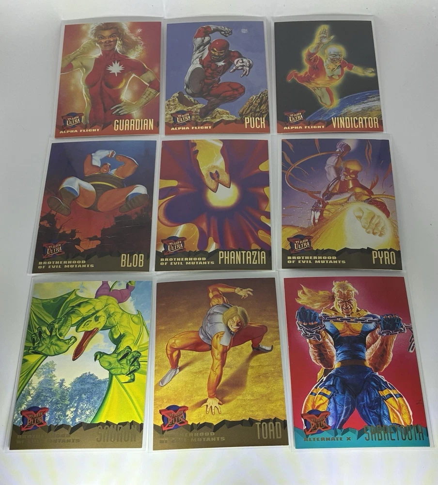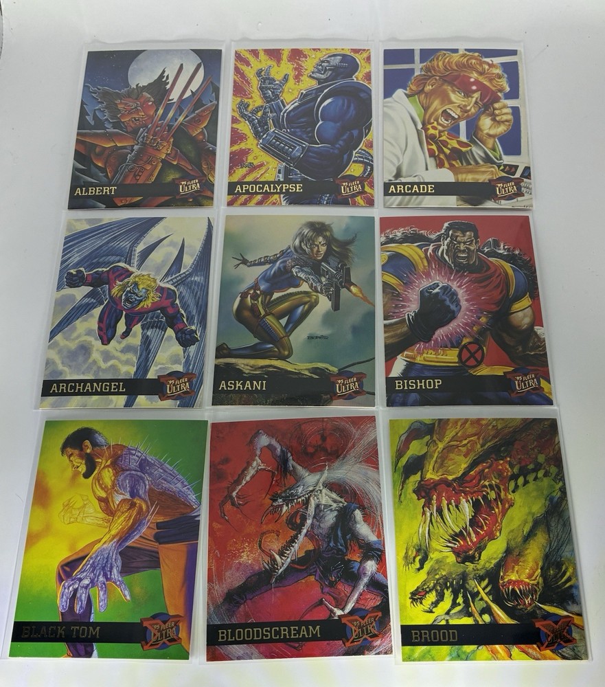 The 1995 Fleer Ultra X-Men complete base set includes 150 standard-sized cards featuring characters such as Wolverine from the X-Men franchise. Spring Break collection and checklist are included. Manufactured by Fleer in the United States, these original non-sport trading cards are made of card stock. The set also includes all 9 Gold Hunter Stalker inserts. A must have for fans of the X-Men movies and 90’s TV show. Set is in individual sleeves and in a card box. Set will ship wrapped in bubble wrap and packing paper inside a shipping box.