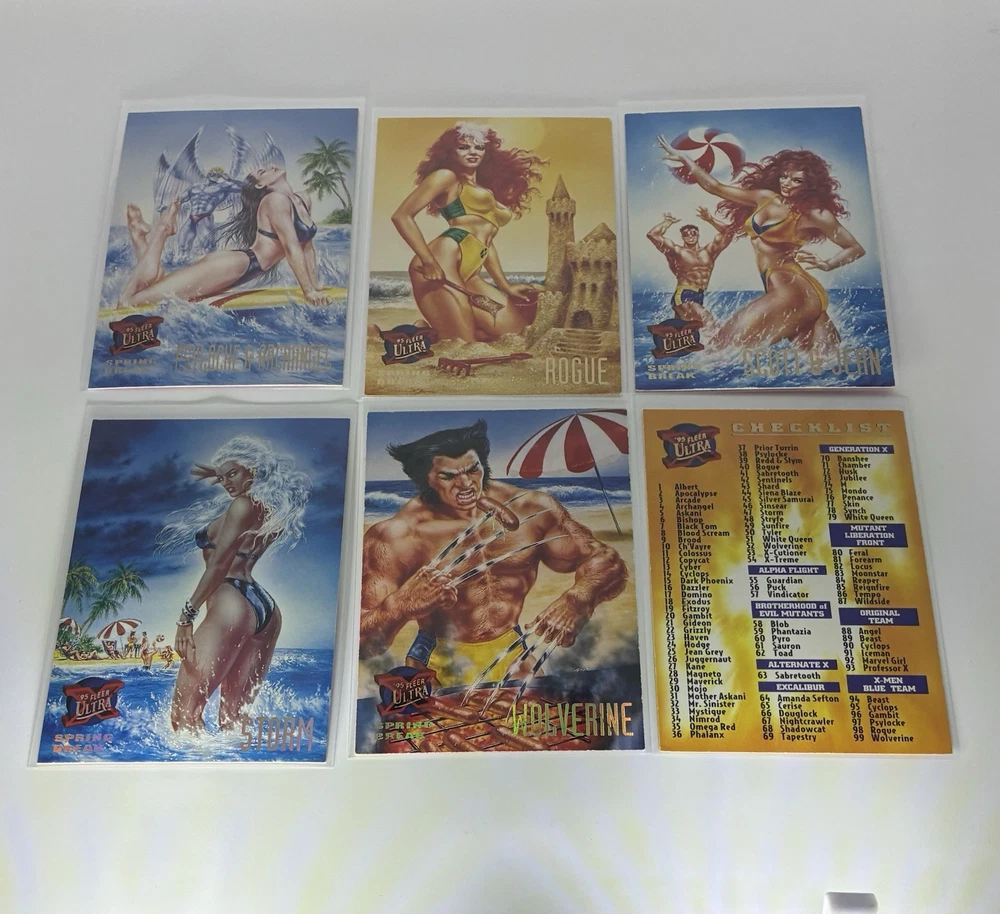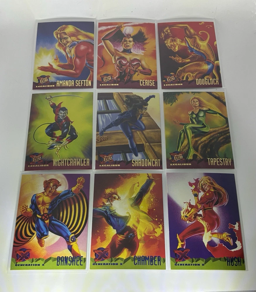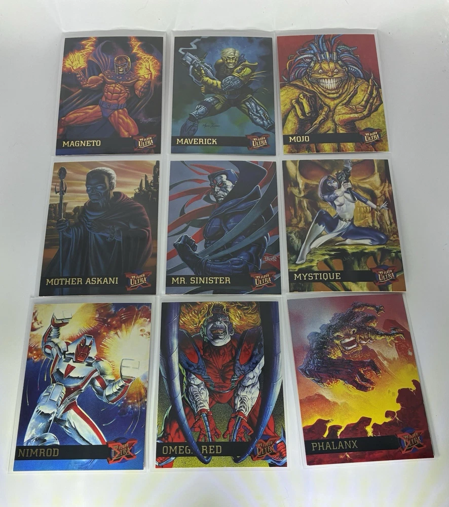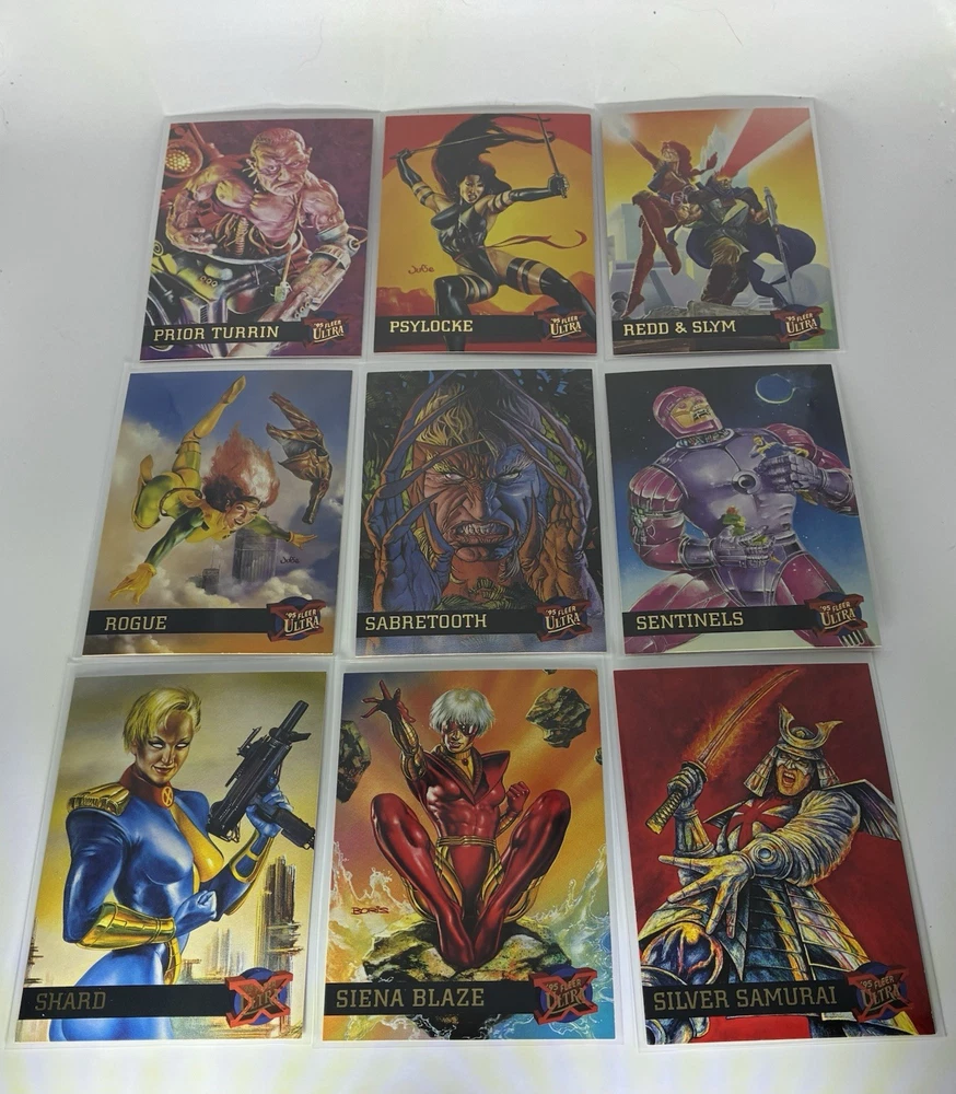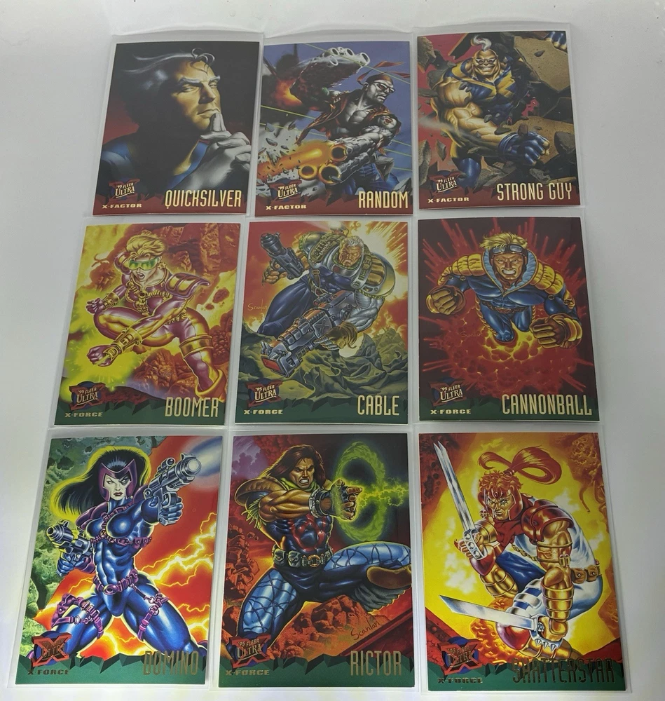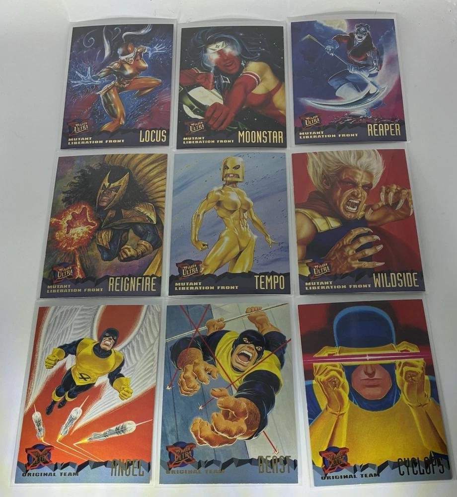 The 1995 Fleer Ultra X-Men complete base set includes 150 standard-sized cards featuring characters such as Wolverine from the X-Men franchise. Spring Break collection and checklist are included. Manufactured by Fleer in the United States, these original non-sport trading cards are made of card stock. The set also includes all 9 Gold Hunter Stalker inserts. A must have for fans of the X-Men movies and 90’s TV show. Set is in individual sleeves and in a card box. Set will ship wrapped in bubble wrap and packing paper inside a shipping box.