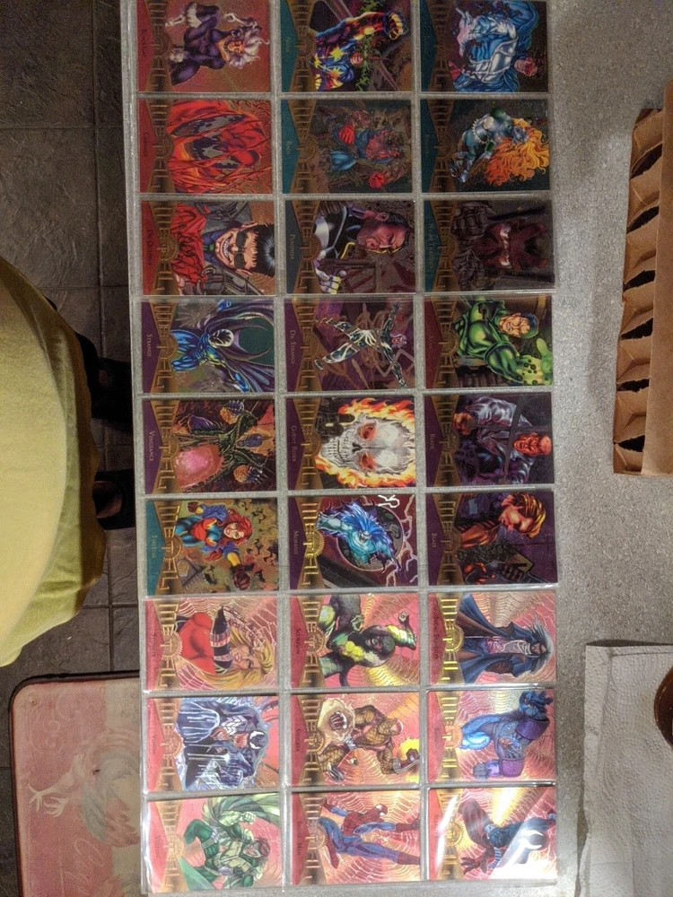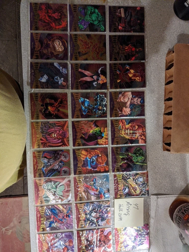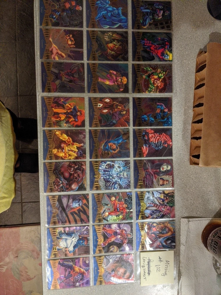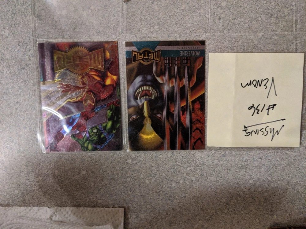 This 1995 Marvel Metal Fleer Base Set (ONLY HAS 136 not 138) Cards w/Checklist is a must-have for any Marvel (MCU) fan. The set includes cards featuring popular characters such as Deadpool, Iron Man, Spider-Man, Captain America, Wolverine, Daredevil, Thanos, and Doctor Doom. ***MISSING ARE #47 HULK 2099 and #102 LONGSHOT and #136 Venom*** The cards are made of metal and are in standard size. The cards are original and comes with a checklist. It is a non-sport trading card and was manufactured in the United States by Fleer. The set features the Marvel franchise and is vintage. It is perfect for collectors who are looking for a rare and valuable addition to their collection.