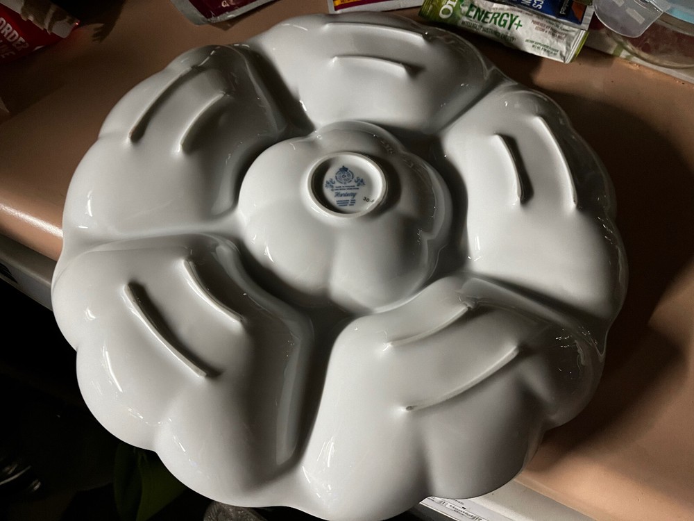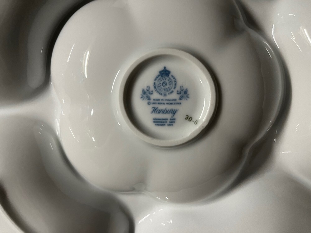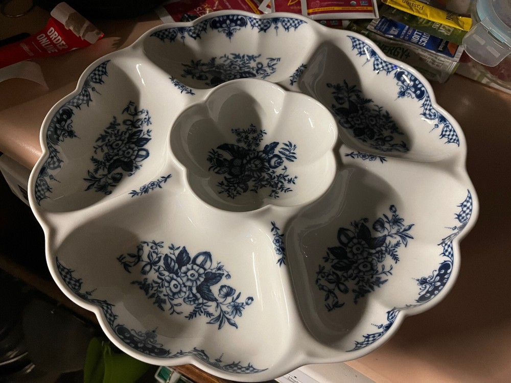 This is a S*T*U*N*N*I*N*G, 6-Section Chip & Dip or Vegetable Dip Platter from the Royal Worcester Company. The pattern is called Hanbury which features butterflies and blue florals and scrolls. Crafted in England and made of fine porcelain, this platter is both microwave and dishwasher safe. The platter measures 13.5 inches in diameter. The piece is in excellent, vintage condition. This piece comes from my own personal collection.
