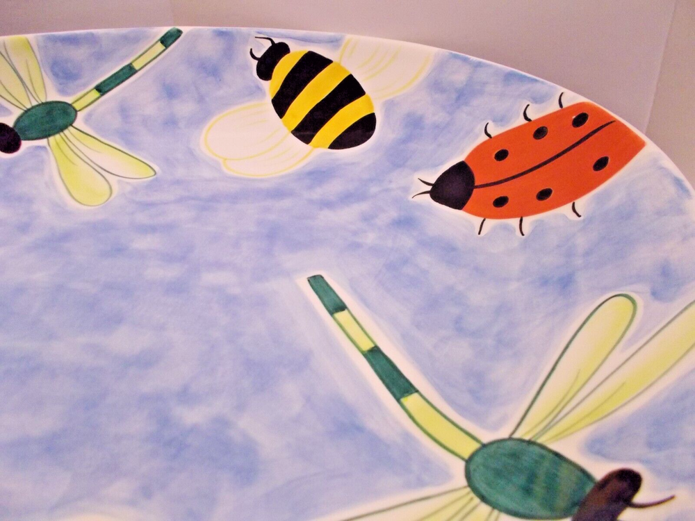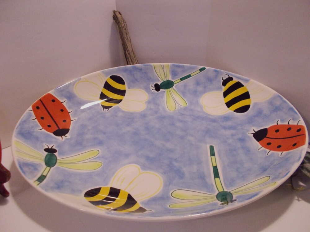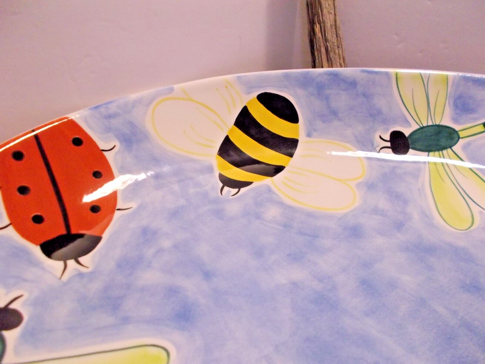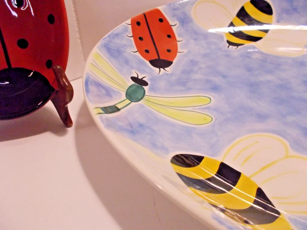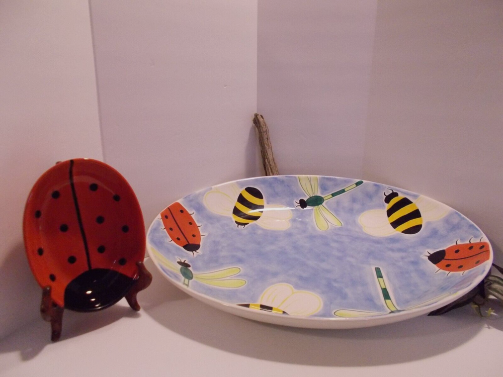 1999 Clay Art South San Franscisco BUMBLES 2 Piece Chip & Dip Platter Set 17.5" A wonderful bowl with ladybugs, bubble bees and dragon flies along with a small ladybug bowl for dip, dressings or salsas. This set would make a fantastic vegetable tray for summer parties. This bowl is large, measuring 18" x 14" x 2-1/2". The small ladybug bowl measures 6-1/2" x 5" x 1-1/2". Both are in great pre-owned condition, no chips or cracks.