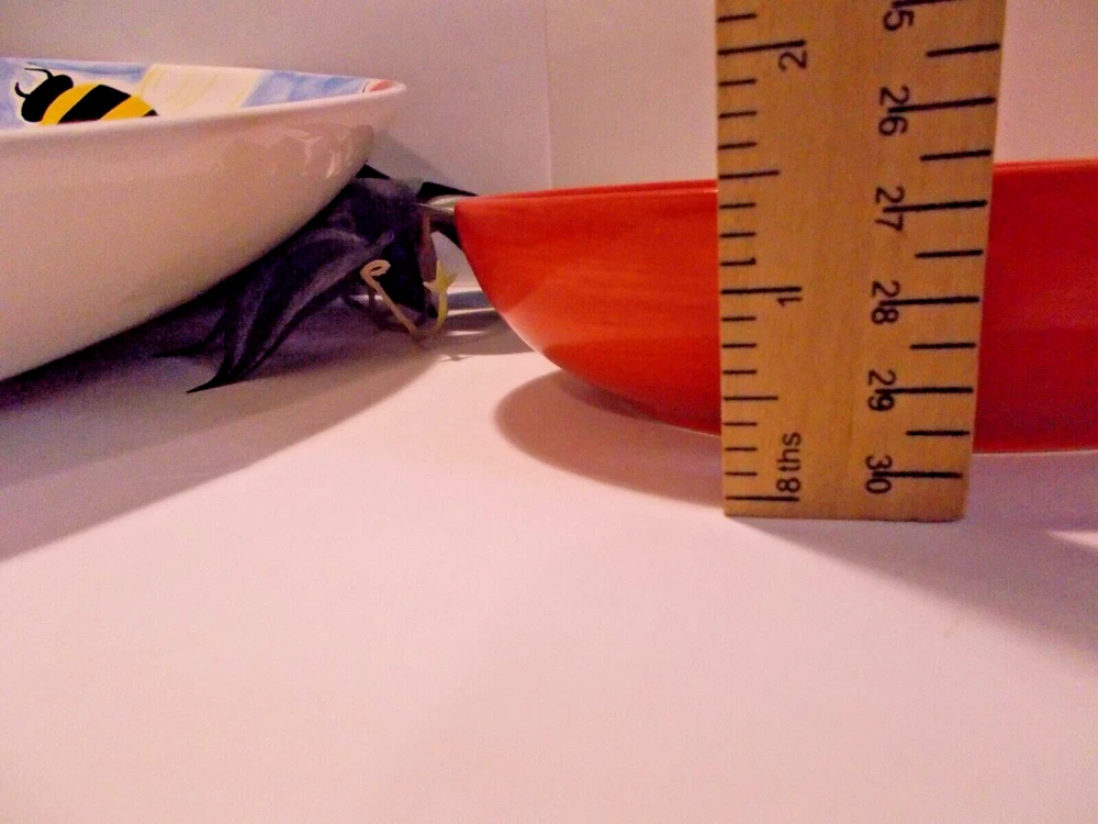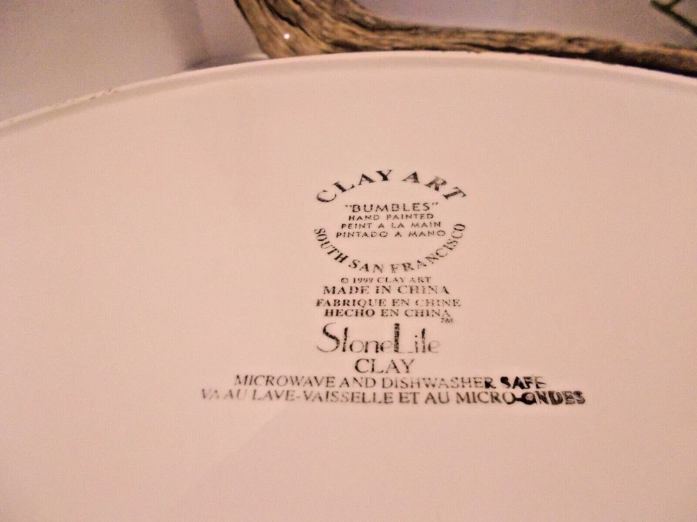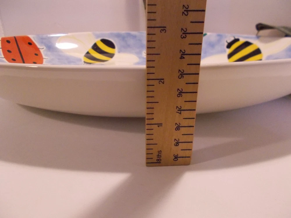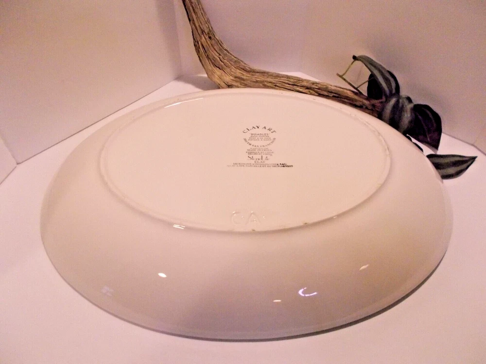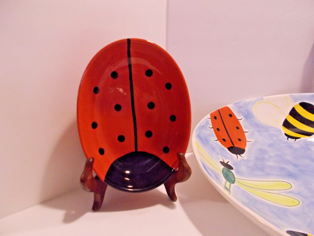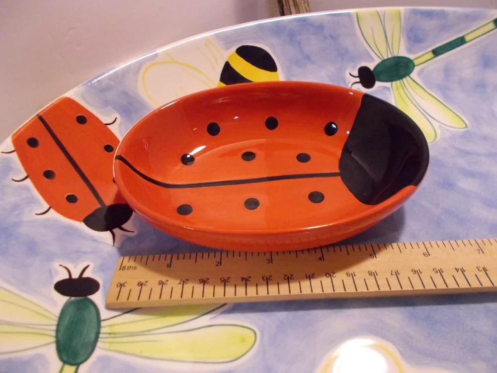 1999 Clay Art South San Franscisco BUMBLES 2 Piece Chip & Dip Platter Set 17.5" A wonderful bowl with ladybugs, bubble bees and dragon flies along with a small ladybug bowl for dip, dressings or salsas. This set would make a fantastic vegetable tray for summer parties. This bowl is large, measuring 18" x 14" x 2-1/2". The small ladybug bowl measures 6-1/2" x 5" x 1-1/2". Both are in great pre-owned condition, no chips or cracks.