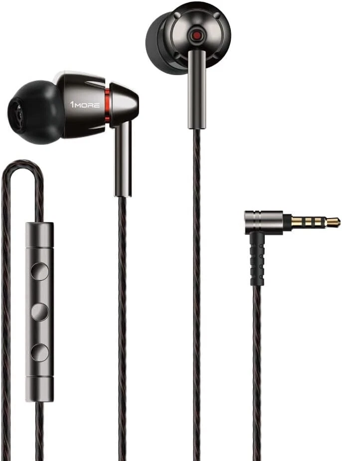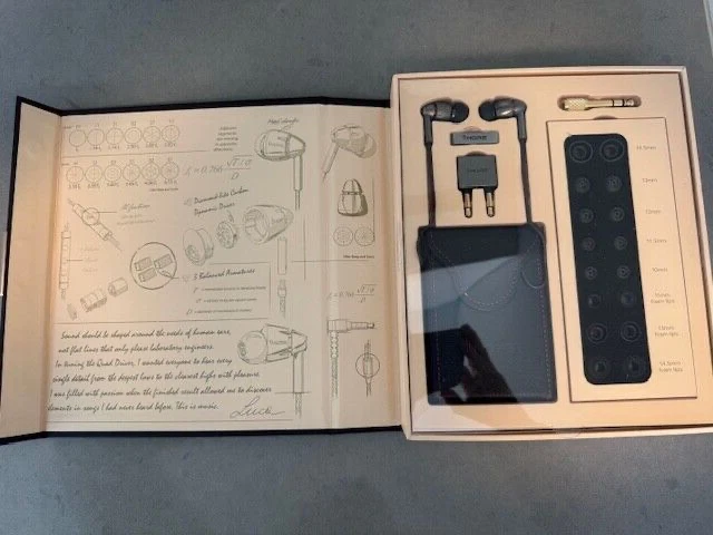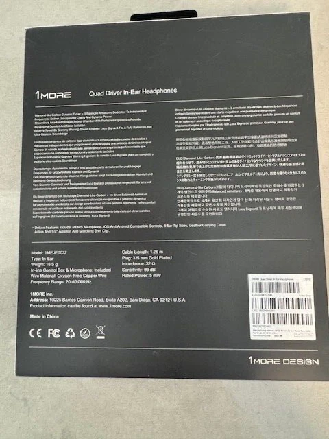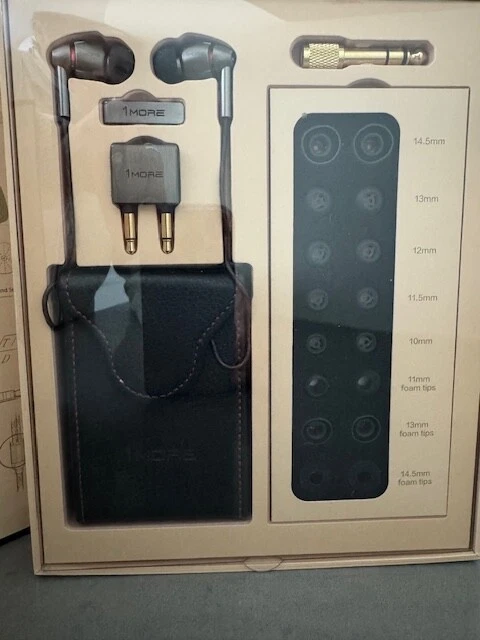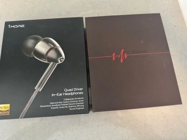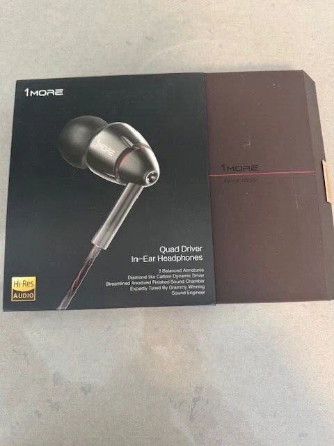1MORE Quad Driver in-Ear Earphones Hi-Res High Fidelity Headphones Warm Bass 3 Balanced Armatures Diamond-like Carbon Dynamic Driver Streamlined anodized Finished Sound Chamber Expertly Tuned by Grammy Winning Sound Engineer Spacious Reproduction High Resolution Mic in-Line Remote Smartphones, PC, Tablet Silver Gray32 Ohm About this item 1MORE Quad Driver In-Ear Headphones: Engineered with a diamond-like carbon dynamic driver and three balanced armatures for exceptional sound quality and dynamic power. Wired Connectivity: Features a 3.5mm aux input and in-line controls for adjusting volume, skipping tracks, and taking calls with the built-in microphone. Premium Design and Accessories: Streamlined aluminum sound chamber with ergonomic fit, accompanied by a faux leather case, multiple ear tip options, and a 3.5mm to Type-C adapter. * * Used a few times. Given a wireless set so packing up this "like new" 1MORE for sale.